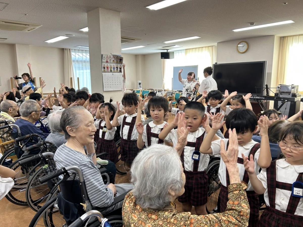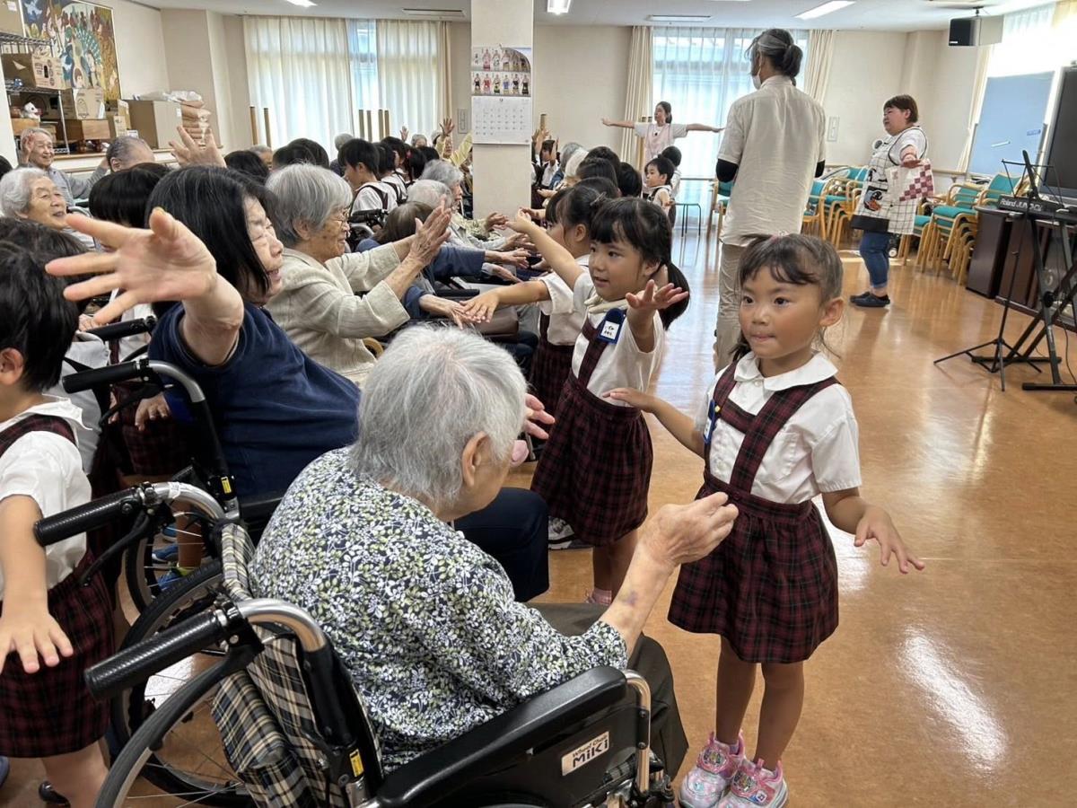 午前中は月刊誌を見たり、絵に色付けを進めたりしていきました。午後はお隣のはなまるハウスにお歌を披露しに行ってきました。ちょっぴり緊張気味の表情でしたが、楽しそうに一緒に手遊びをしていました。園に戻り、久しぶりのプールで遊びました。園長先生が一緒に遊んでくださり、テンション上がりまくりのあお組さんでした。