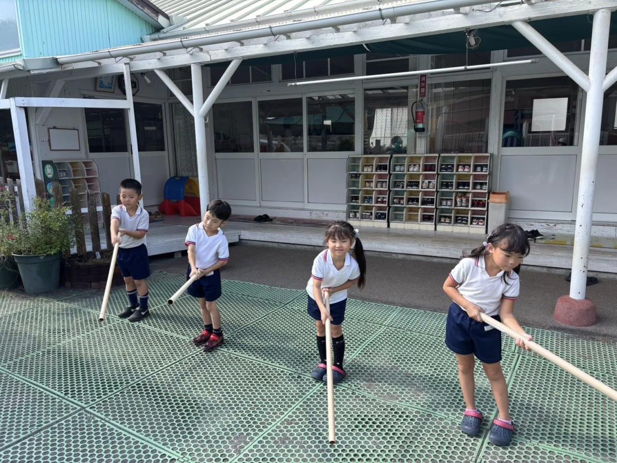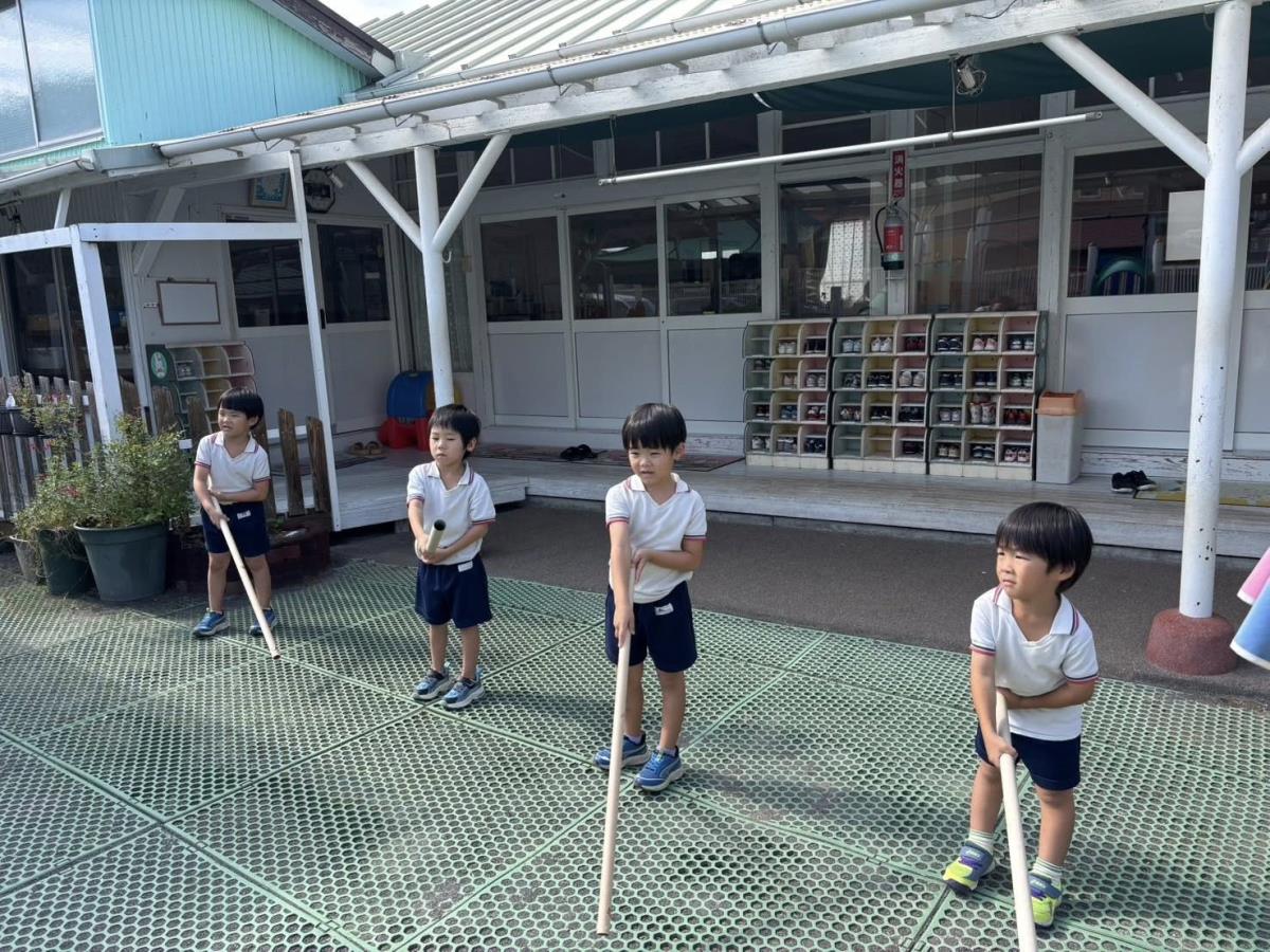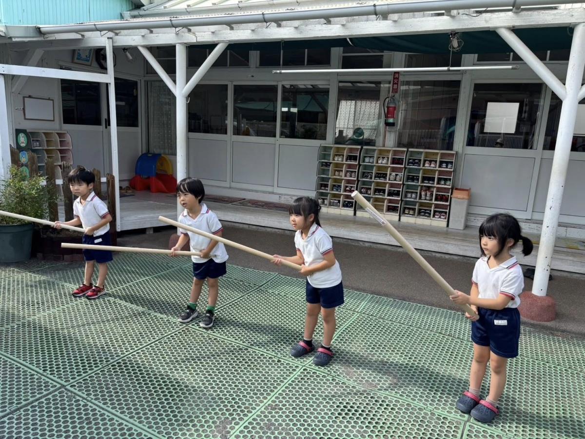 午前中はあお組最後のリトミックがありました。あか組さんの時からずっとみえ先生に教えてもらってきました。毎回楽しみだったリトミック、今回も、最初から最後までニコニコ楽しそうでした。午後は、フラッグの練習をしました。持ち方、立ち方、振り方など覚えて取り組みました。