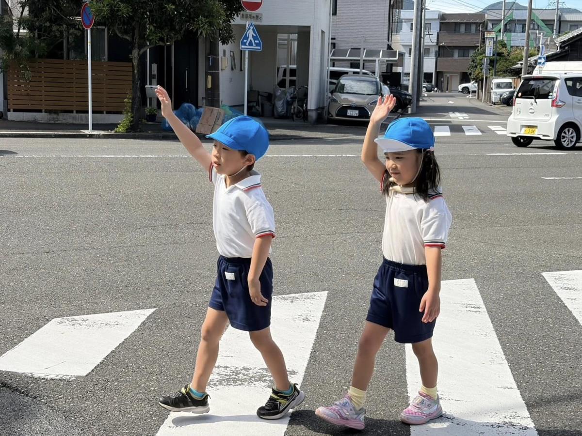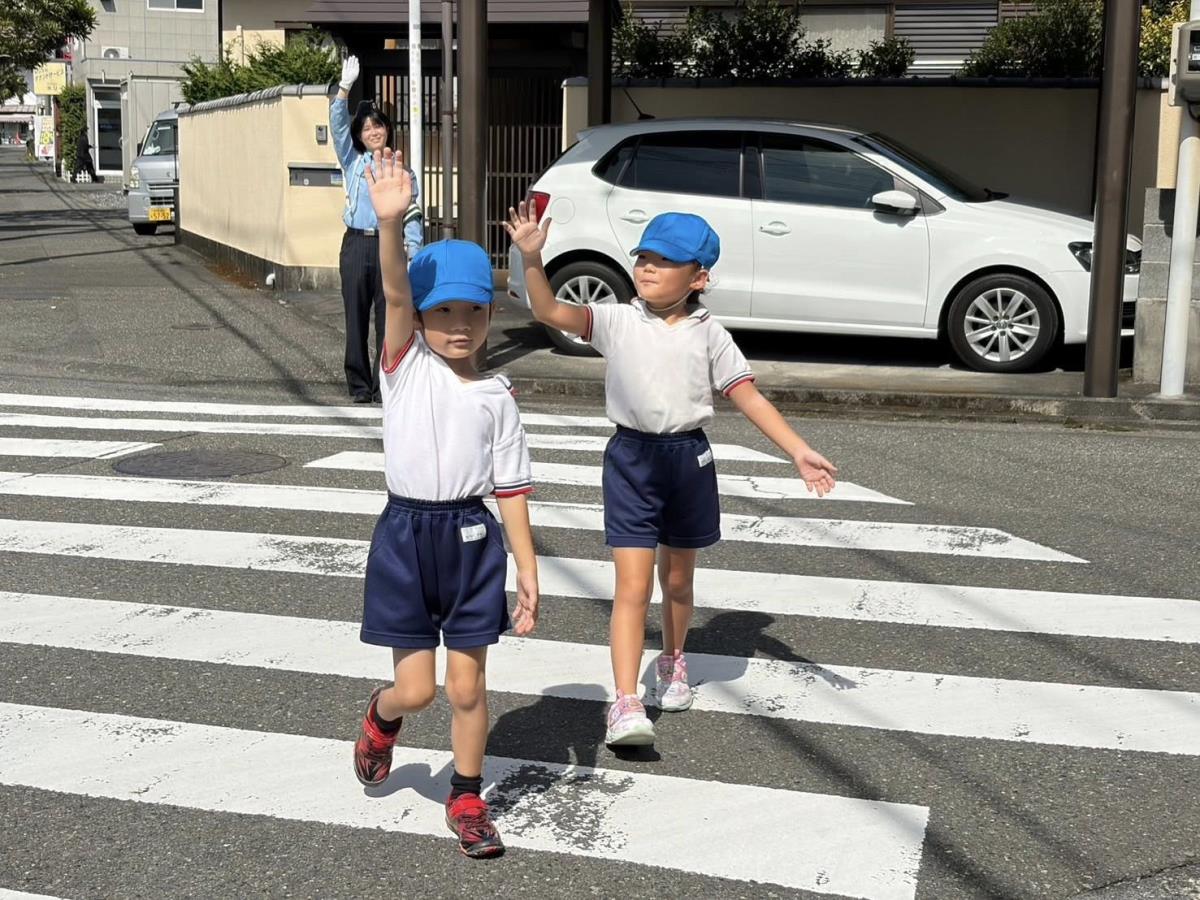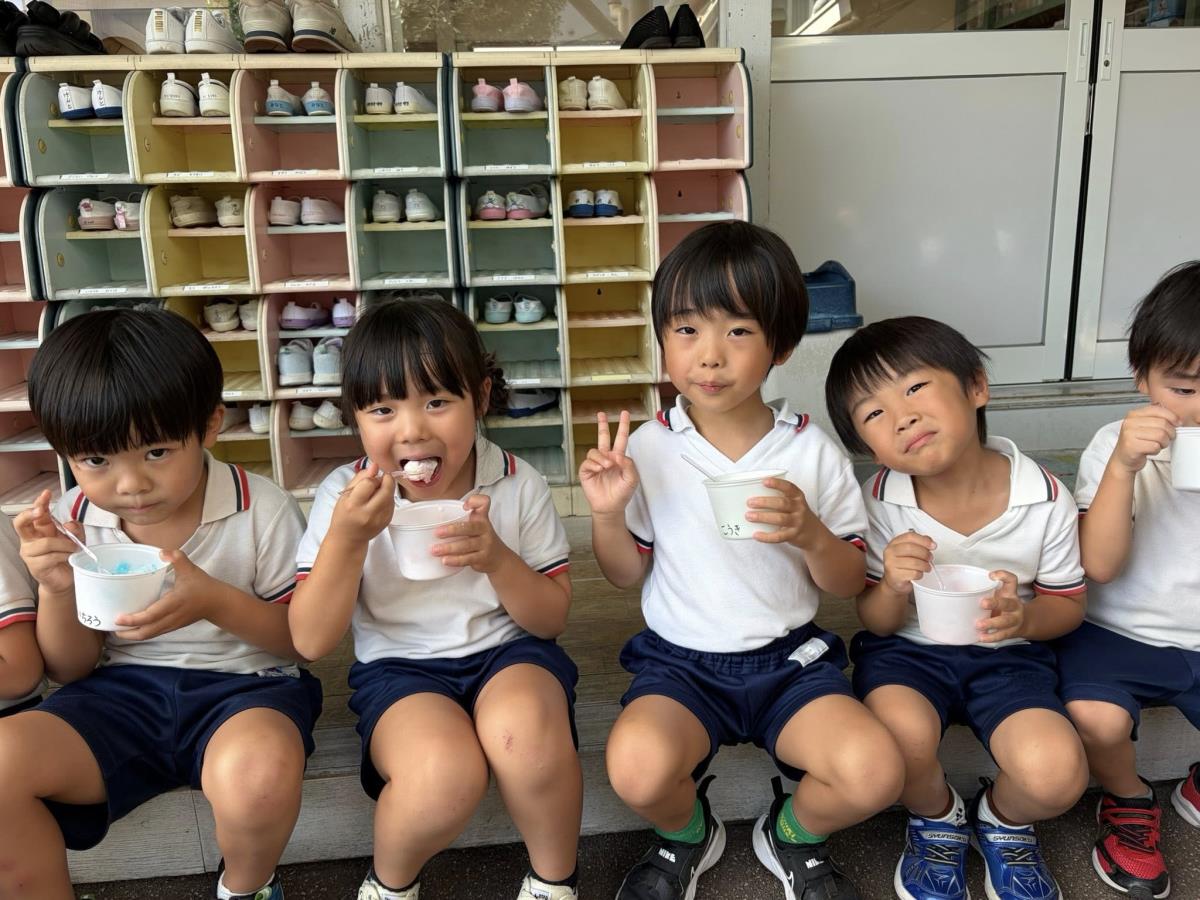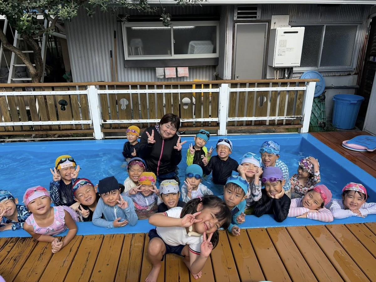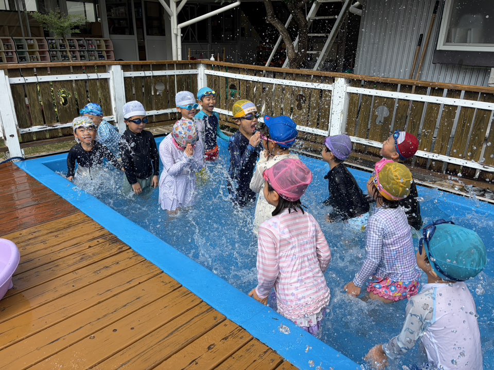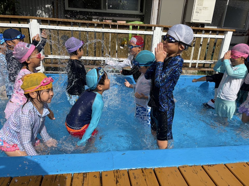 午前中は交通安全教室がありました。指導員さんのお話しを聞いた後、実際に園外の道を歩く練習をしました。きいさんの頃とは違い、少し長い距離を歩いて練習しました。午後はプールに入りました。お水が冷たかったですが、冷たさを感じさせないくらい、楽しそうに遊んでいました。ビート板を使わずに蹴伸びが出来るようになったり、ビート板でばた足が出来るようになったり、、、。出来ることがたくさん増えました。プール遊び、とーっても楽しかったね♪おやつのあとはプール納めの会がありました。