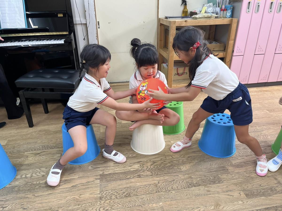 リトミックに参加しました。ピアノの音に合わせて止まる時、かっこいいポーズや面白いポーズでピタッと止まり止まっているお友だちも見ているお友だちも楽しそうです。午後は制作を進めてから園庭で遊びました。