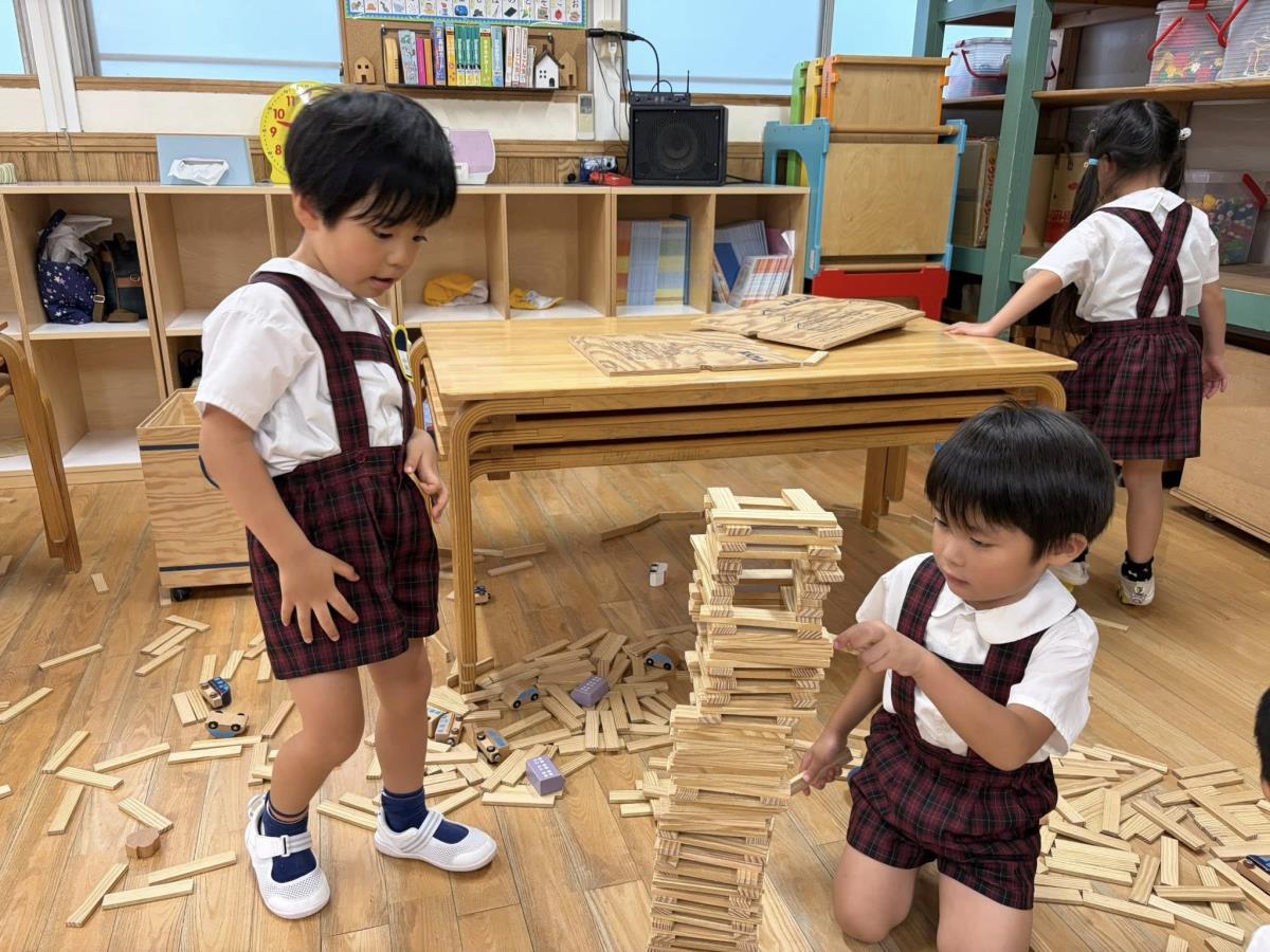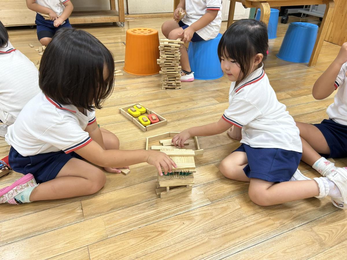 今日は「Bブロックで遊びたい!」のリクエストが多かったので、Bブロックやメモリーなどで遊びました。大きなプールを作りみんなで入ったり、黙々と車やステッキなどを作ったり、遊び方は様々ですがどの子も楽しんでいました。順番に月の制作をしました。午後は園庭で遊びました☆