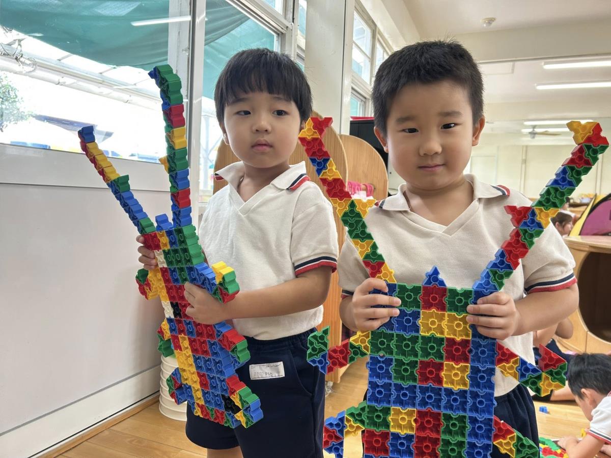 今日は月の制作で、セミの折り紙を折りました。段折りのところで少し苦戦した様子もありましたが、お友だち同士で教え合いながら完成させていました!午後はお部屋でブロックやメモリーをして過ごしました☆