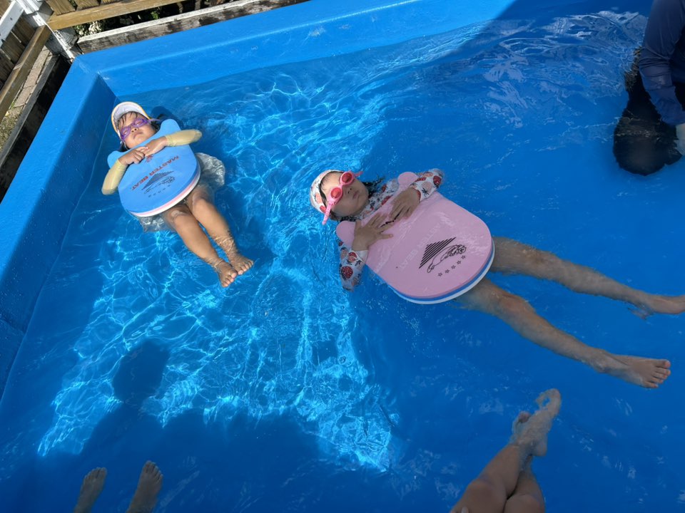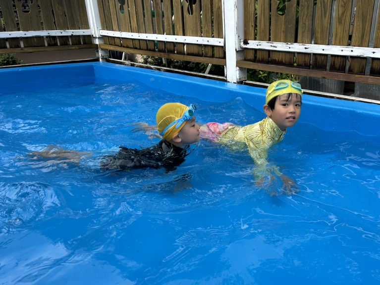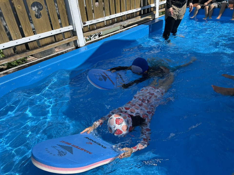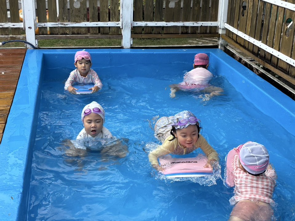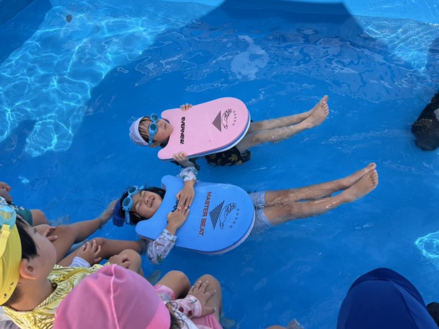 午前はプールで遊びました。ゴーグルを使って顔をつられるお友だちが多く、「5秒できた!」と嬉しそうに教えてくれました。ビート板を使って身体のちからを抜き、先生に引っ張ってもらうと「きもちいー!」と楽しそうでした!午後はキッズバンで遊びました☆