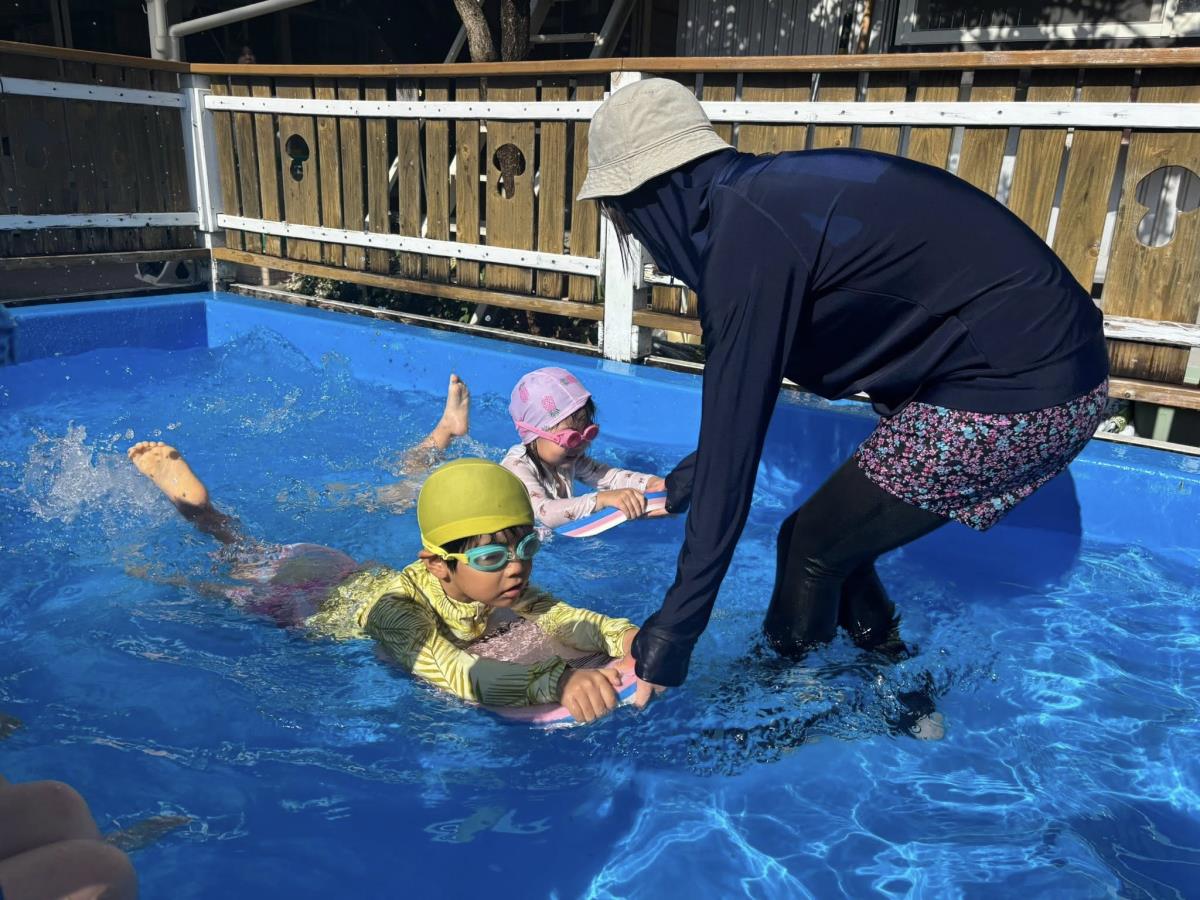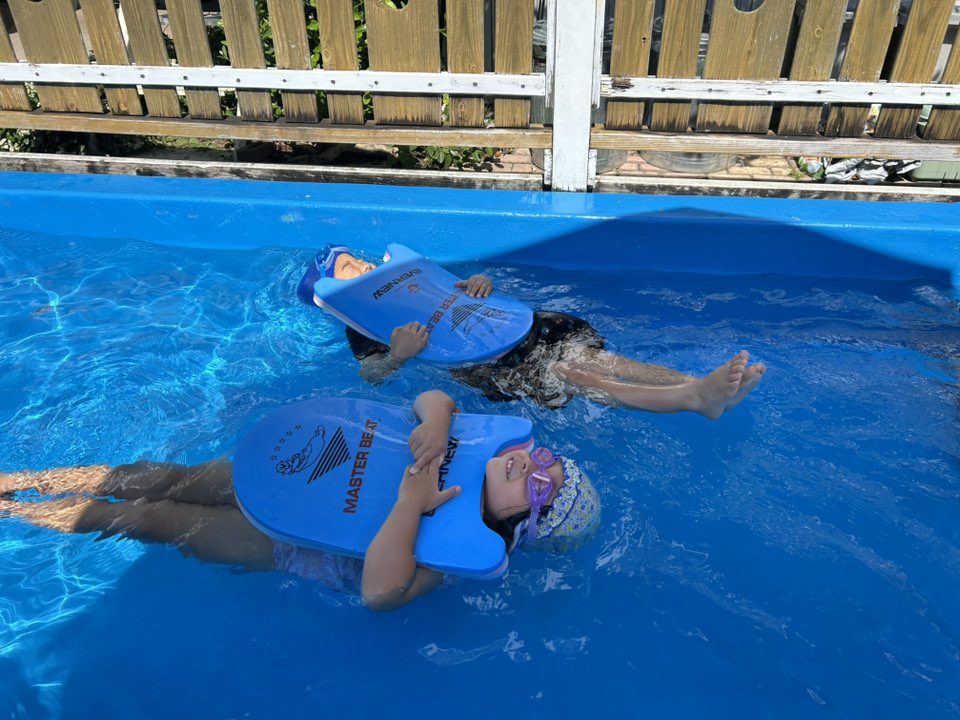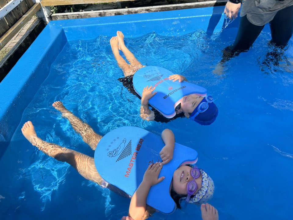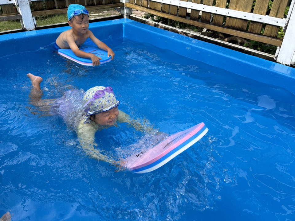 午前はプールで遊びました。ゴーグルを使って顔をつられるお友だちが多く、「5秒できた!」と嬉しそうに教えてくれました。ビート板を使って身体のちからを抜き、先生に引っ張ってもらうと「きもちいー!」と楽しそうでした!午後はキッズバンで遊びました☆