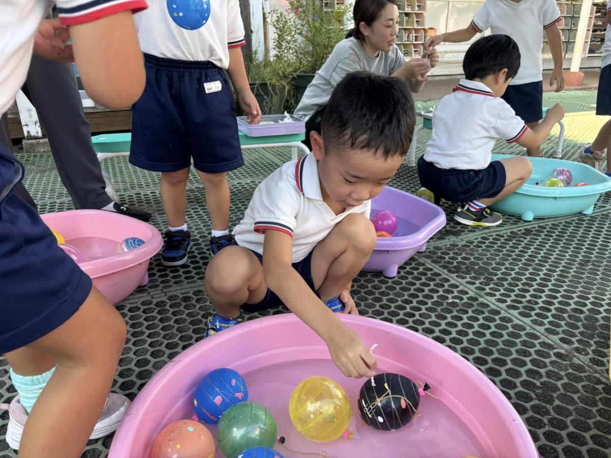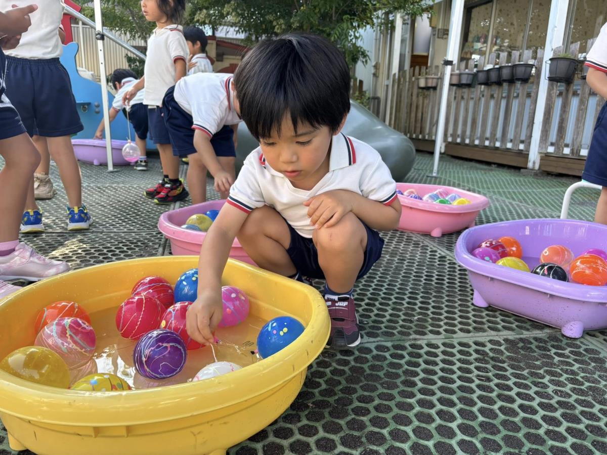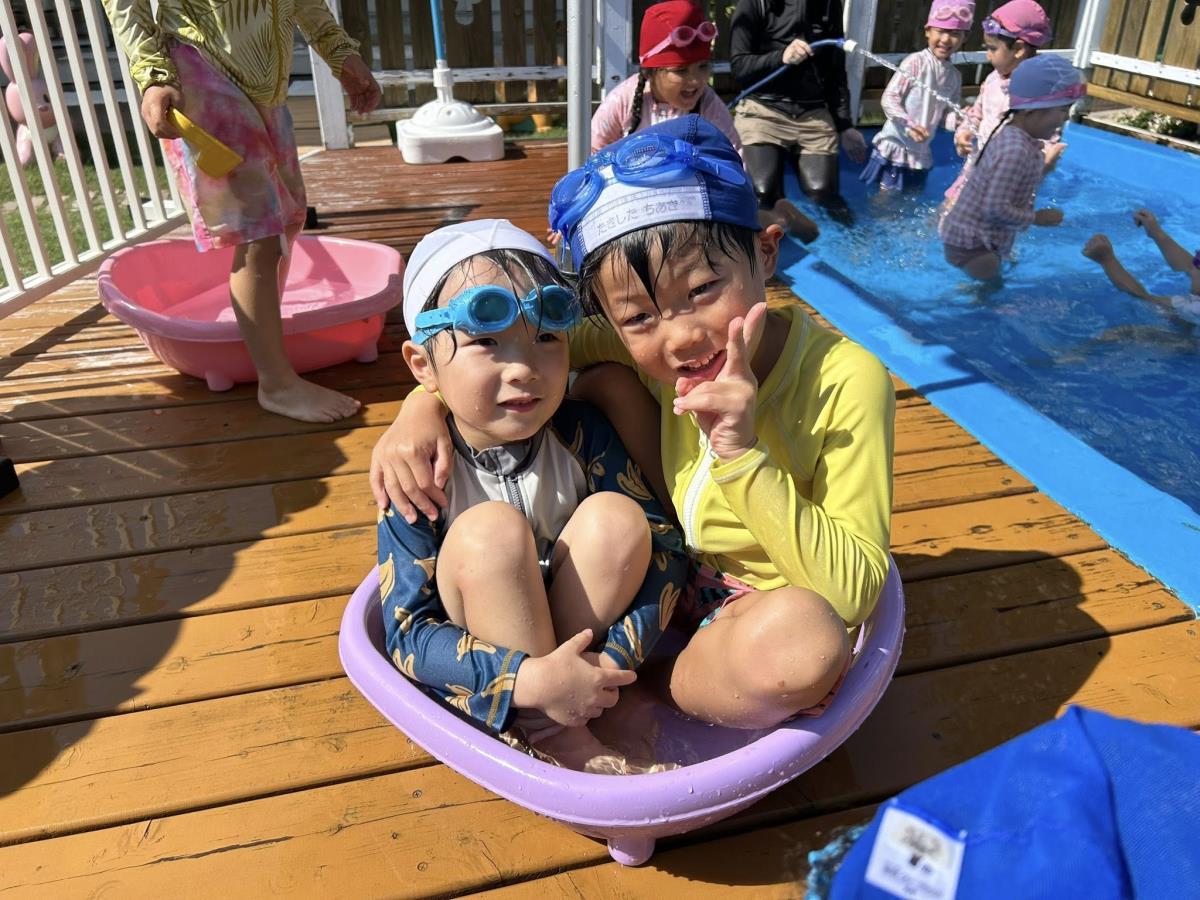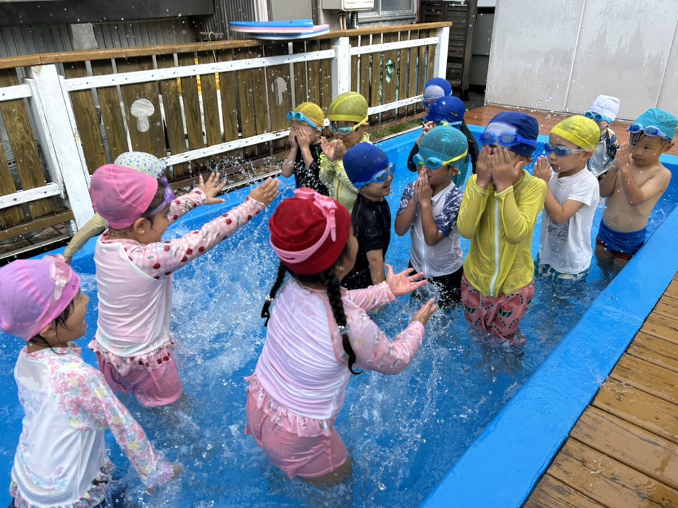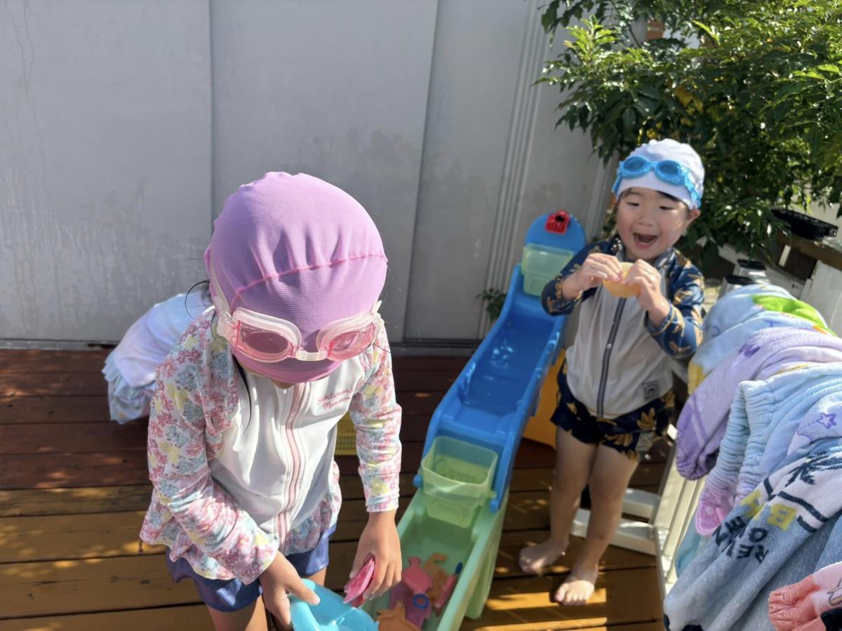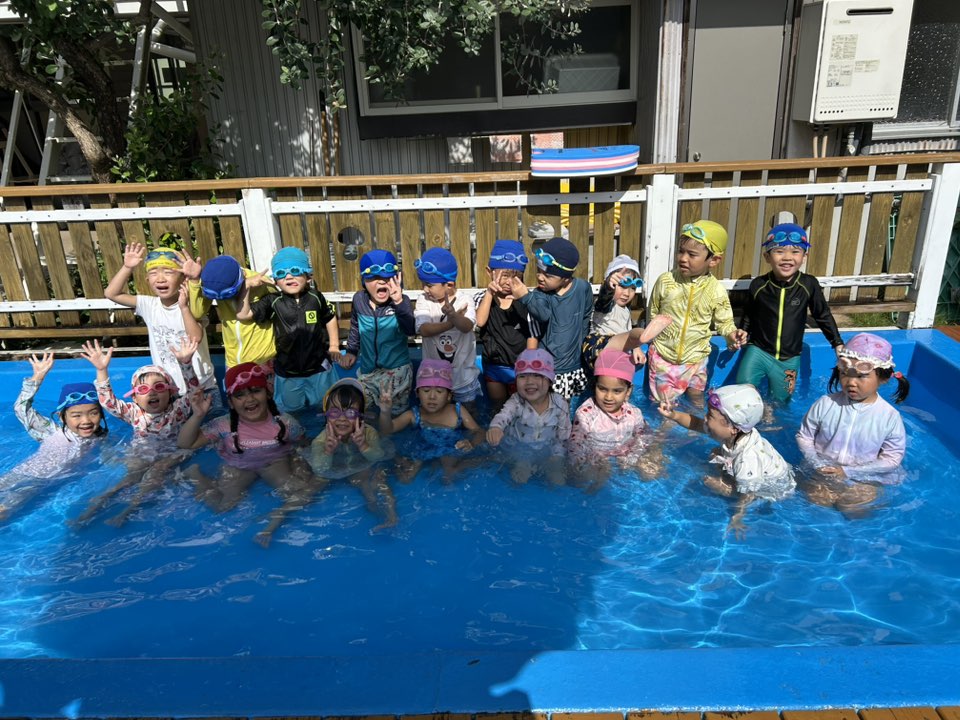 午前はワークでお勉強をしました。先生の話しを聞きながら、「これも同じかな?違うかな?」とお友だち同士で考え話し合っている姿はとても楽しそうです。午後はプールで遊びました。