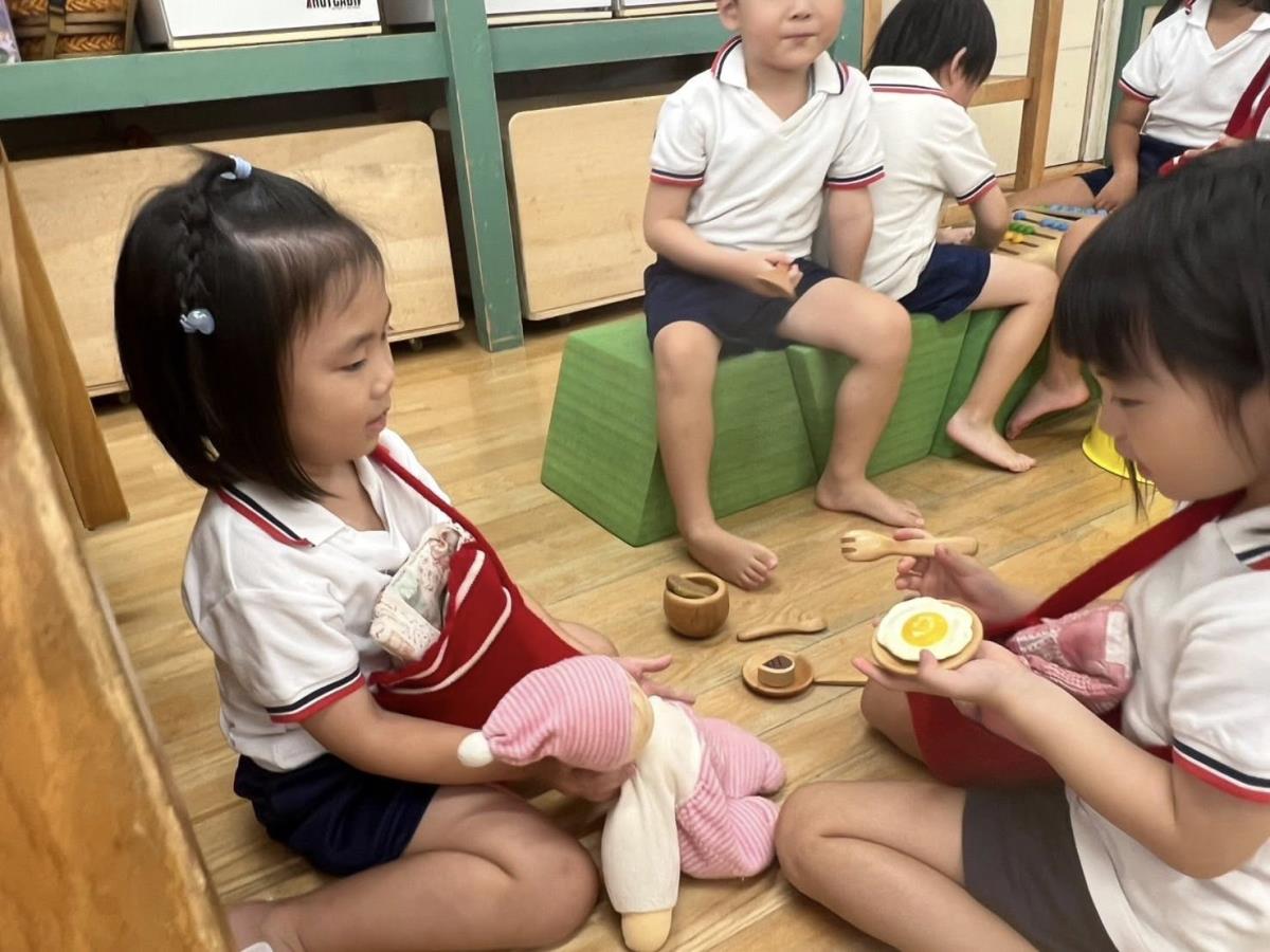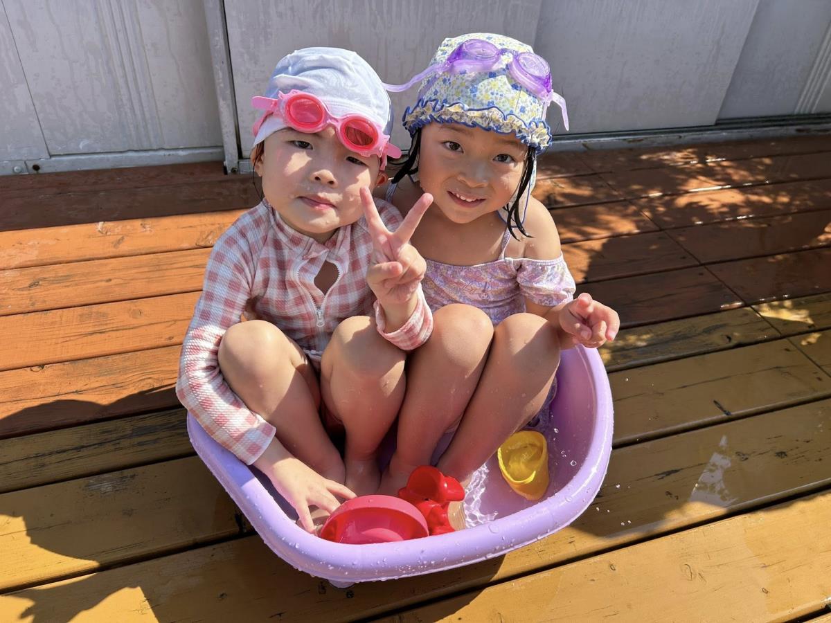 お部屋で遊びました。お料理をしたり、赤ちゃんのお世話をしたりしました。みんなでパーティーするのが楽しかったみたいです。「またやろうね!」とお友だち同士でおしゃべりしていました。午後はプールで遊びました。