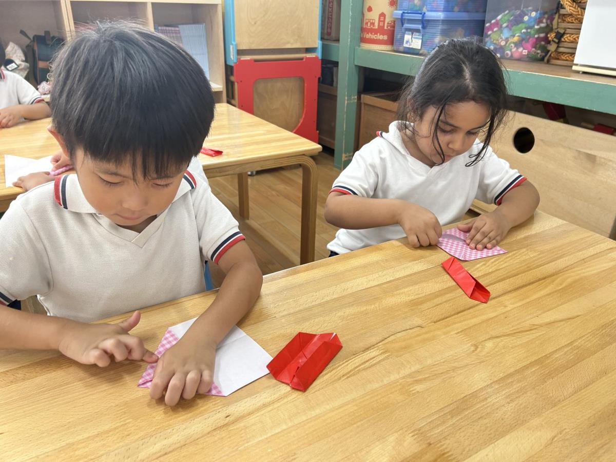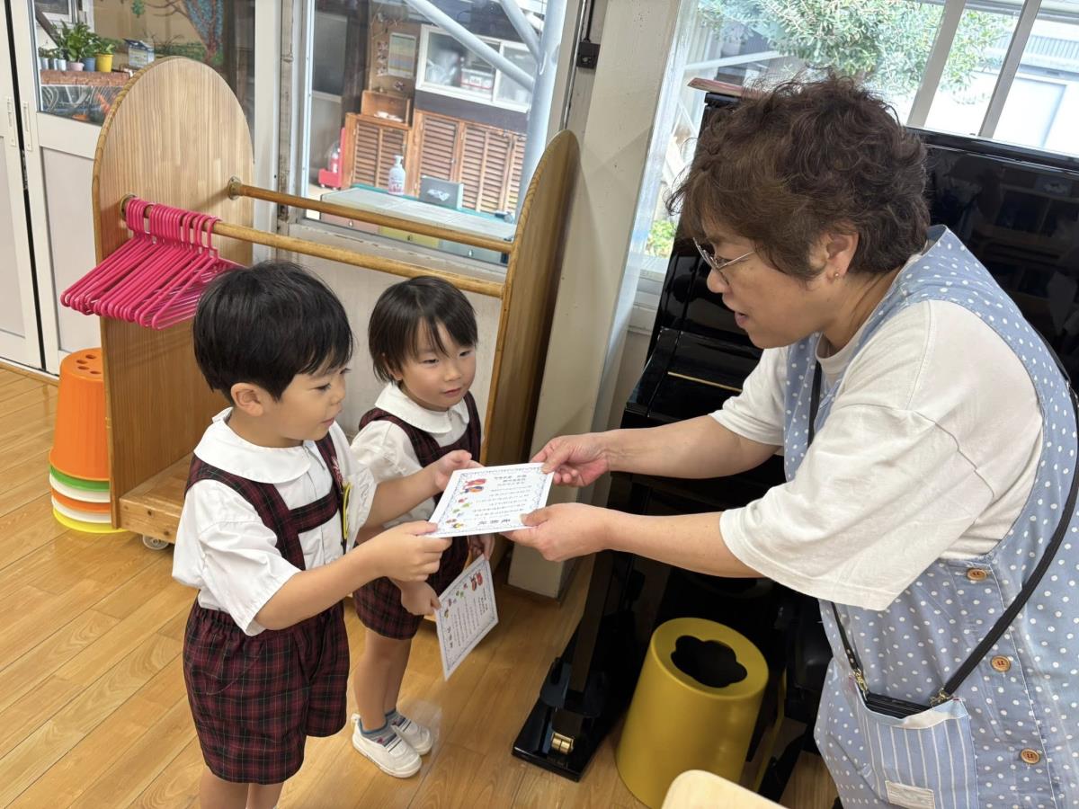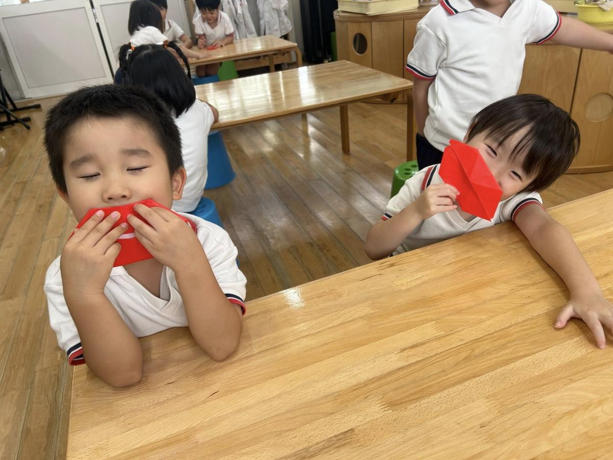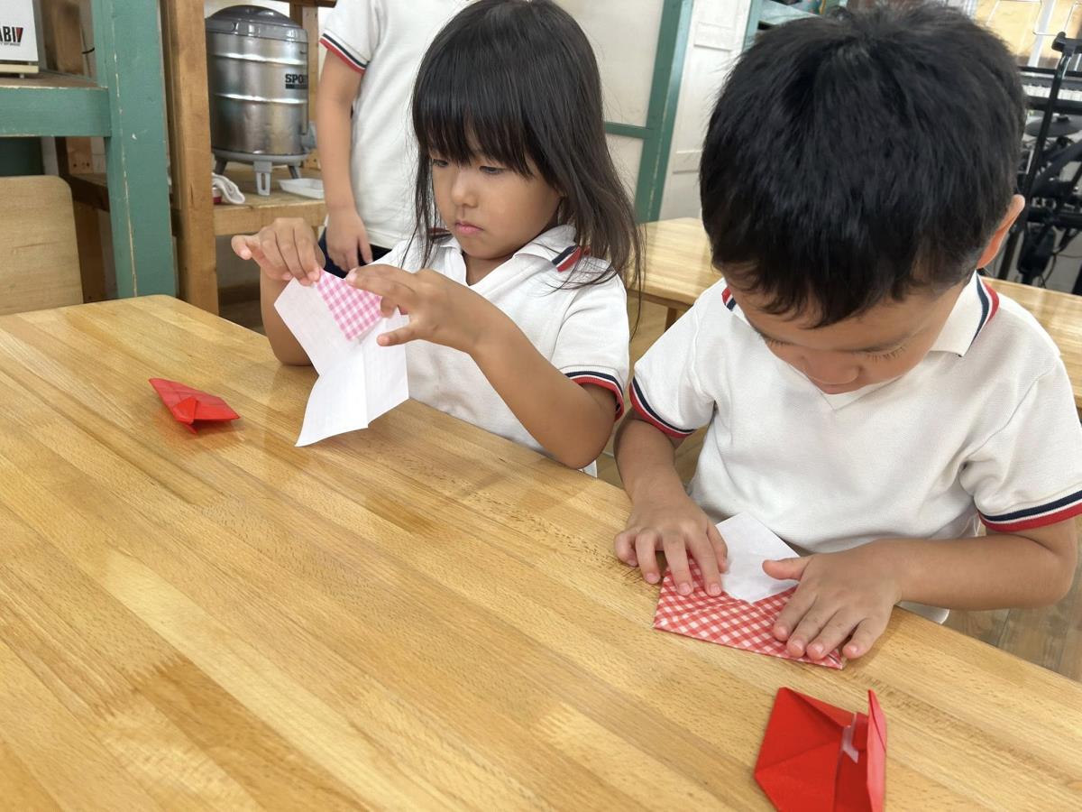 今日は午前中にリトミックがありました。カエルが飛んだり池に飛び込んだりする歌詞に合わせて身体を動かすのが楽しい様子でした。午後は折り紙で織姫彦星を折りました。