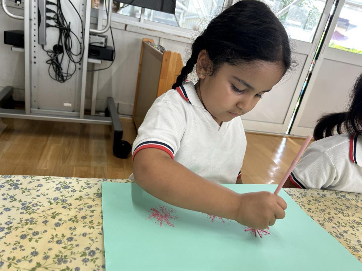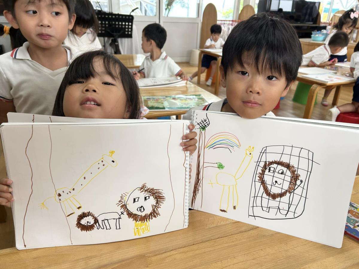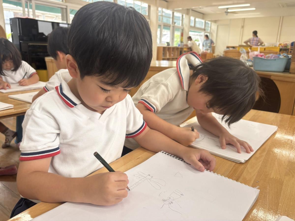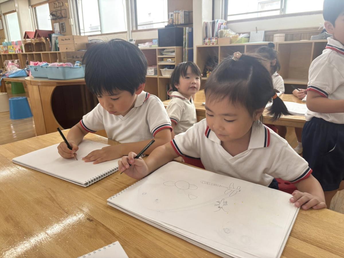 今日は午前中、絵の練習をしました。丸、三角、四角などのいろんな形を組み合わせて、虫や動物を上手に描きました。午後はプールに入りました。泳ぎながら、少しでも潜ろうと頑張る姿が見られました☆