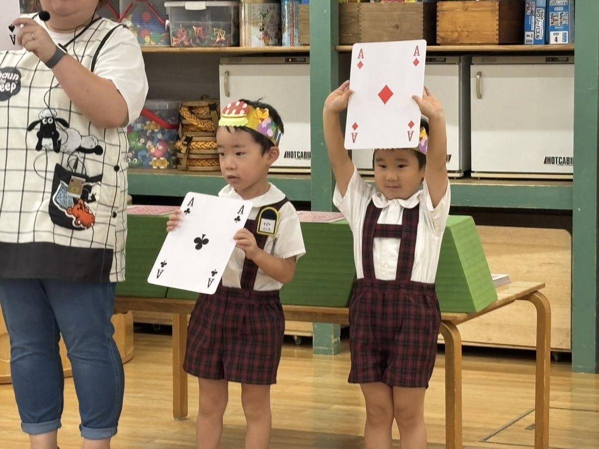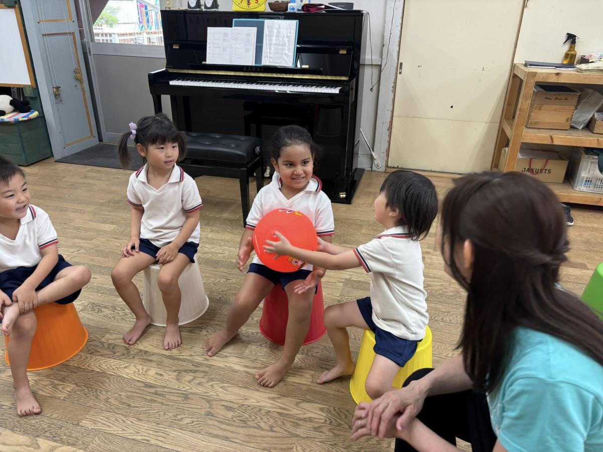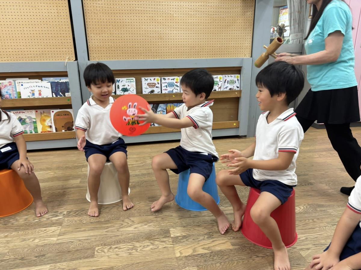 今日はリトミックがありました。「みんなで遊園地♪」の歌では、お友だちと2人組で船を漕いだり、コーヒーカップになりきってぐるぐる回ったりして、とっても楽しそうに行っていました!午後はカードゲームなどをして遊びました☆