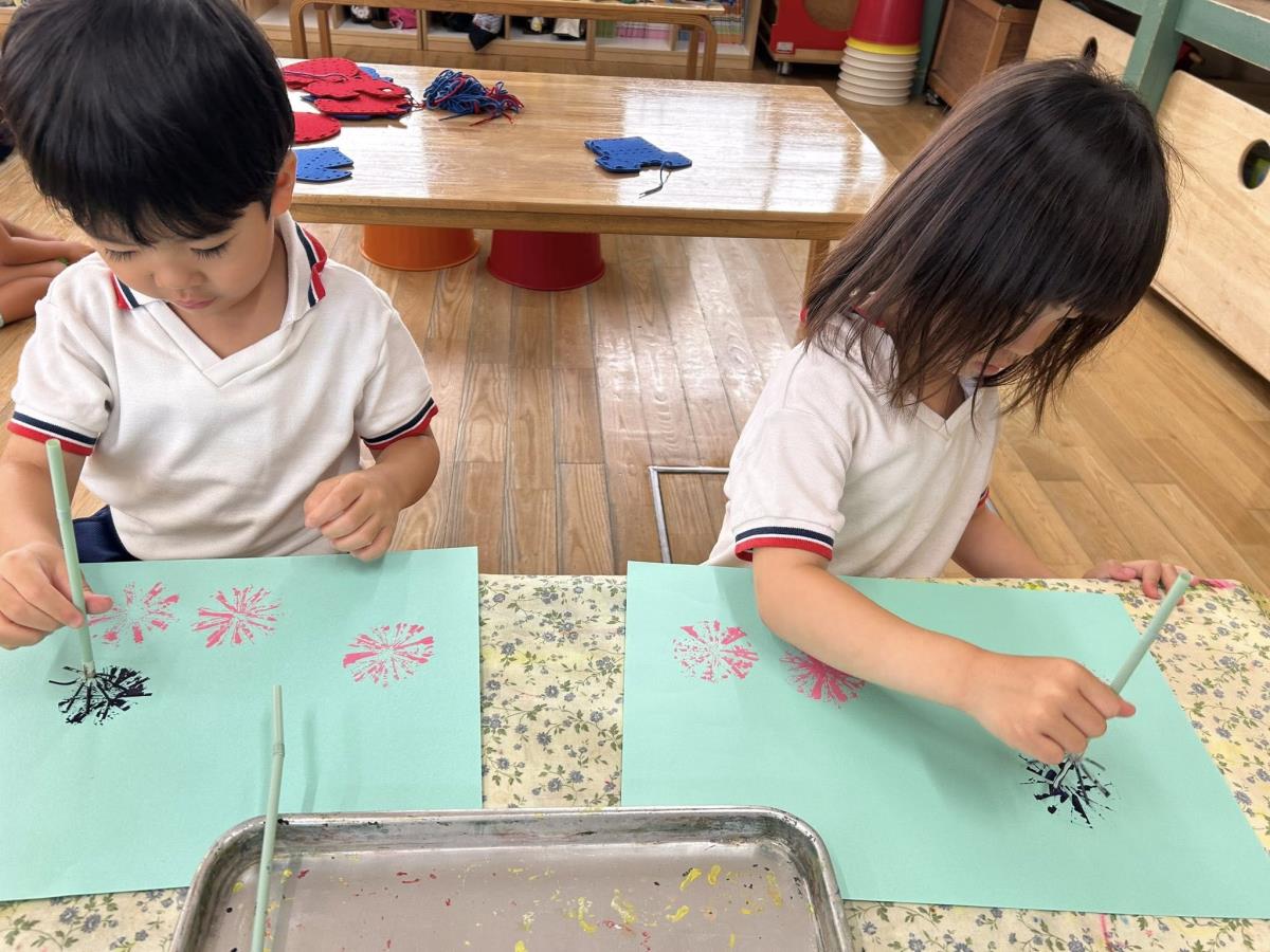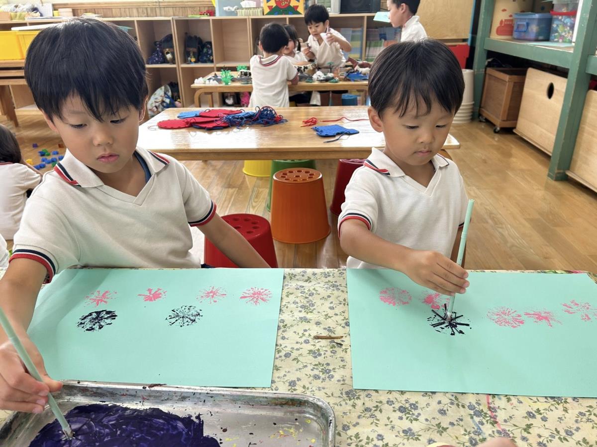 今日は月の制作をしました。膨らましたビニール袋に絵の具をつけてスタンプすると、お花のような形ができあがります。「可愛い!」「なんか花火にも見える」とお話ししながら、楽しく取り組みました。午後は園庭で遊びました☆