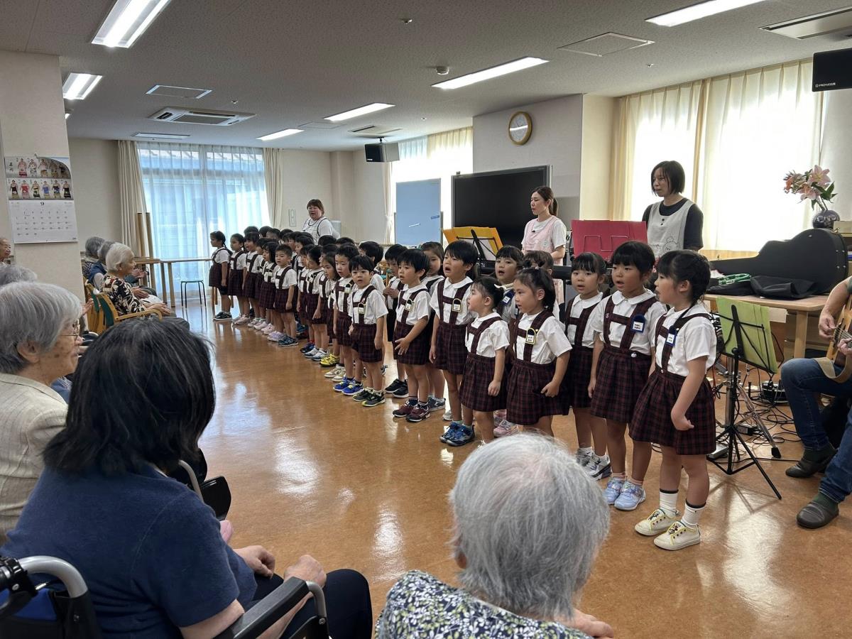 今日はお誕生会の前に、新入園児さんの紹介がありました。あお組さんにレイをかけてもらい、みんなにお祝いしてもらいました^ ^ お誕生会では先生たちのオペレッタを楽しみました。午後はあお組さんとお散歩に出かけました。浅間神社でお参りをしたあと西草深公園に行き、色々な遊具に挑戦する姿や、タンポポやシロツメクサなどの春の植物に触れたり観察したりする姿が見られました☆