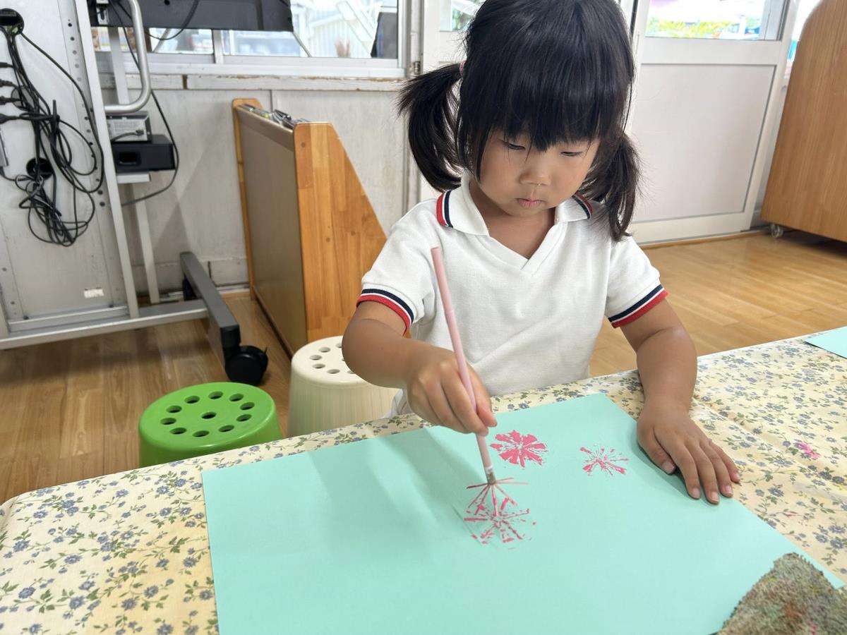 制作をしました。ストローに絵の具をつけてスタンプしました。「かわいい!」「何になるかなー?」とお友だちとおしゃべりを楽しんでいました。午後は盆踊りの練習をしました。