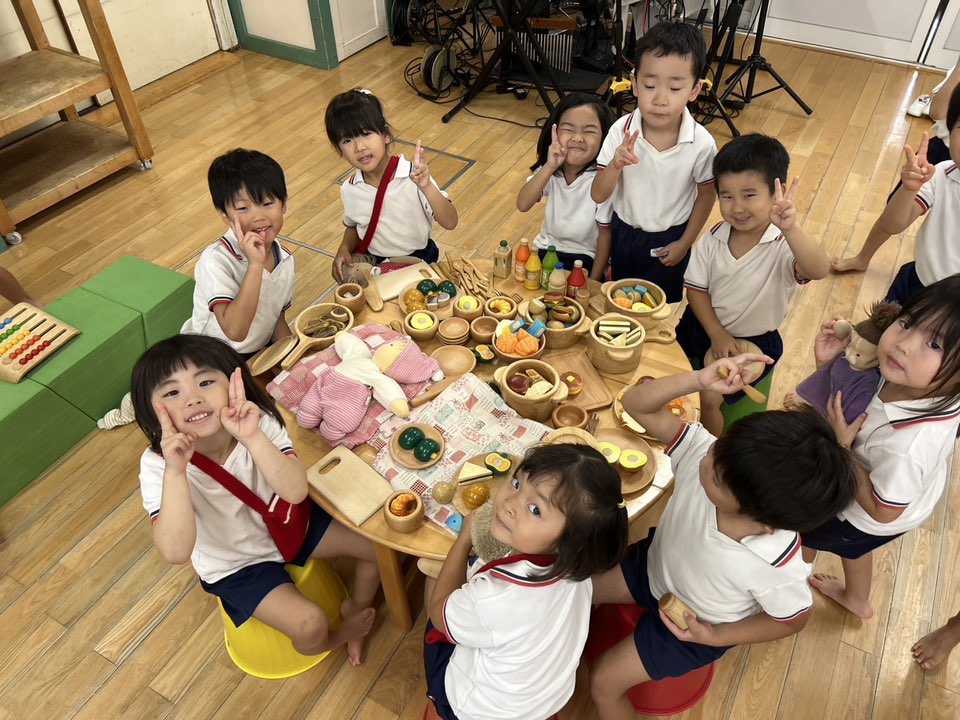今日は月刊誌を読みました。夏野菜の紹介ページでは、「トマト好き!」「ナスこの前食べたよ」「オクラは切ると星の形してるんだよ」とたくさんお話ししていました♪最後に、カレーの上に夏野菜のシールを貼り、とっても美味しそうな夏野菜カレーを作ってくれました^ ^午後はワミーやスナップバンドなどで遊びました☆