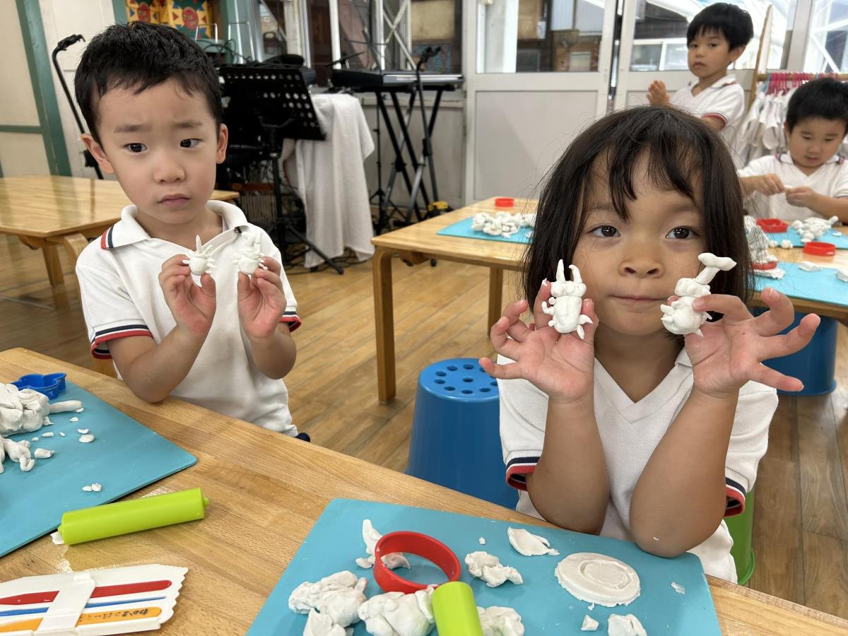 今日は月刊誌を読みました。パイナップルやキウイ、バナナなど夏の果物の写真が載っていて、「これおうちでママが切ってくれた!」「船に乗ったときに食べたよ」と、可愛いエピソードを話してくれました♪そのあとは、Bブロックで遊びました。午後は粘土遊びをしました。指先や道具を器用に使い、細かい装飾を作るのも上手になってきました☆