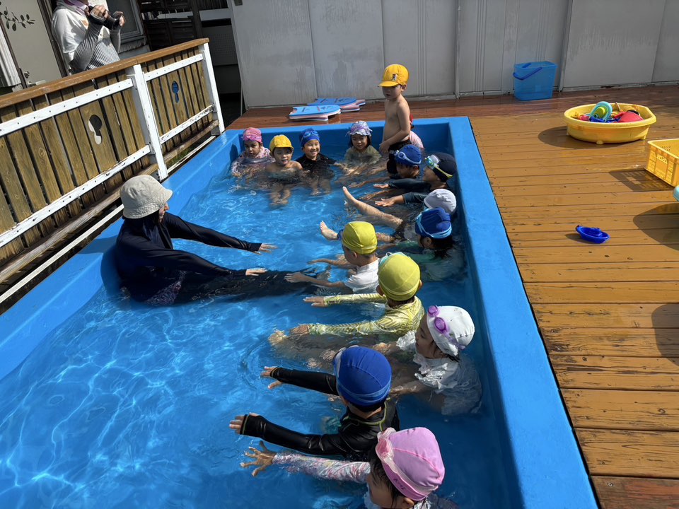 今日は待ちに待ったプールに入りました!みんなはりきって水着に着替え、ワクワクしている様子^ ^ ゆっくり水に体を慣らしながら入り、ワニさん泳ぎの練習をしたり、ビート板を使って泳いだりしていました。「楽しかったー!また明日も入る?」と、とても楽しんでくれたようです☆