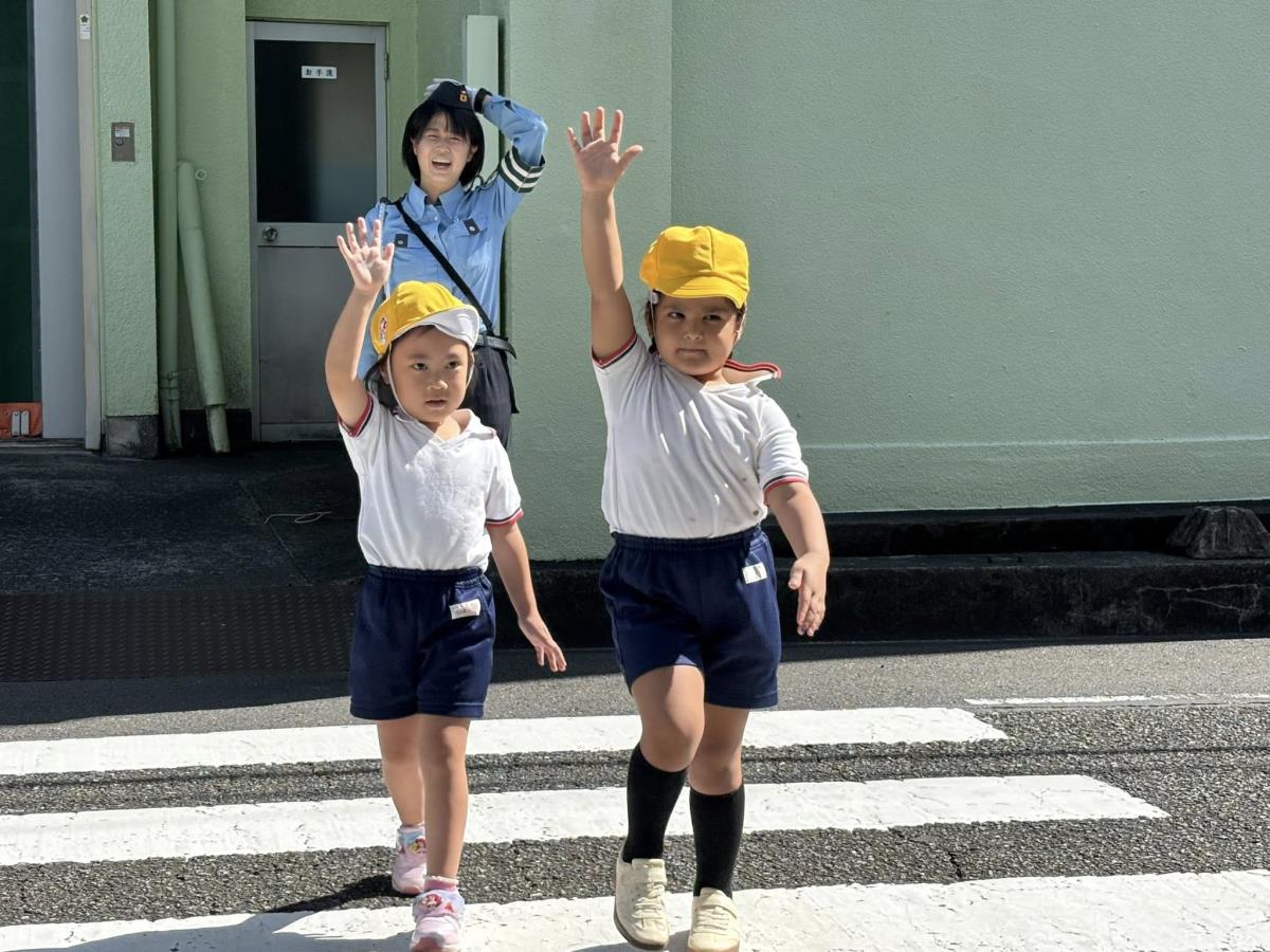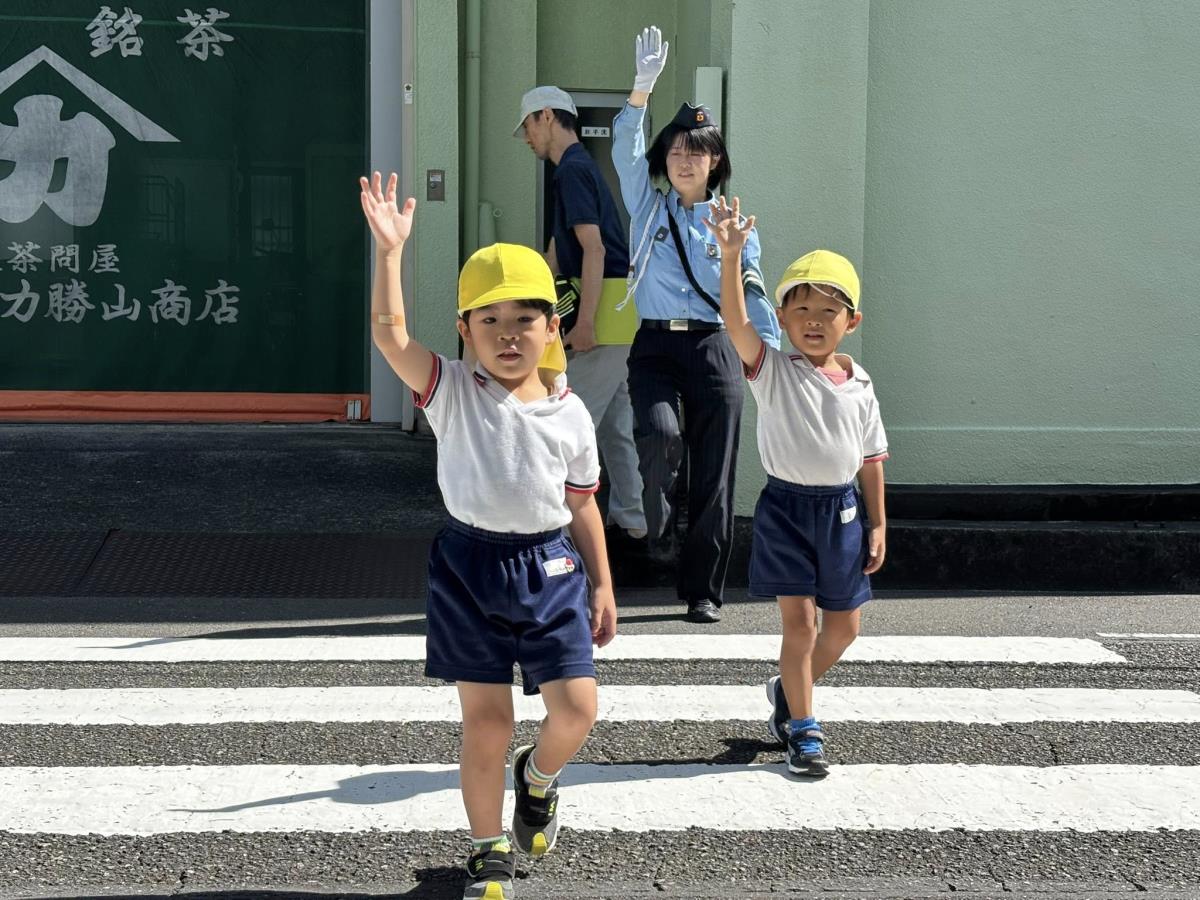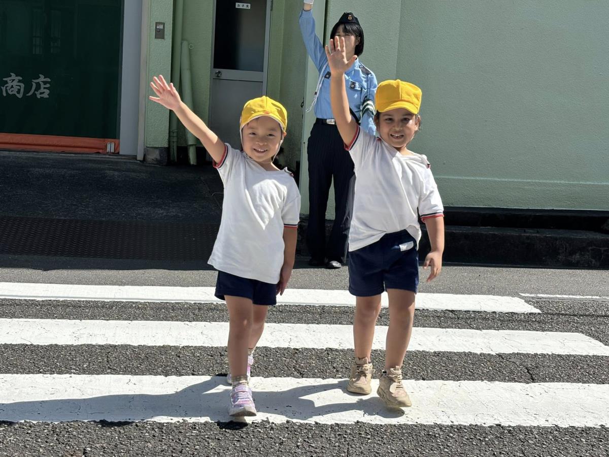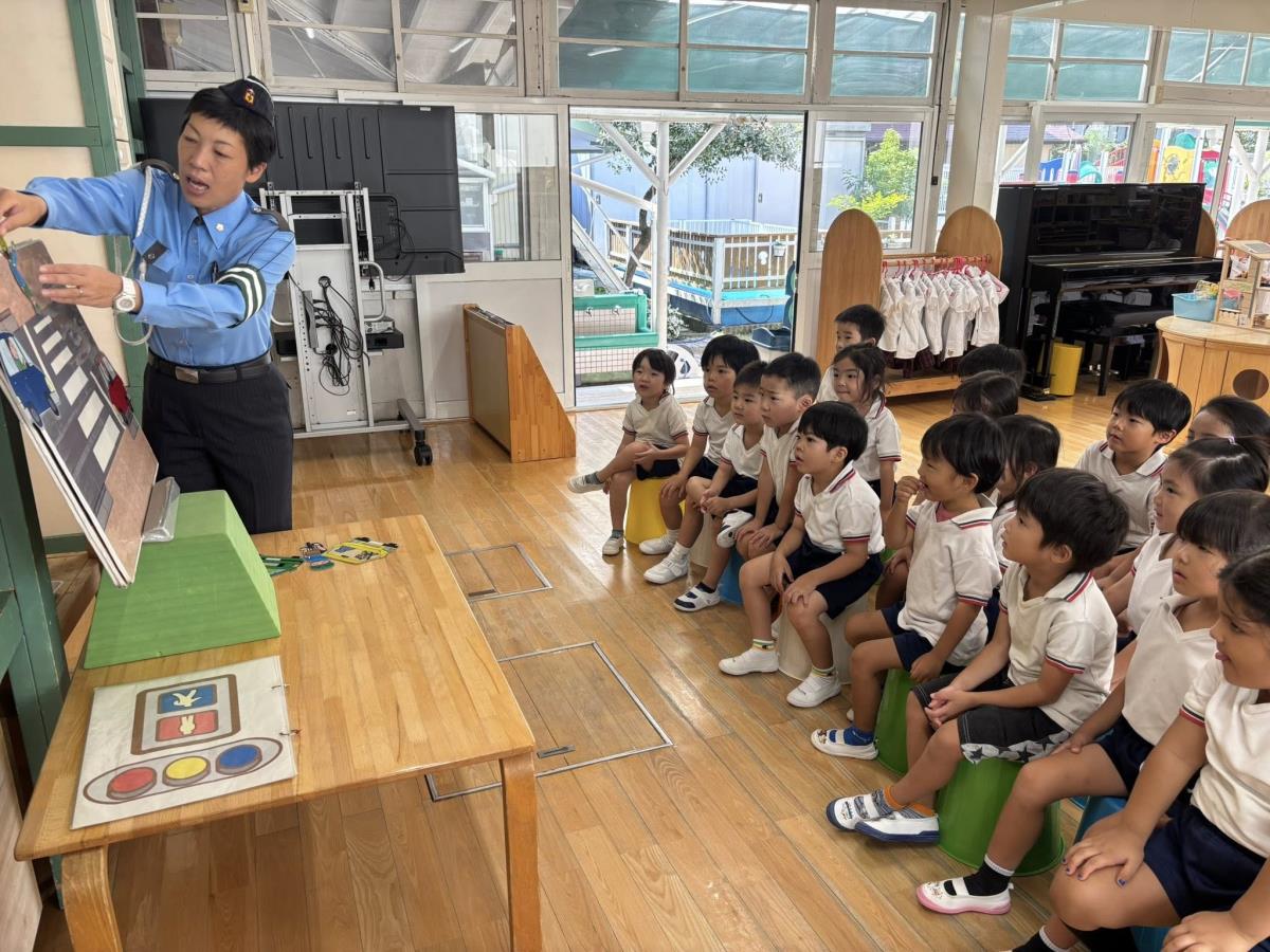 今日は交通教室がありました。指導員さんが来てくれ、道路の歩き方や渡り方などを教えてくれました。最後に、実際に園の前の横断歩道を渡る練習をしました。右手をしっかりあげて上手に歩けました!午後はプールに入り、おやつのあとはプール納めの会に参加しました。今年は潜る練習やバタ足を頑張ったきい組さん。できることがまた増えて、自信をつけてくれたら嬉しいです☆