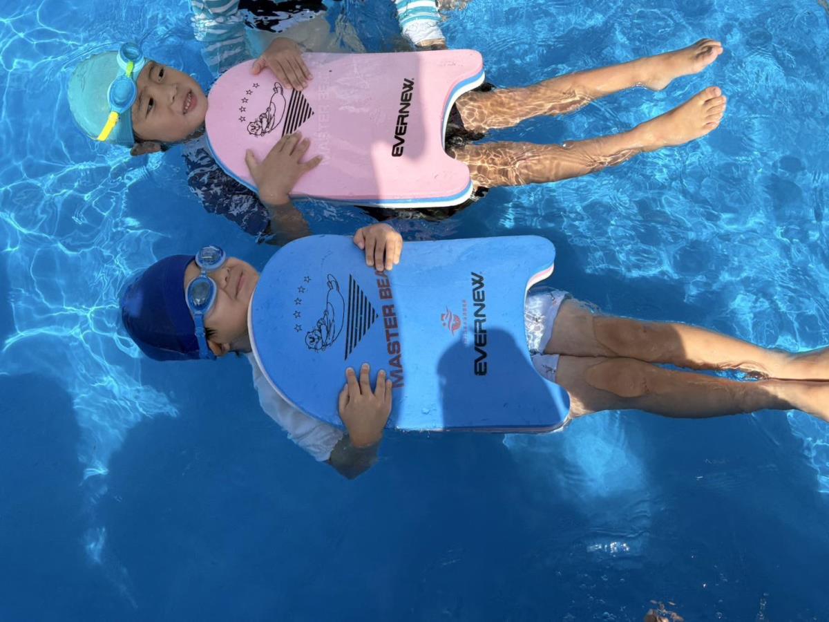 体育遊びに参加しました!ビート板を使ってけのびやラッコ泳ぎを上手に泳げるコツを教えてもらいました。水に顔をつけられるお友だちが増え、先生に得意げに見せていました。午後はお部屋でワークでお勉強をしました。