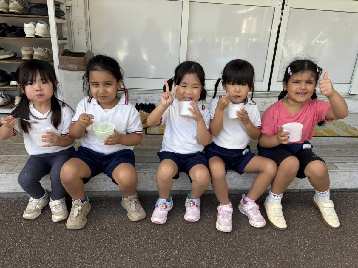 今日はワークを行いました。間違い探しをしたり、仲間同士を探したりするページをやり、楽しくお勉強しました。わかった子は前に出てみんなの前で発表してくれます。恥ずかしそうにしながらも、みんな積極的に手を挙げてくれます!お昼ごはんは七夕そうめんでした。「ニンジンお星さまの形だ〜」「おいしい^ ^」と、嬉しそうに食べていました。午後はプールに入りました☆