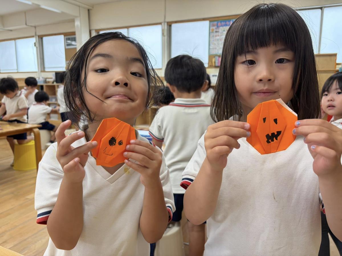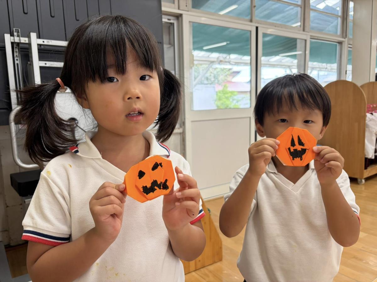 折り紙でかぼちゃを折りました。両手を上手に使いながら丁寧に折っていきました。完成したかぼちゃに顔を描くと「かわいいのができた!!」と喜んでいました。午後はお部屋で過ごしました。
