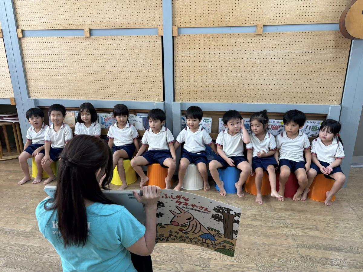 今日は月刊誌を読みました。梅雨にちなんだお話しを読み、そのあとはシールのページです。長靴屋さんになって、長靴をいろんな動物の足に履かせてあげました。足の大きさをよく見ながら、よく考えて貼れました。午後は園庭で遊びました☆