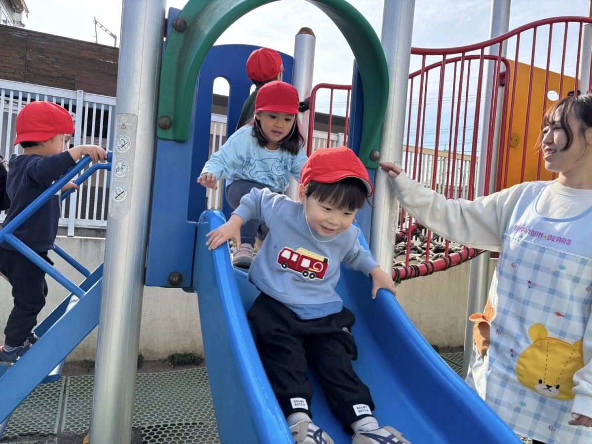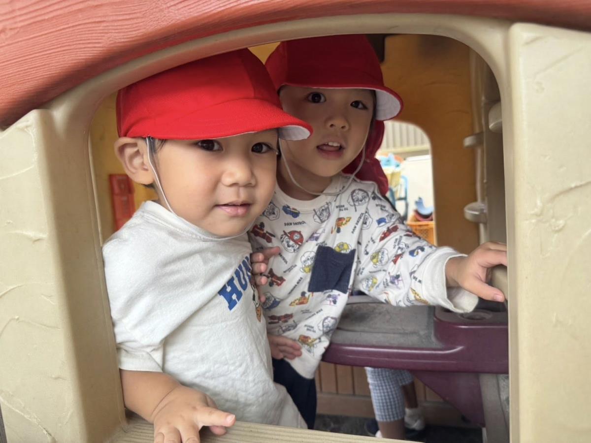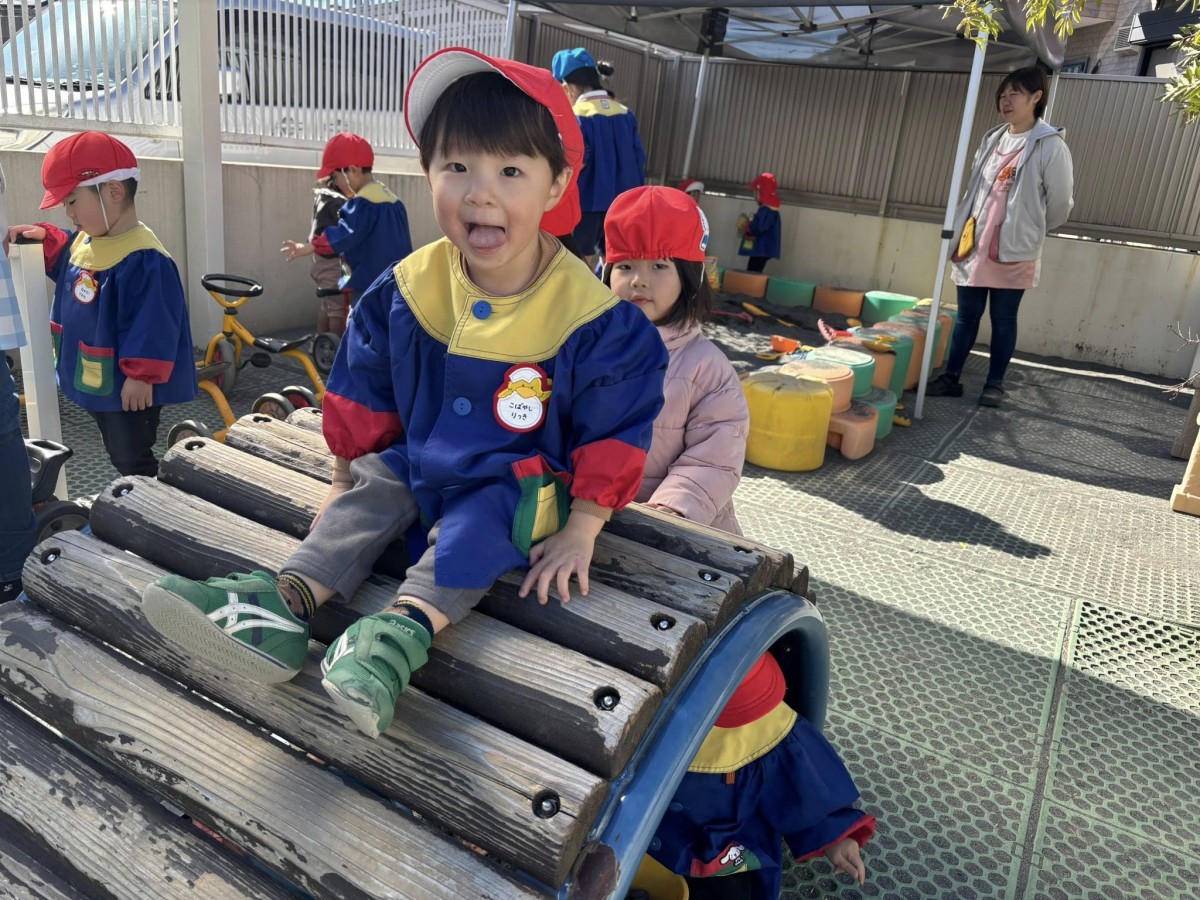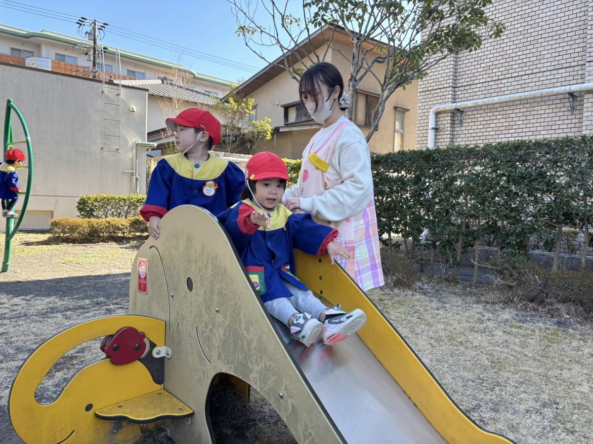 今日はお部屋で月刊誌を見た後に園庭で遊びました。滑り台の上から「おーい」と手を振ったりお友だちと一緒に滑ったりして楽しんでいました!!バイクや三輪車でドライブしているお友だちは「渋滞だよ」「あおだから進むよ」等遊びの中で言葉がたくさん出ていて楽しそうです♪