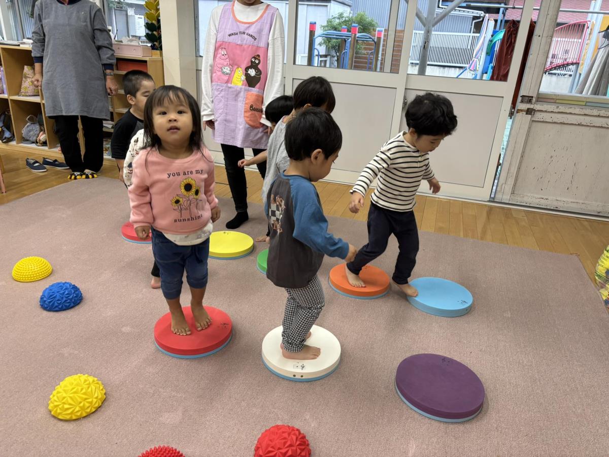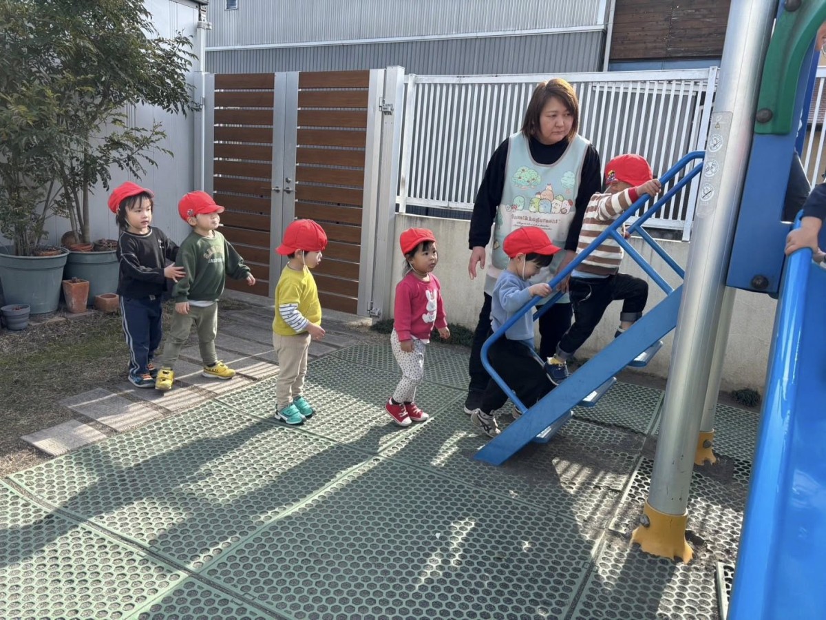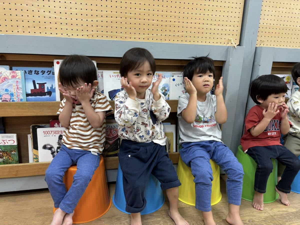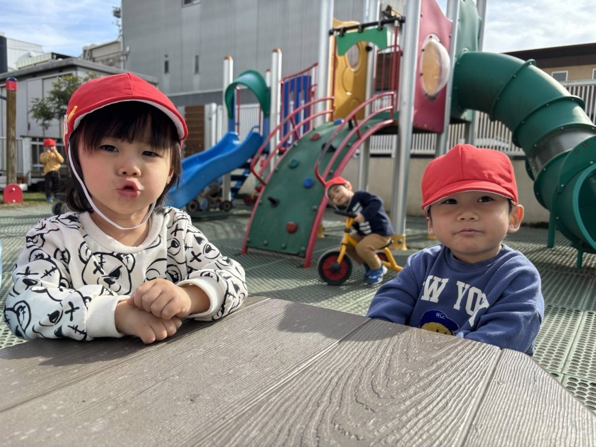 今日はお部屋で月刊誌を見た後に園庭で遊びました。滑り台の上から「おーい」と手を振ったりお友だちと一緒に滑ったりして楽しんでいました!!バイクや三輪車でドライブしているお友だちは「渋滞だよ」「あおだから進むよ」等遊びの中で言葉がたくさん出ていて楽しそうです♪