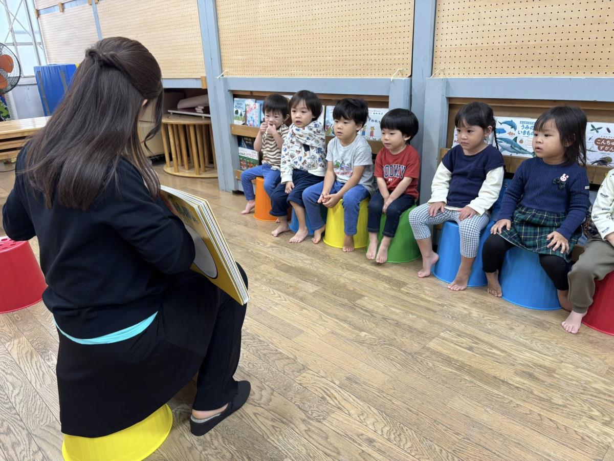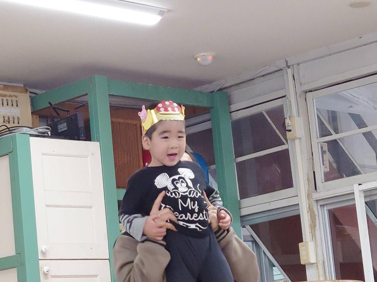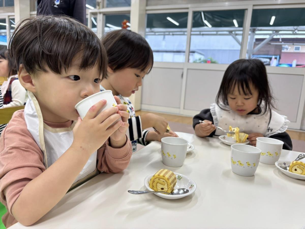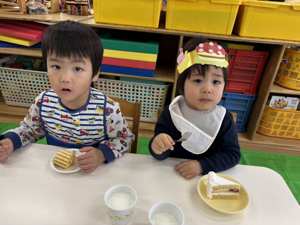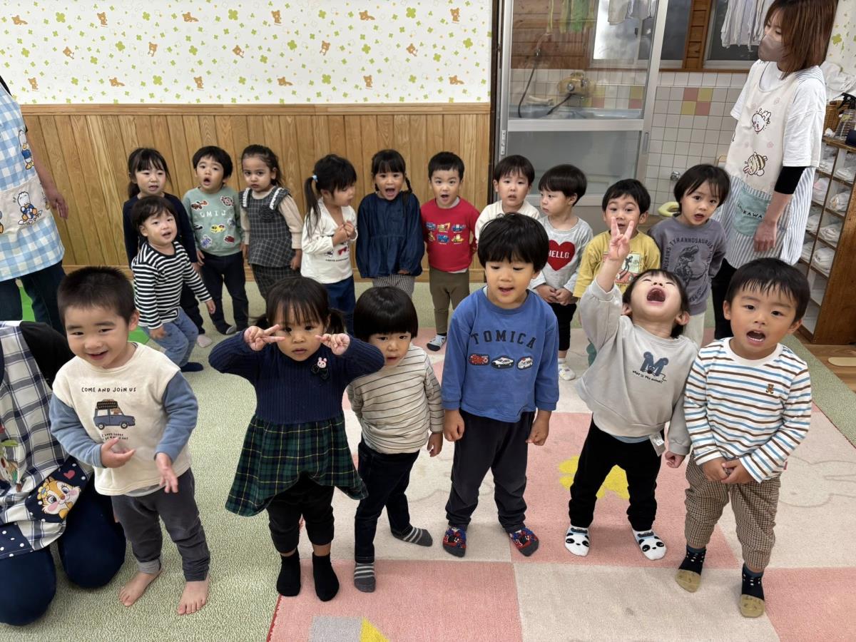 | 今日はお誕生会に参加しました。あか組さんのお誕生児は1人でみんなでお祝いをしました。保育士からのプレゼント『おばけのがっこうにきてください』を楽しんで見ていました!お誕生会の後は少しだけお外で遊ぶ事ができお砂場やスモールハウスで楽しく遊ぶ事ができました♪おやつのロールケーキも喜んで食べていました! |