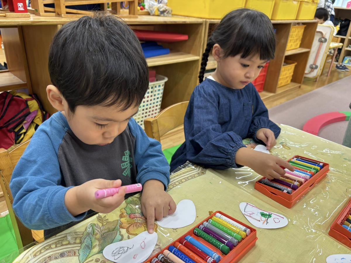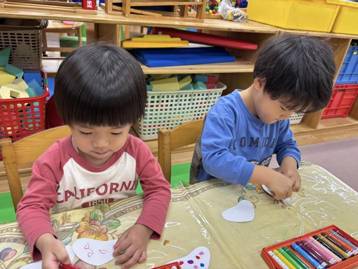 | 今日は園周辺をお散歩した後にお部屋で制作をしました。制作では折り紙をちぎって画用紙にのりをつけて貼るこの事に挑戦しました。最初は折り紙をちぎる行為に戸惑っていましたがやり始めると楽しくなったようでした♪お散歩ではバスやミキサー車を見つけてとっても嬉しそうに指をさしていました!!午後は小児科検診がありました。終わった後に好きな色の風船を選んで作ってもらいたいものを伝えてバルーンアートで色々な形を作ってもらい嬉しそうでした! |