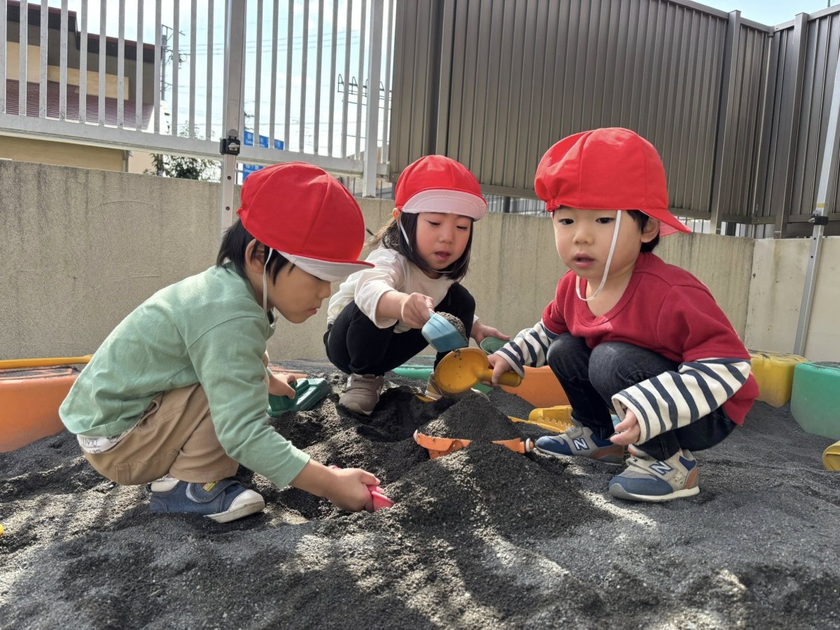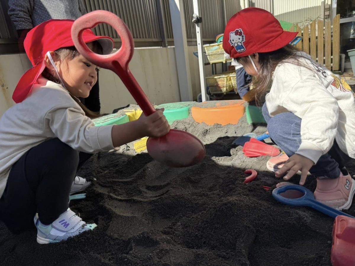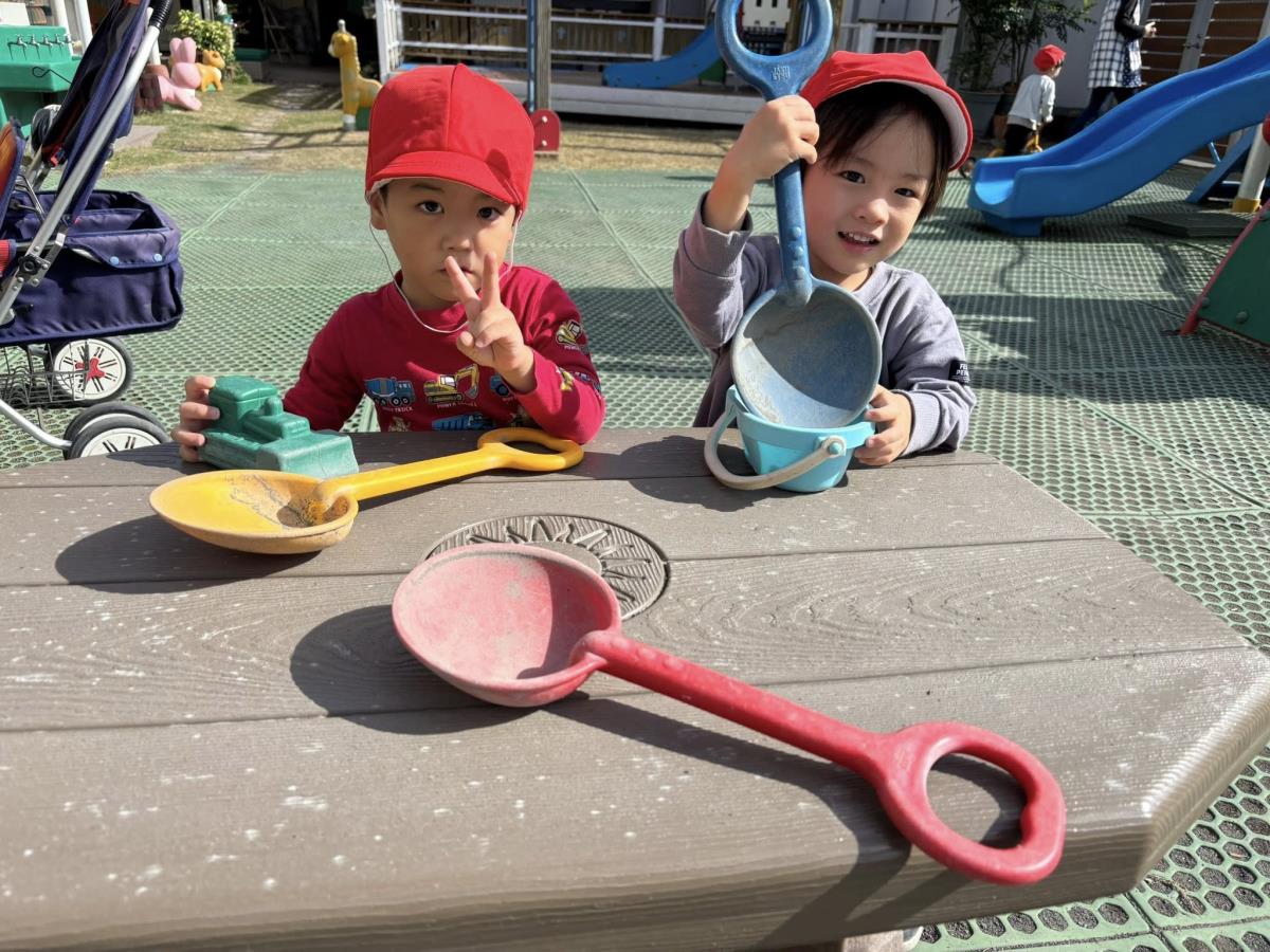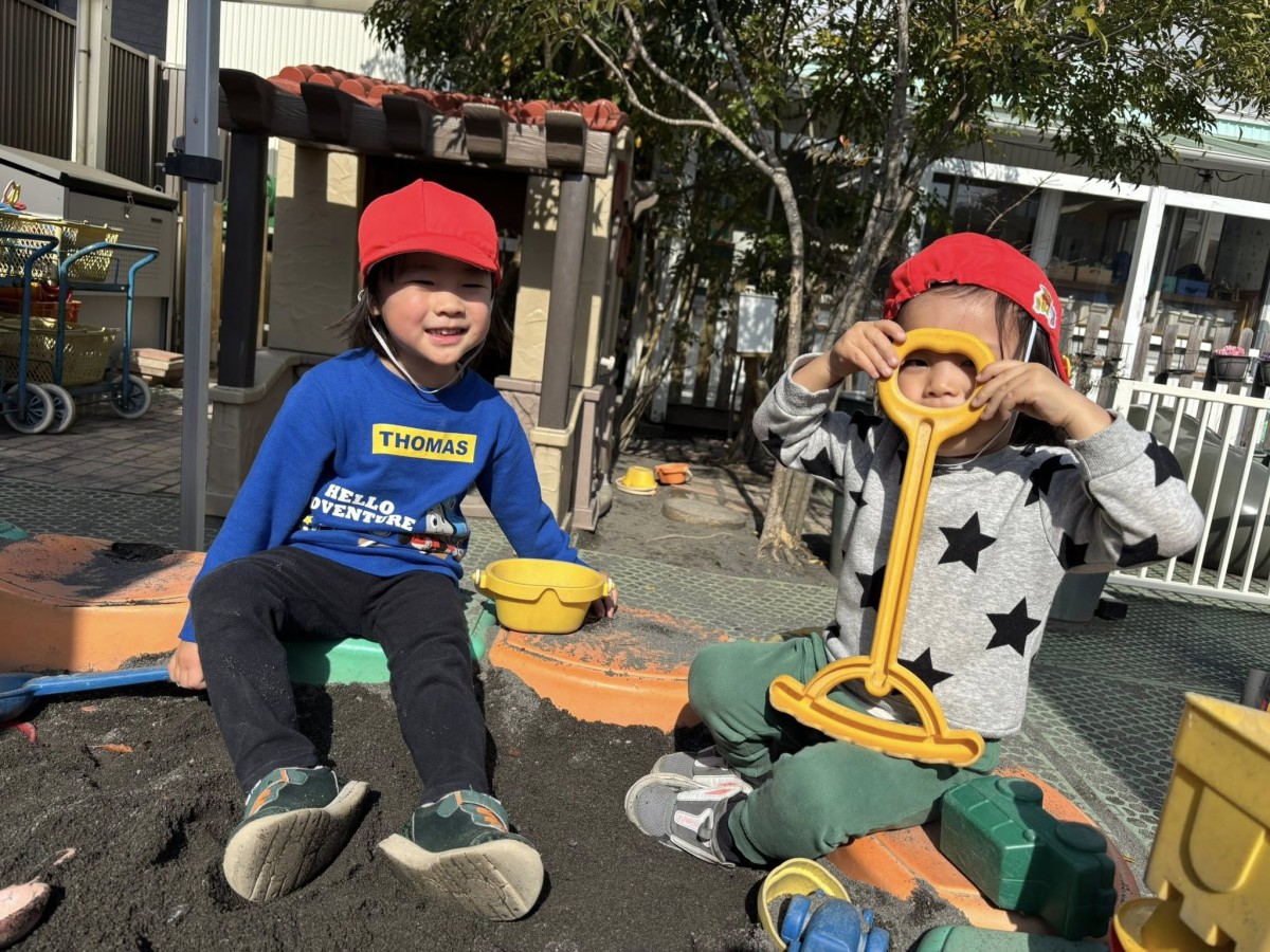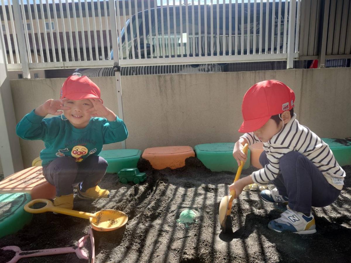 | 今日は園庭で遊びました。お砂場でお友達と一緒に穴を掘って楽しむあか組さん。「工事中なんだよ!」と教えてくれました。その様子を見た一人の子が「仲間入れて」と声をかけると「いいよ」と返事をもらい、一緒に遊び始めていました。「貸して」や「仲間入れて」がだいぶ言えるようになっている姿を見て、成長を感じました。 |