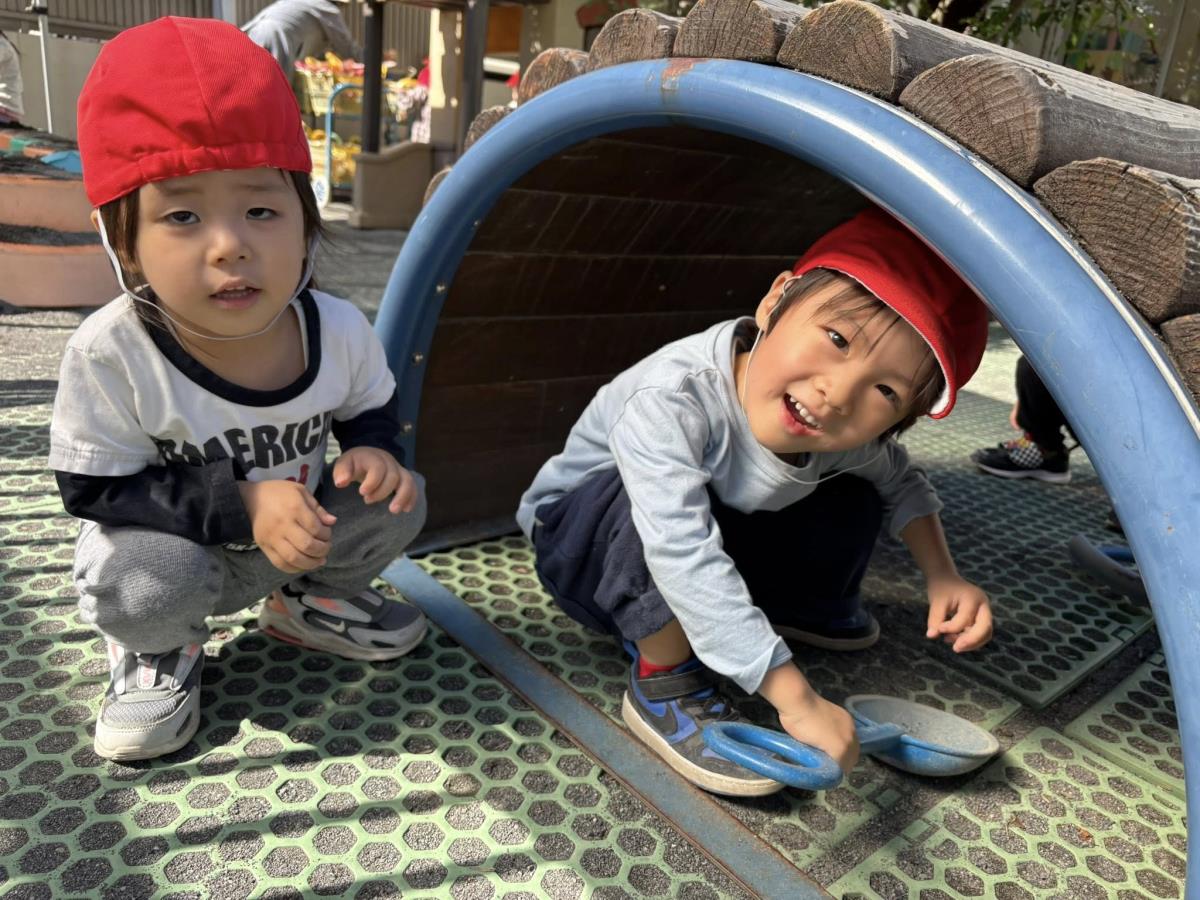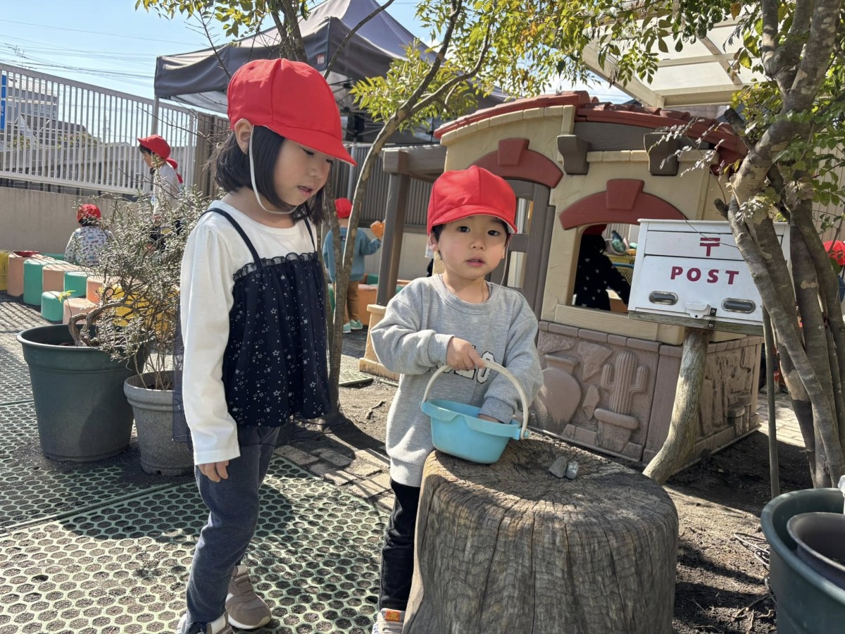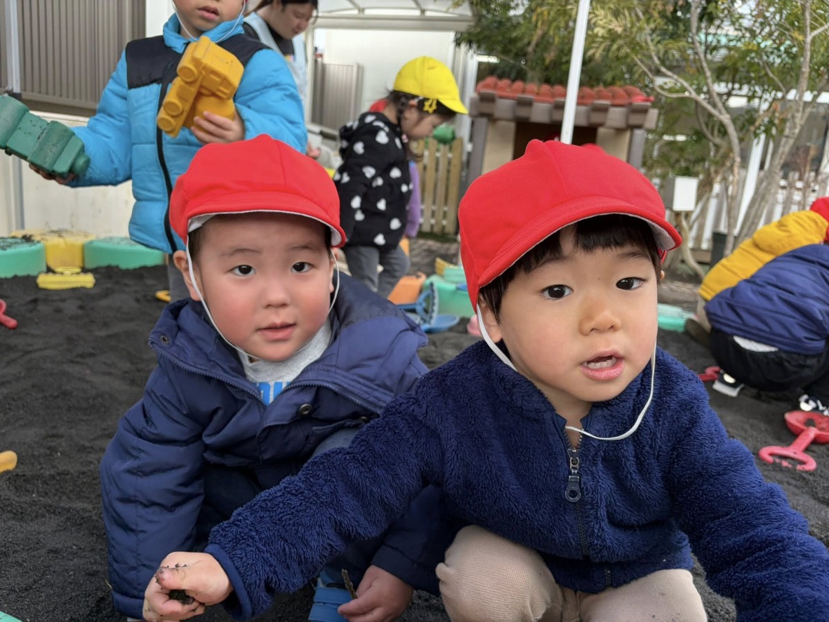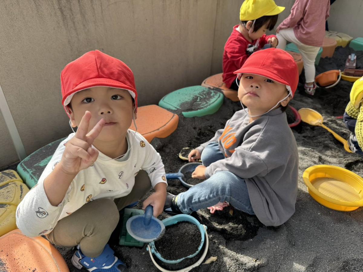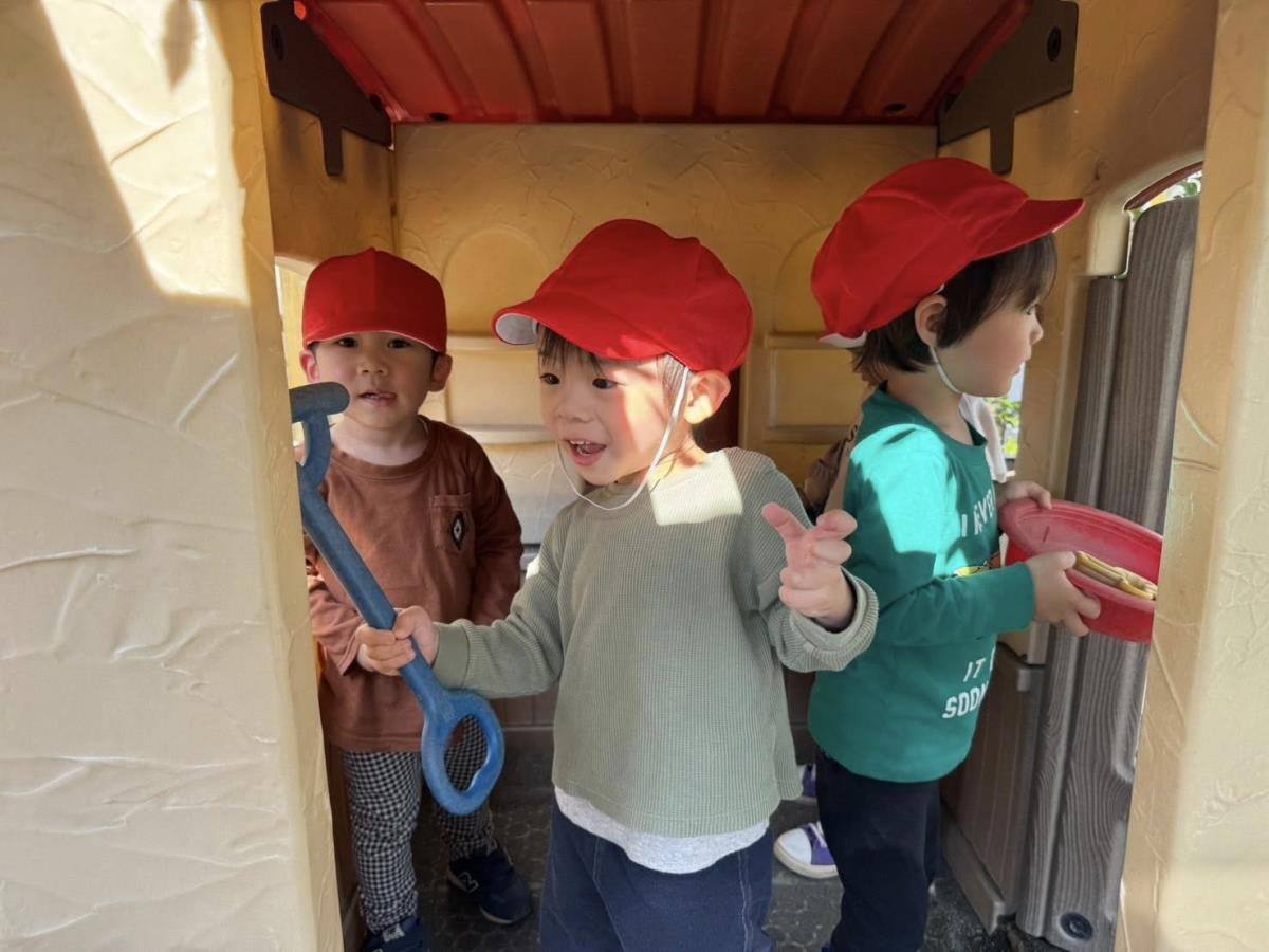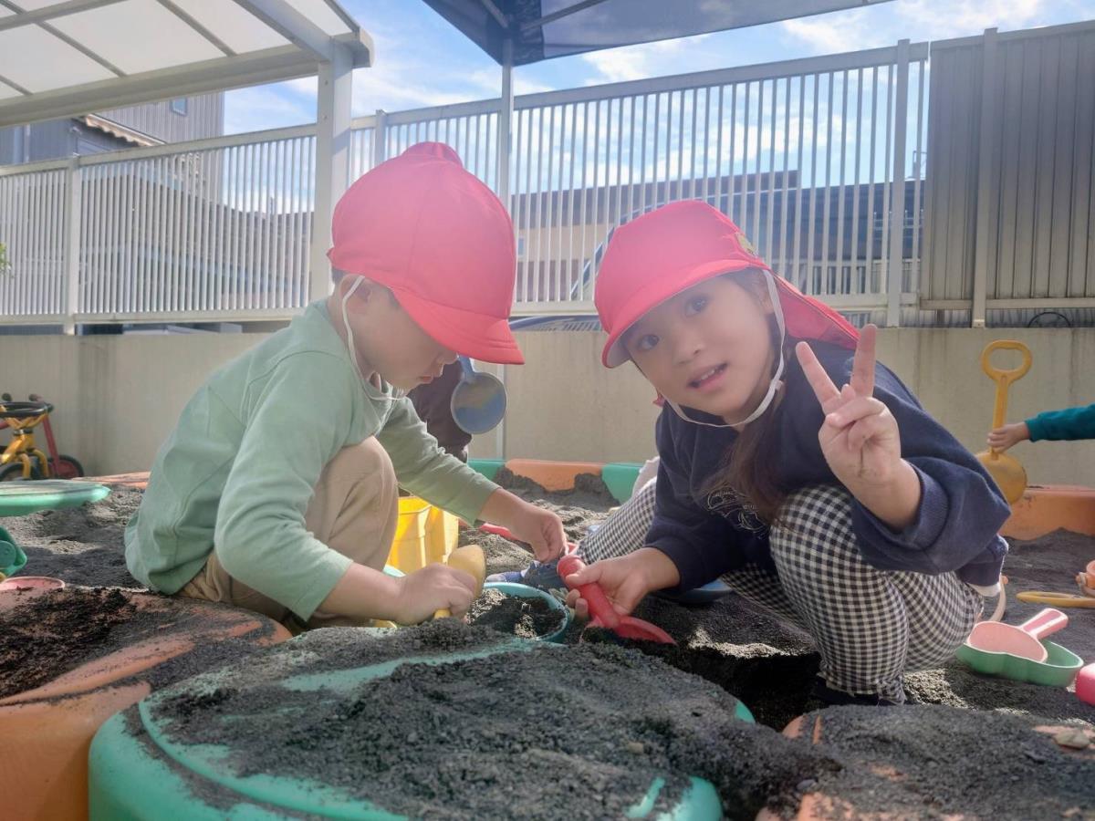 | 今日は園庭で遊びました。お砂場でお友達と一緒に穴を掘って楽しむあか組さん。「工事中なんだよ!」と教えてくれました。その様子を見た一人の子が「仲間入れて」と声をかけると「いいよ」と返事をもらい、一緒に遊び始めていました。「貸して」や「仲間入れて」がだいぶ言えるようになっている姿を見て、成長を感じました。 |