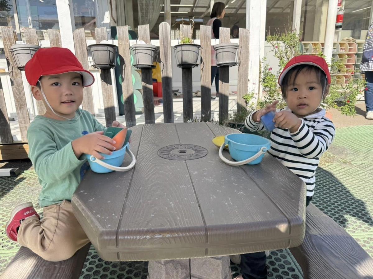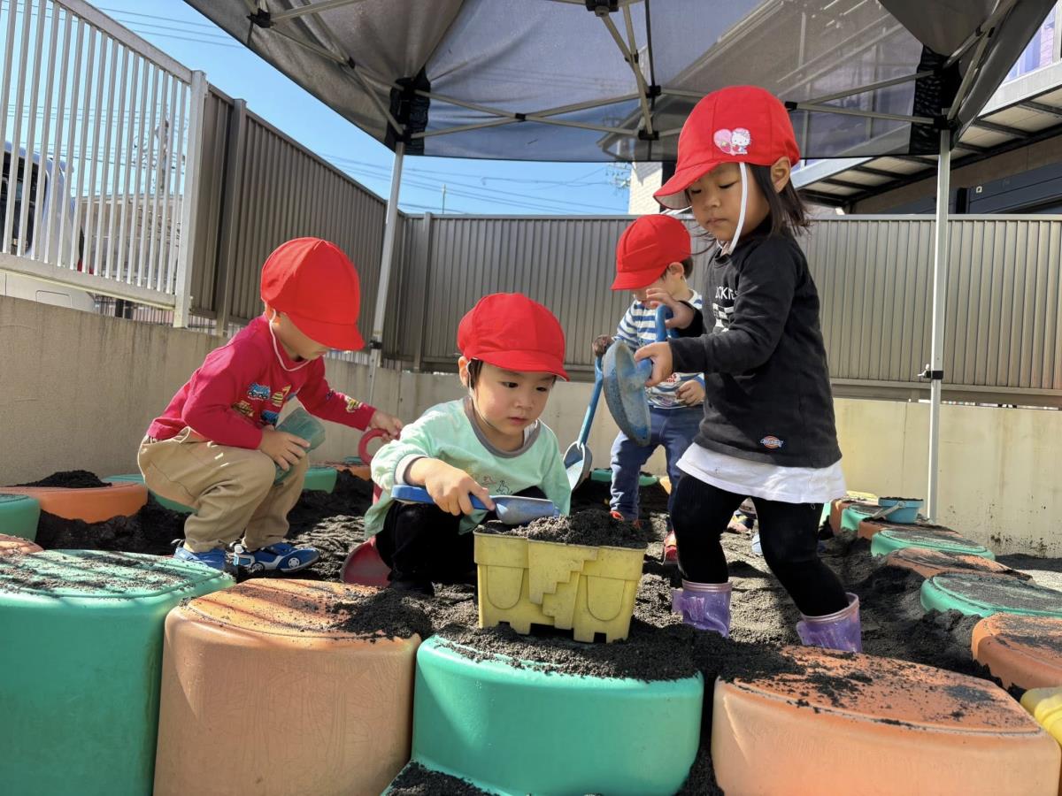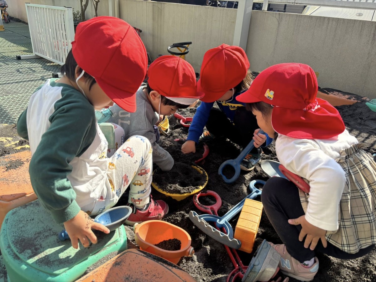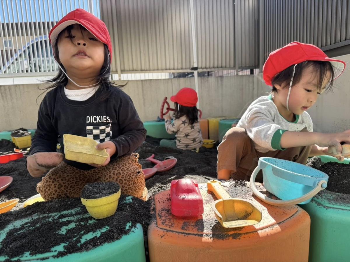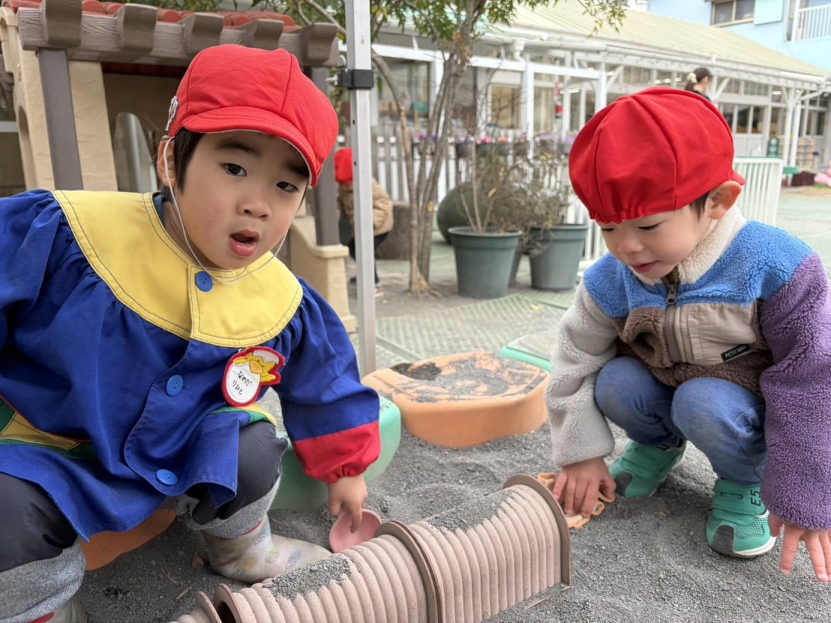 | 今日は園庭で遊びました。お砂場でお友達と一緒に穴を掘って楽しむあか組さん。「工事中なんだよ!」と教えてくれました。その様子を見た一人の子が「仲間入れて」と声をかけると「いいよ」と返事をもらい、一緒に遊び始めていました。「貸して」や「仲間入れて」がだいぶ言えるようになっている姿を見て、成長を感じました。 |