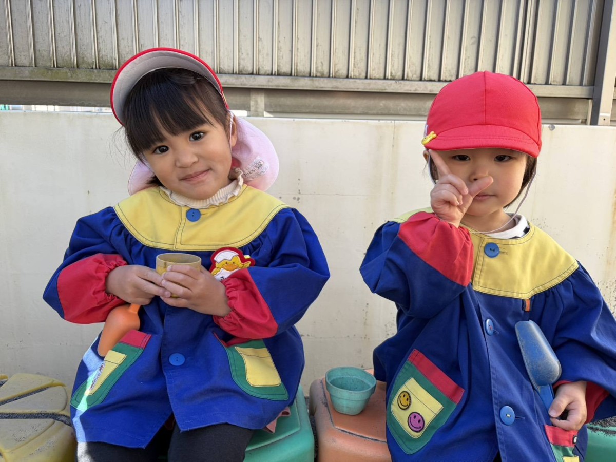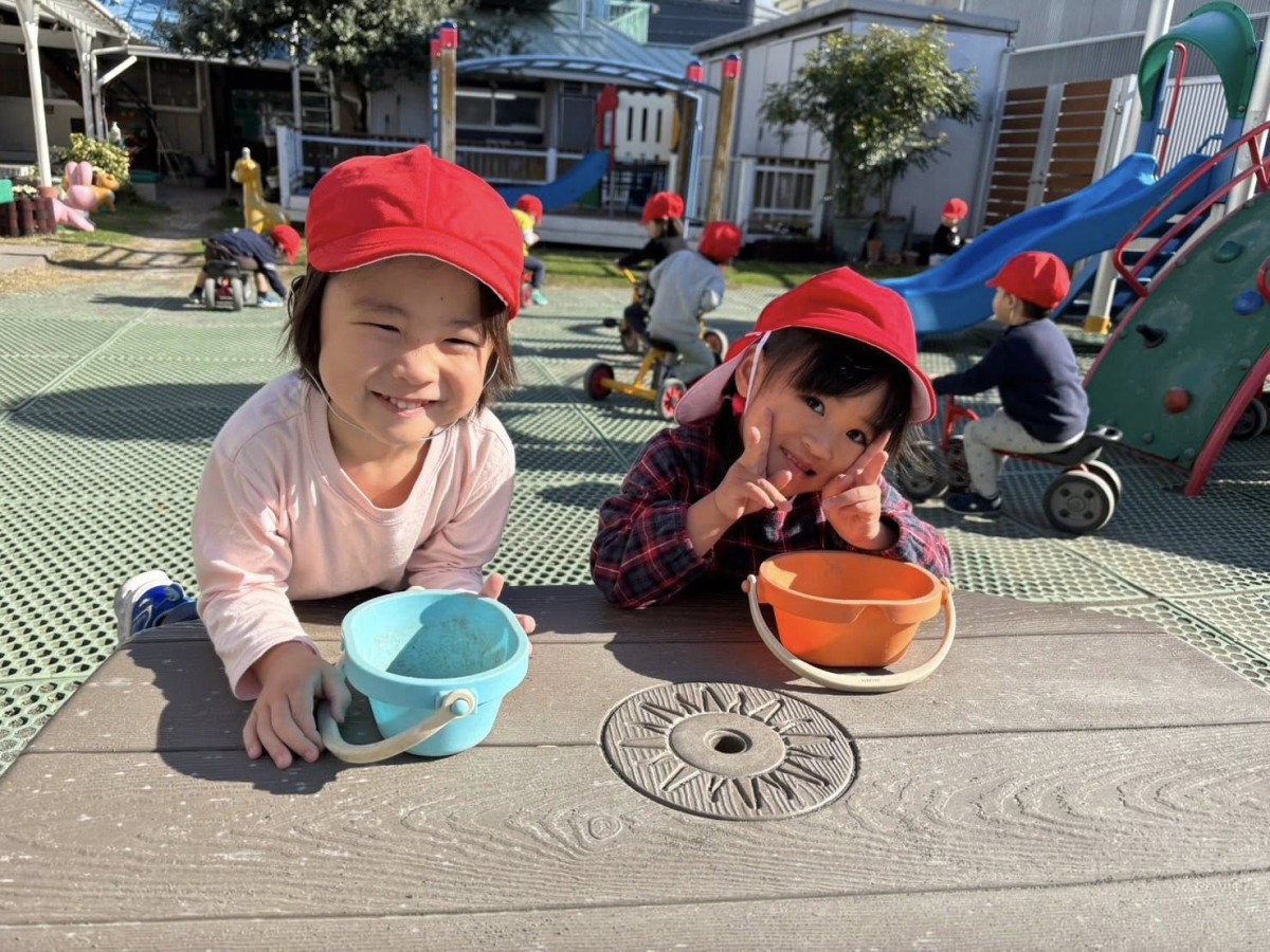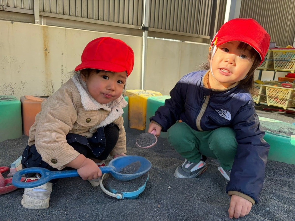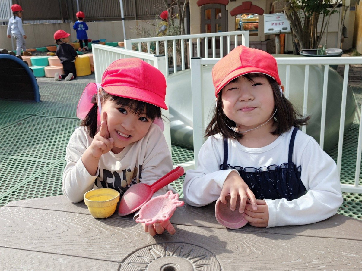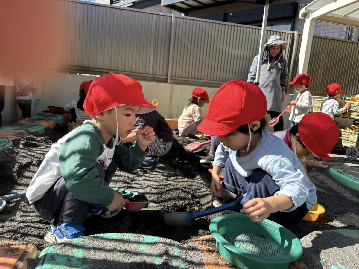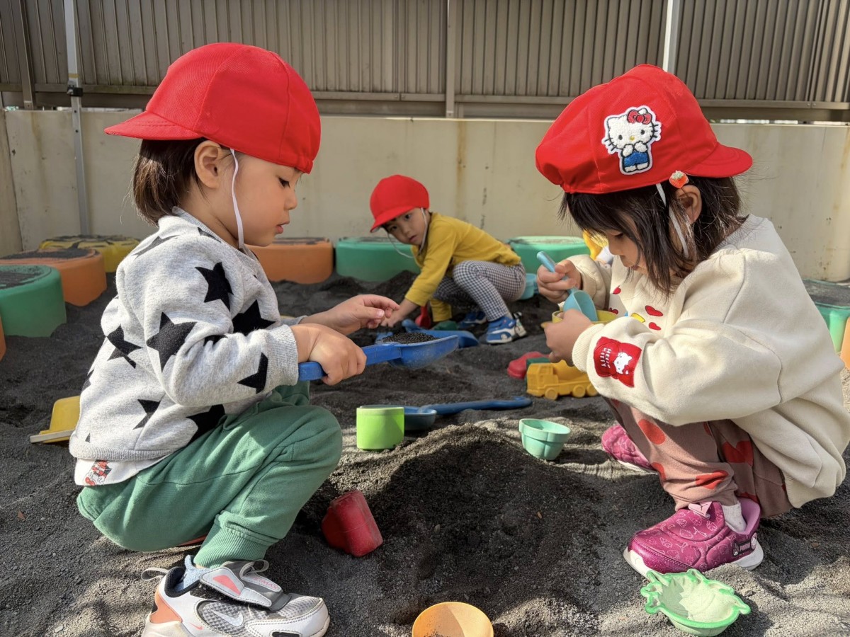 | 今日は園庭で遊びました。お砂場でお友達と一緒に穴を掘って楽しむあか組さん。「工事中なんだよ!」と教えてくれました。その様子を見た一人の子が「仲間入れて」と声をかけると「いいよ」と返事をもらい、一緒に遊び始めていました。「貸して」や「仲間入れて」がだいぶ言えるようになっている姿を見て、成長を感じました。 |