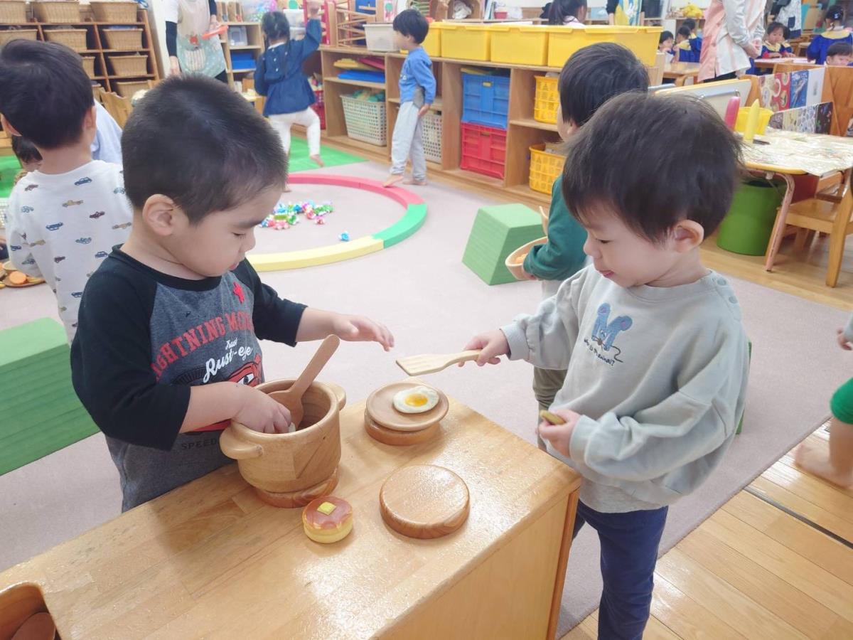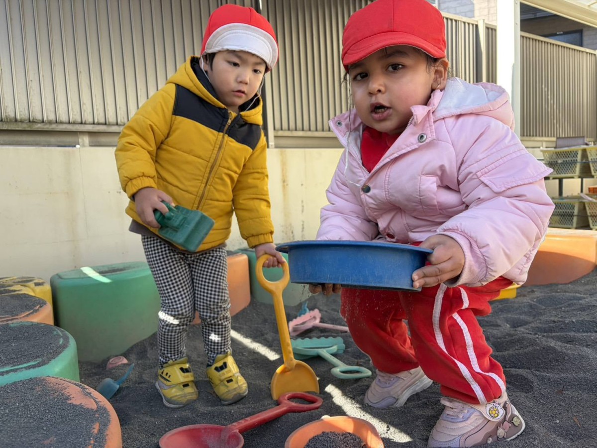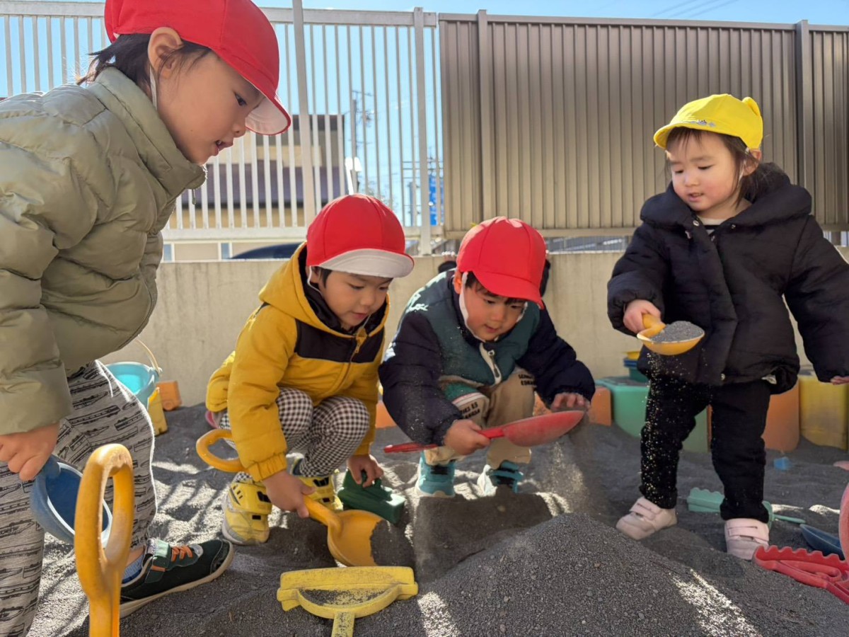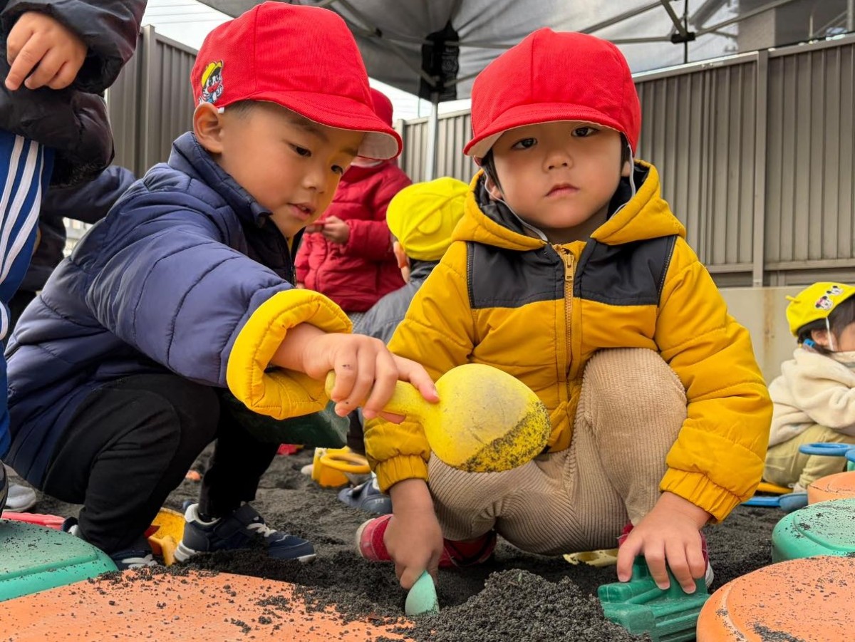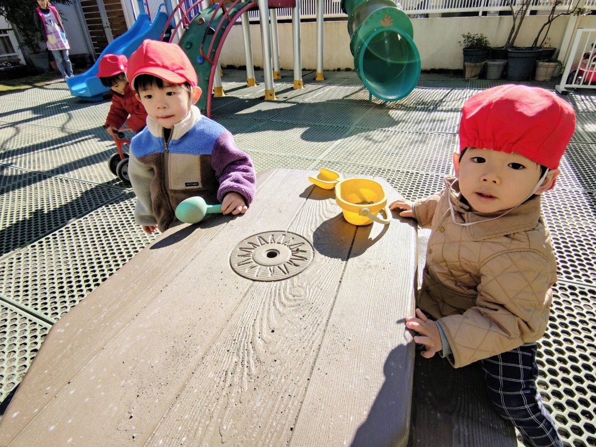| 今日は園庭で遊びました。お砂場でお友達と一緒に穴を掘って楽しむあか組さん。「工事中なんだよ!」と教えてくれました。その様子を見た一人の子が「仲間入れて」と声をかけると「いいよ」と返事をもらい、一緒に遊び始めていました。「貸して」や「仲間入れて」がだいぶ言えるようになっている姿を見て、成長を感じました。 |