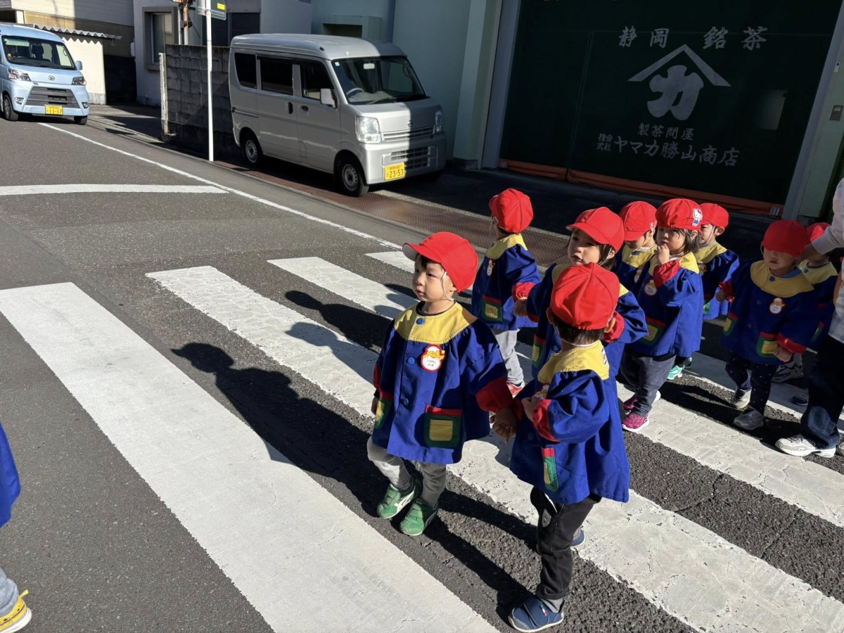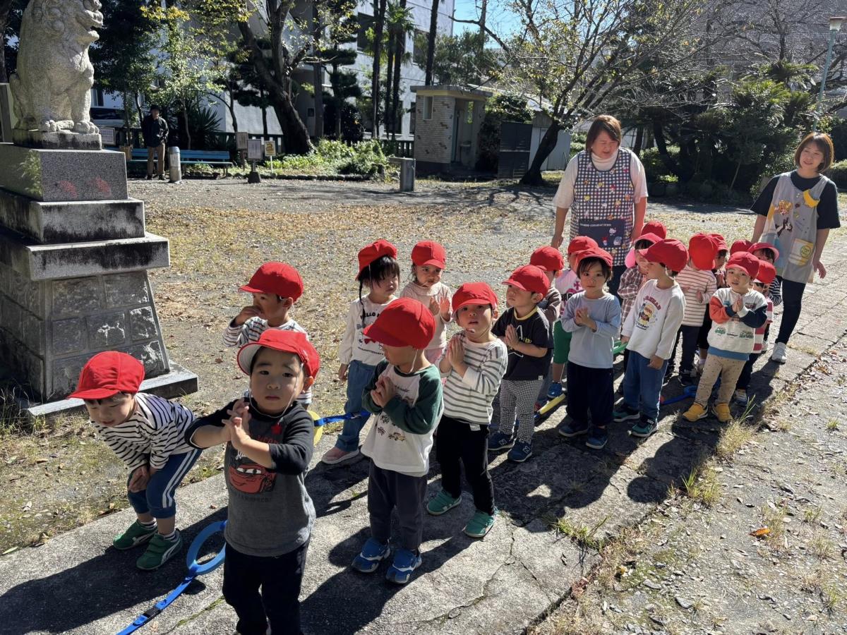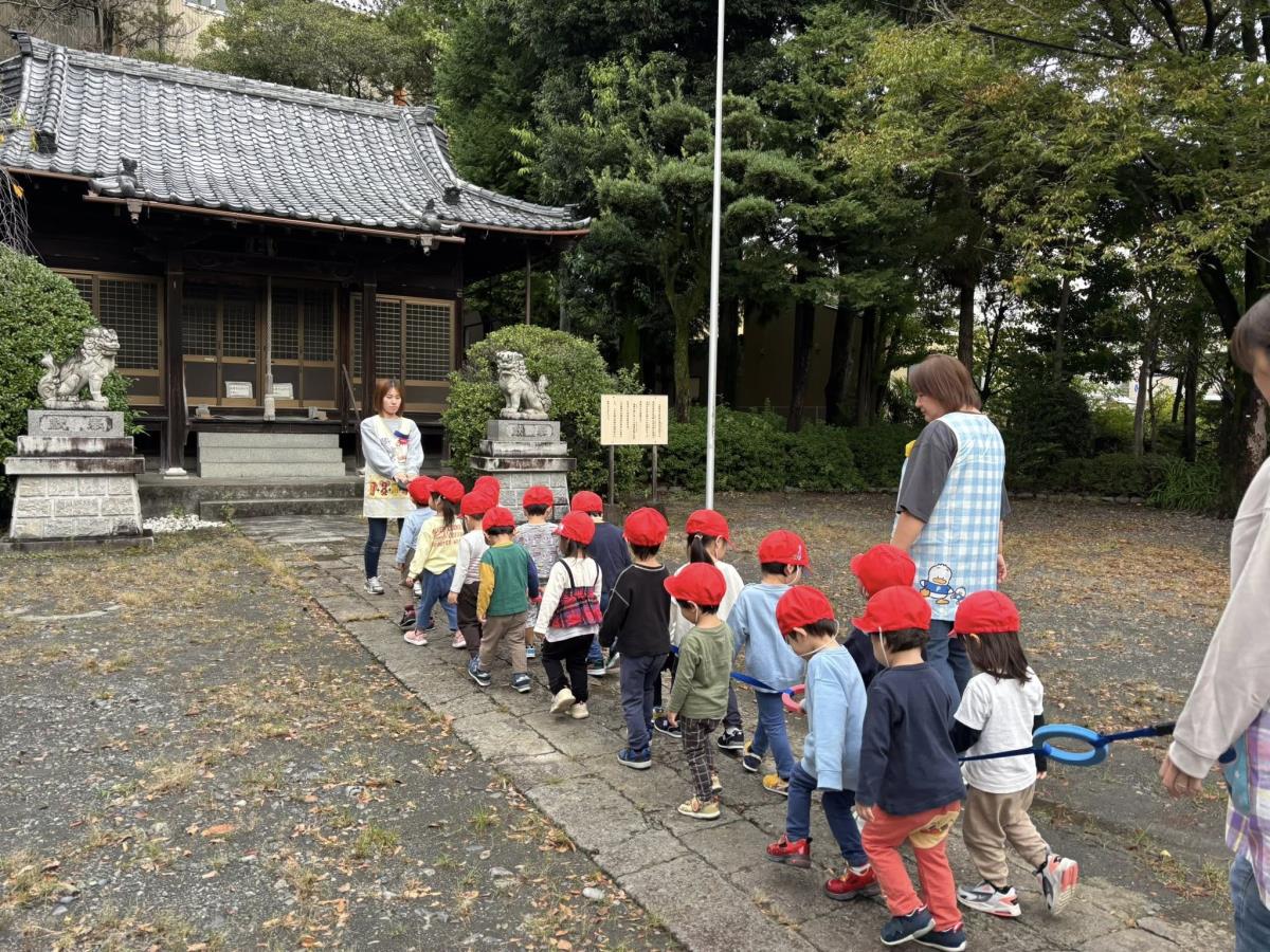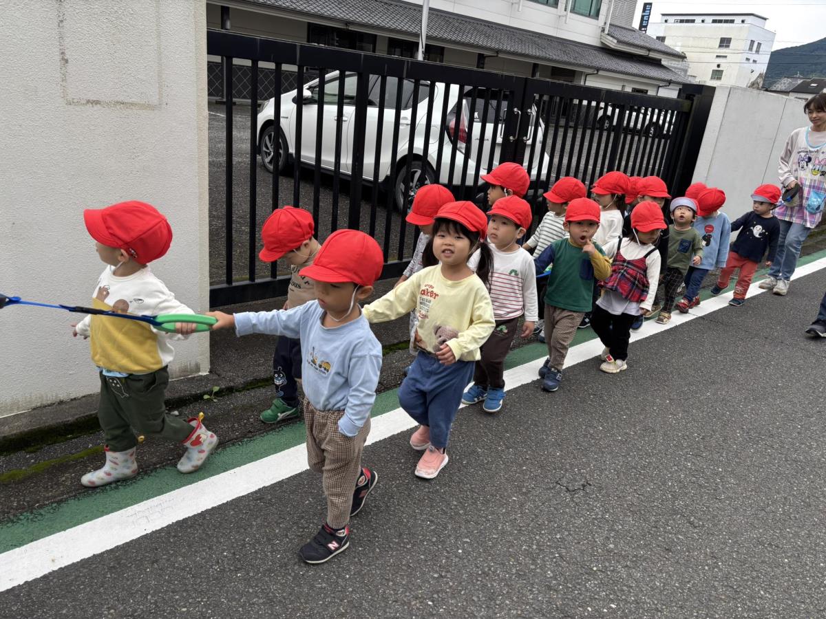 | 今日は大きい通りを通って八雲神社までお散歩に行った後に園庭で遊びました。大きな通りではバスやタクシーを見つけて大喜び!!園庭ではバイクや三輪車で楽しく遊びました。午後のおやつ後にも園庭で遊び、たくさんお外で遊べた1日となりました♪ |