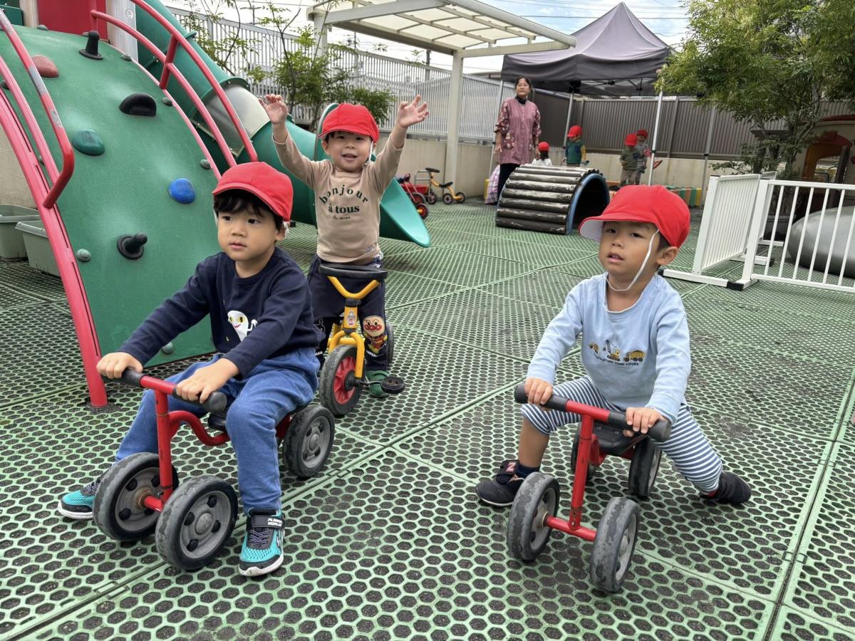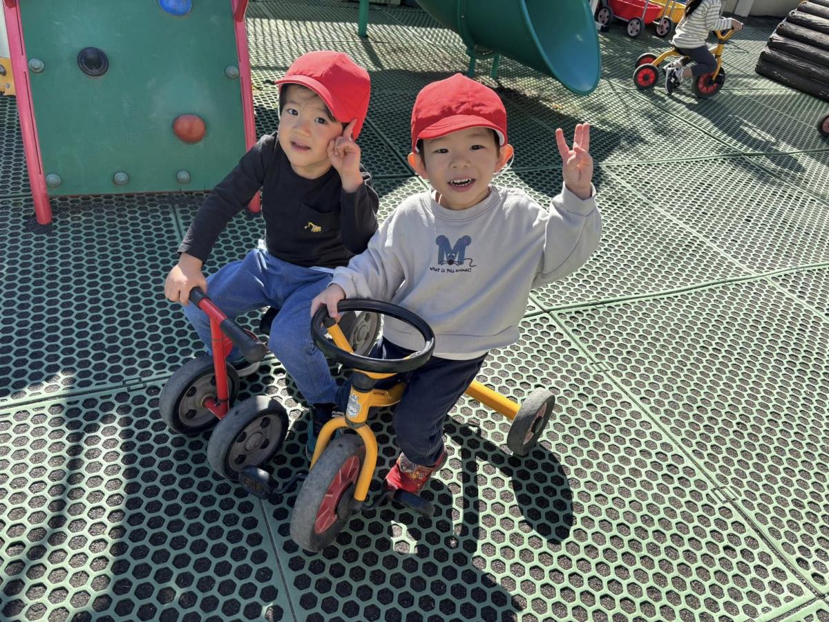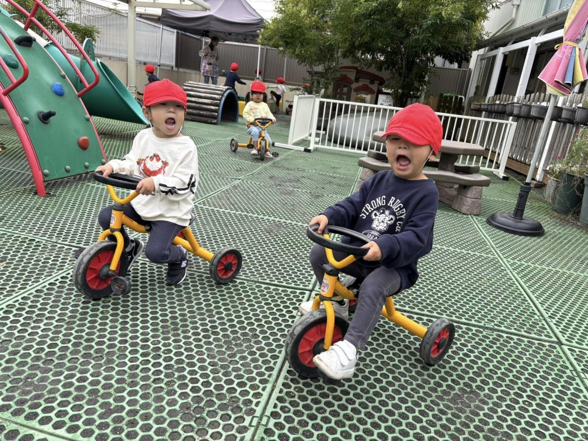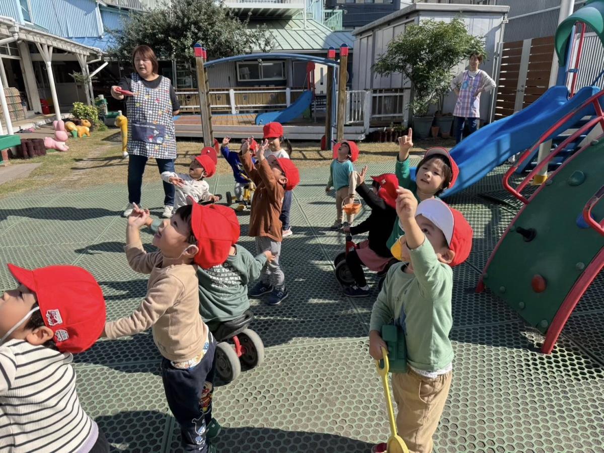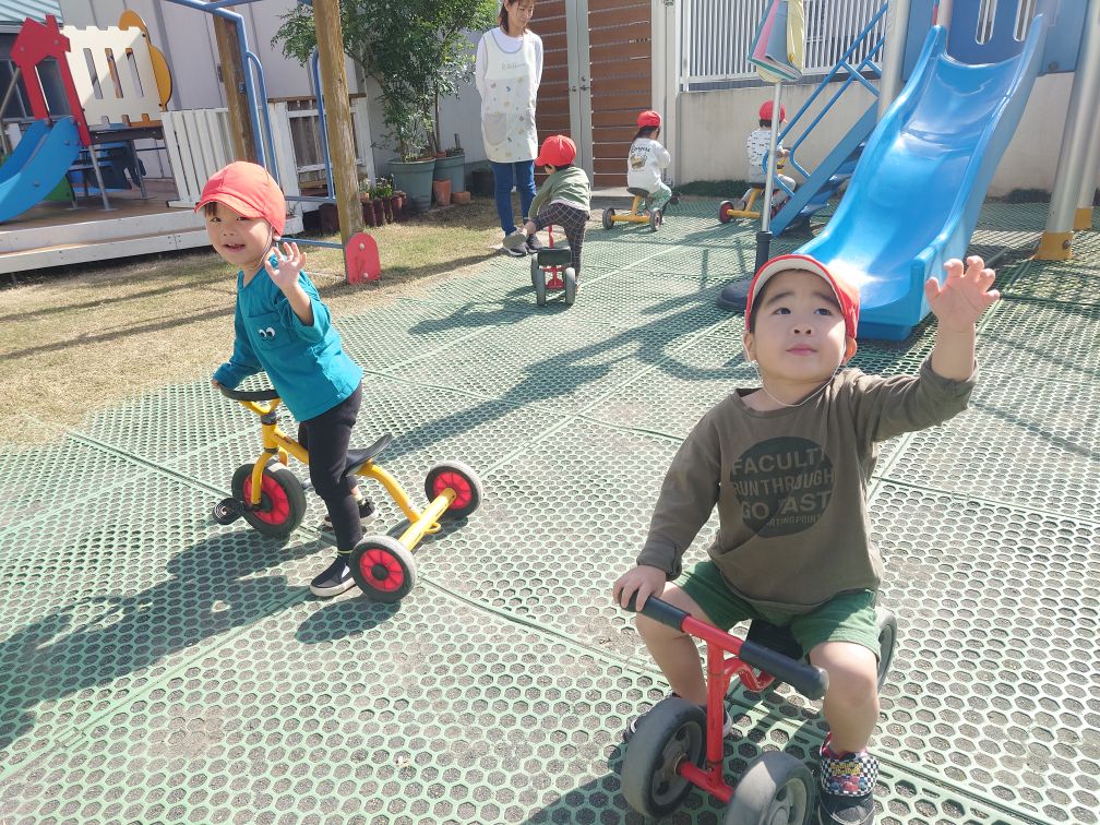 今日は園周辺をお散歩した後に園庭で遊びました。お散歩では色々な働く車を見る事ができたり、お花や金木犀を発見したりして楽しく歩く事ができました!園庭では久しぶりに三輪車等の乗り物で遊ぶ事ができたのでとっても嬉しそうに遊んでいました♪
