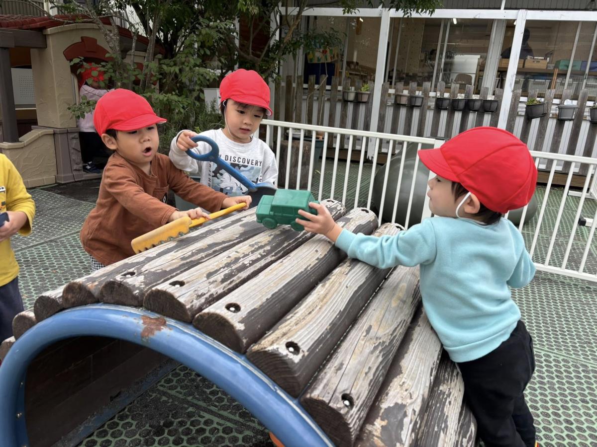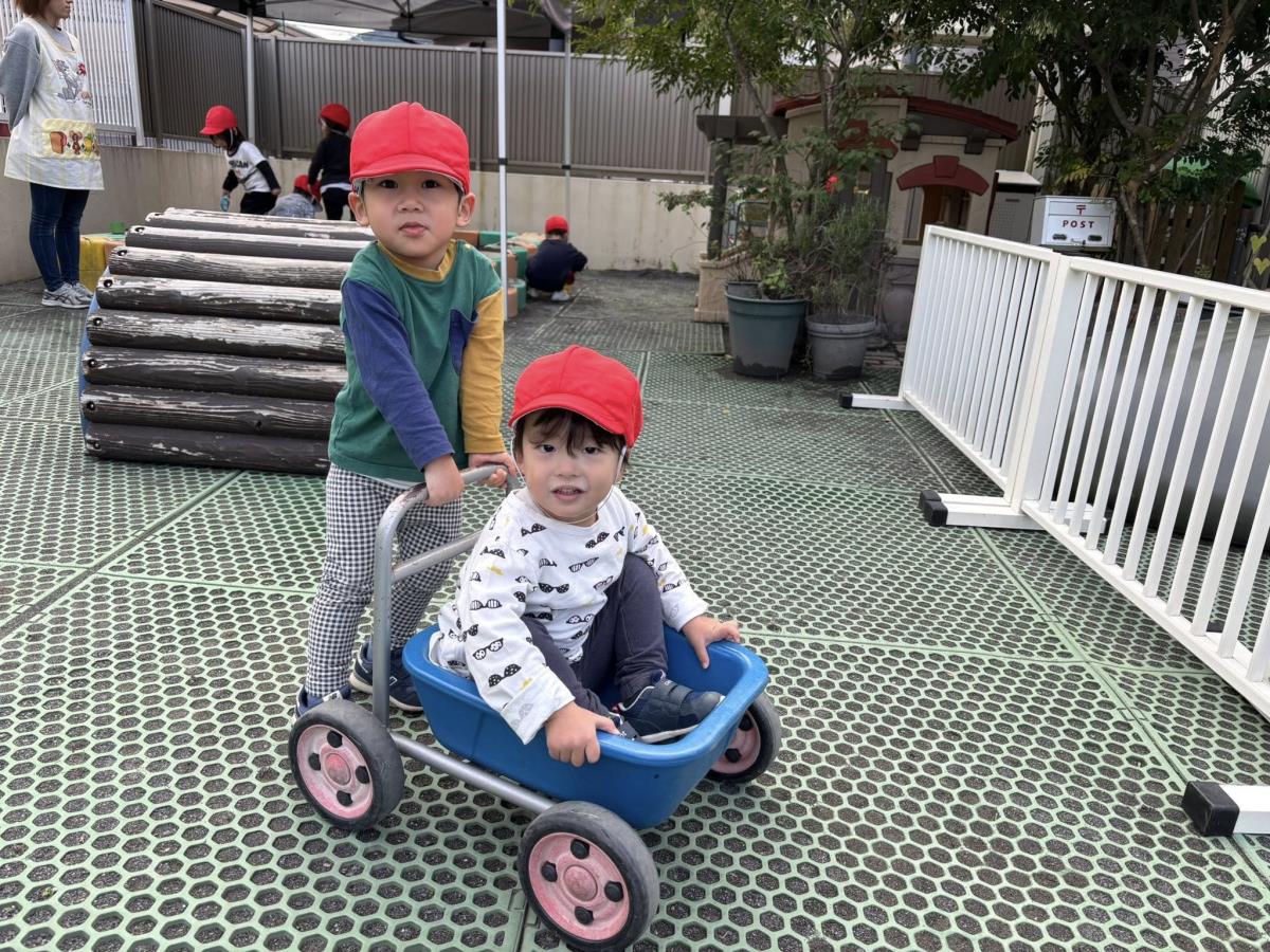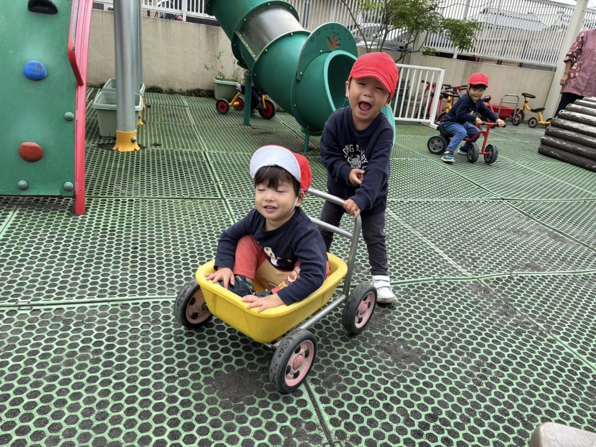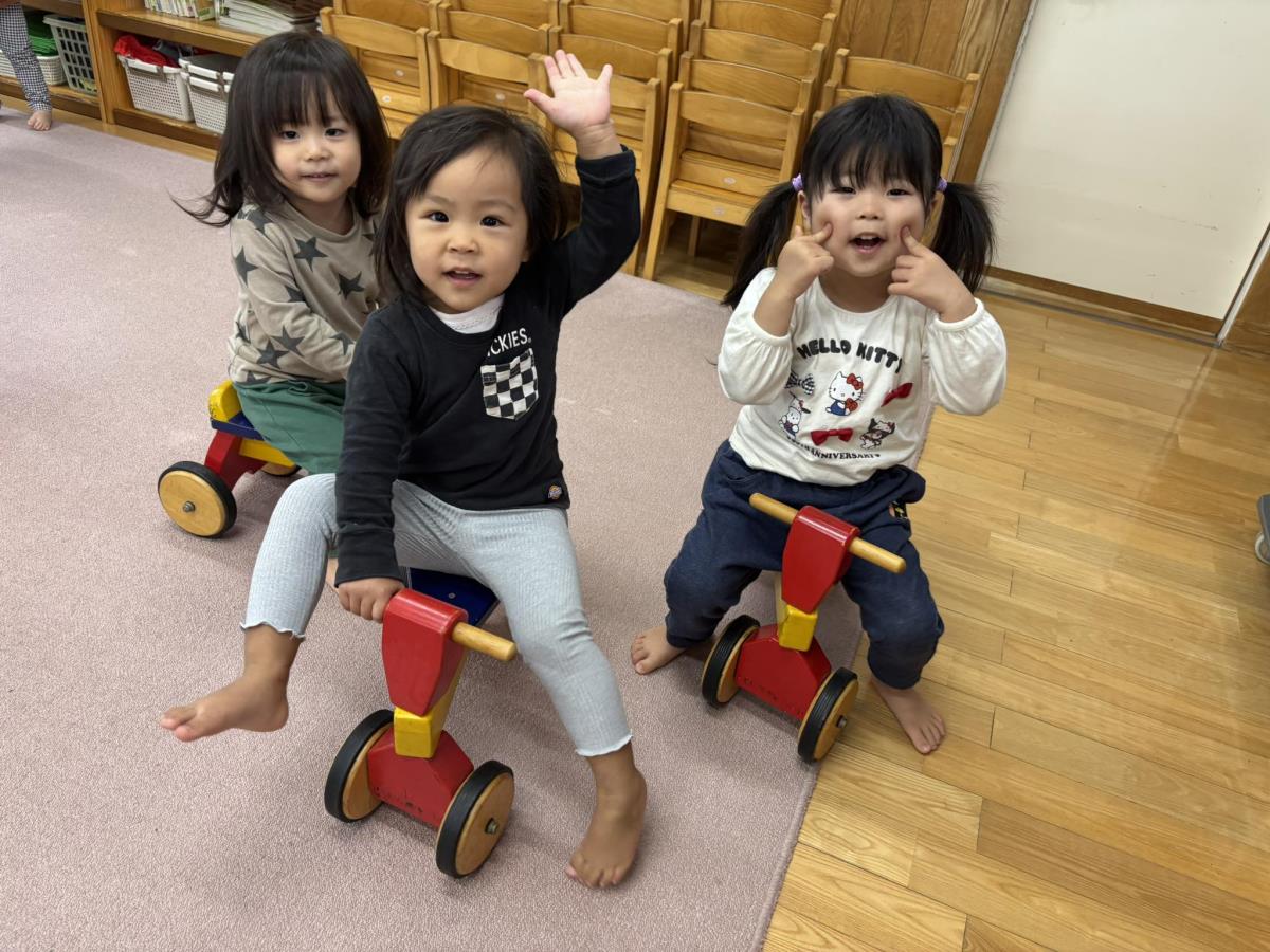 今日は園周辺をお散歩した後に園庭で遊びました。お散歩では色々な働く車を見る事ができたり、お花や金木犀を発見したりして楽しく歩く事ができました!園庭では久しぶりに三輪車等の乗り物で遊ぶ事ができたのでとっても嬉しそうに遊んでいました♪
