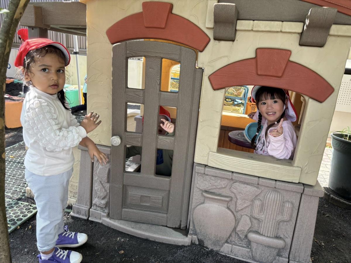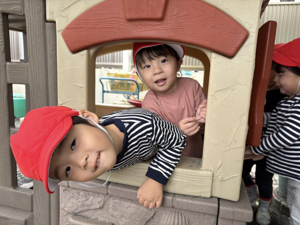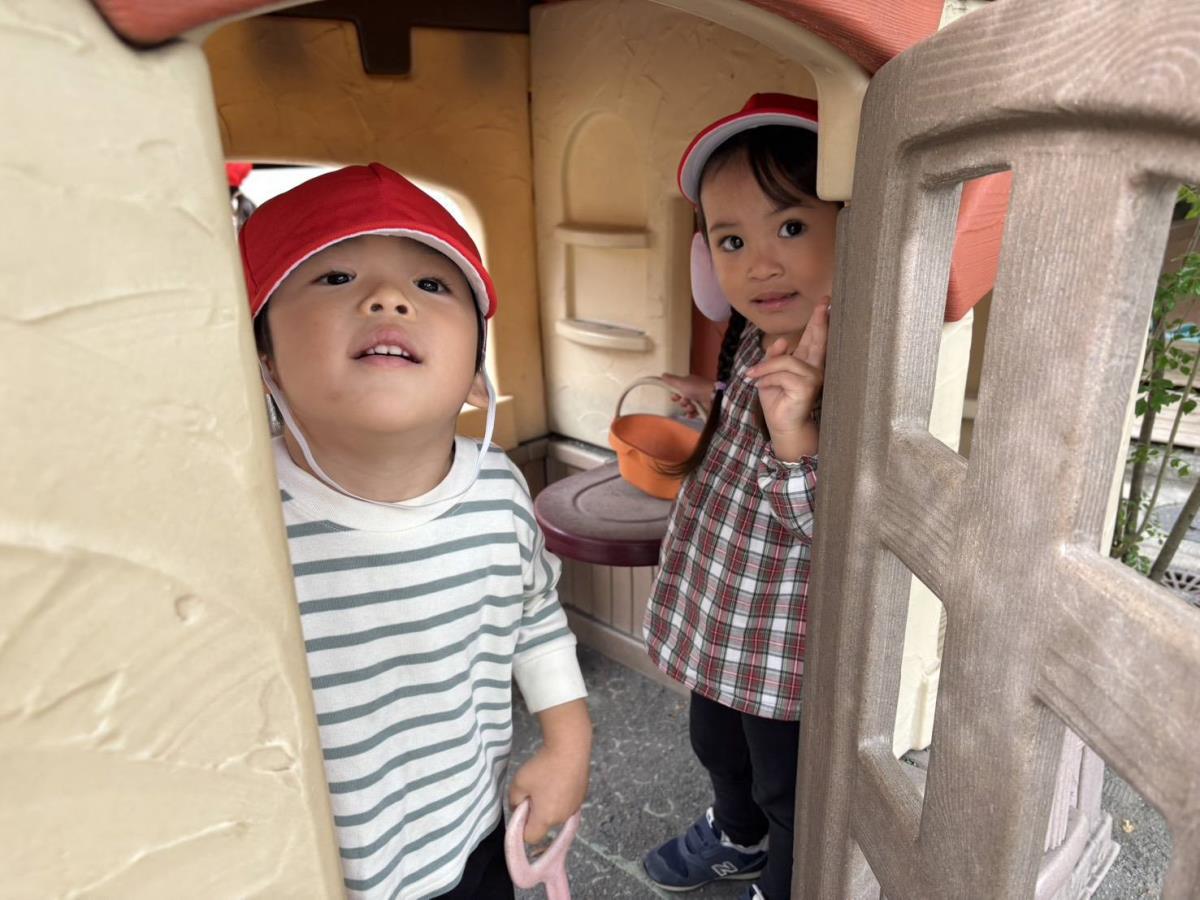 今日は園庭で遊びました。久しぶりのお砂場やスモールハウスで思いきり遊ぶ事ができてとっても嬉しそうなあか組さん!お友だちを誘ってスモールハウスに入ったりお砂場でお山を作ったりして楽しんでいました。