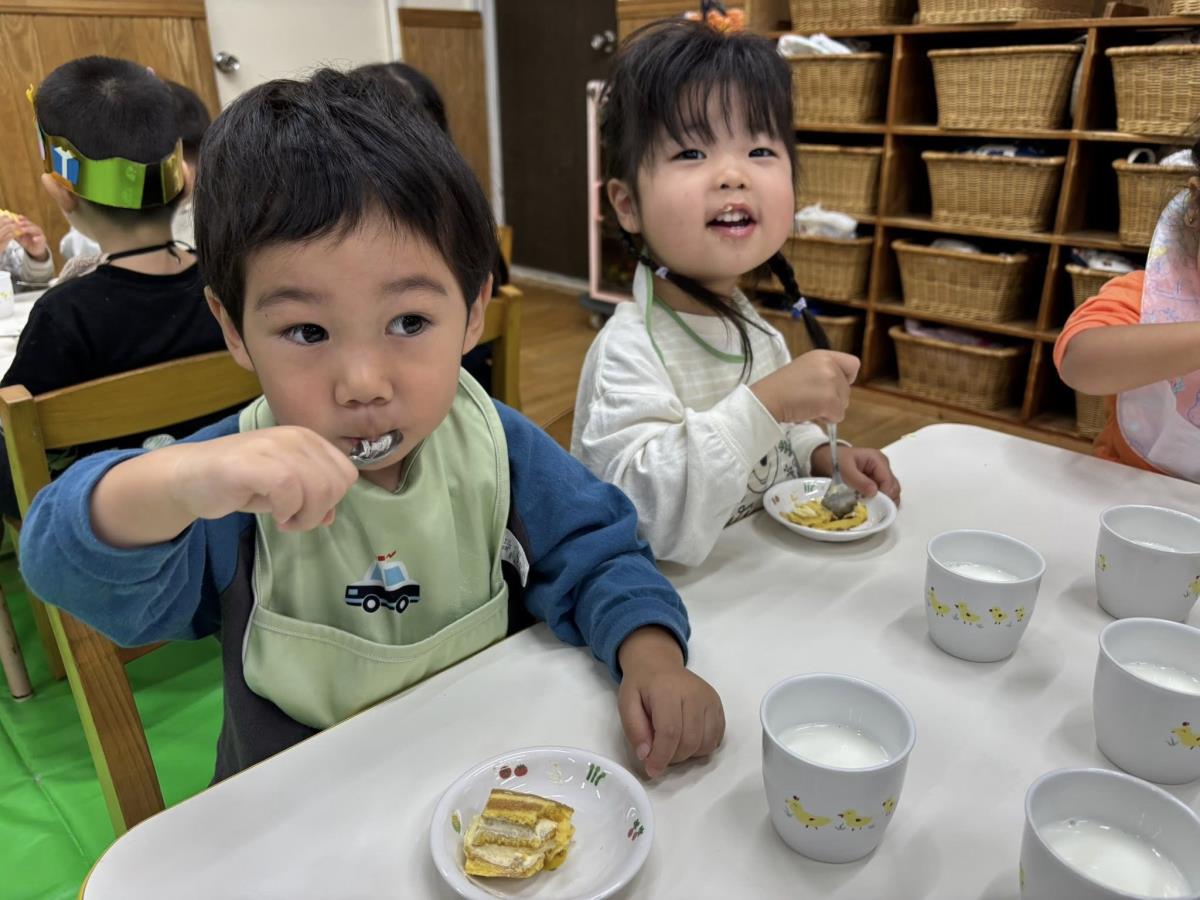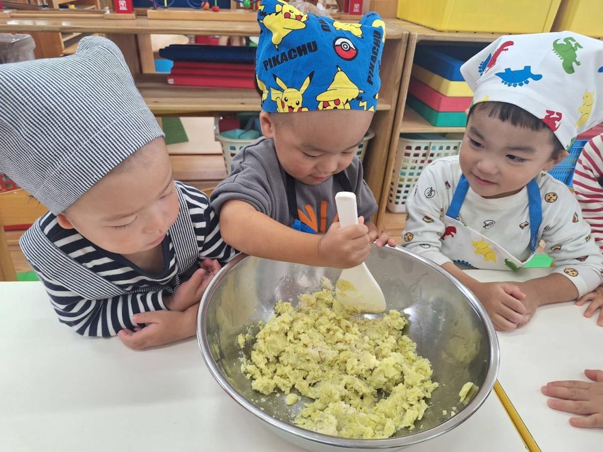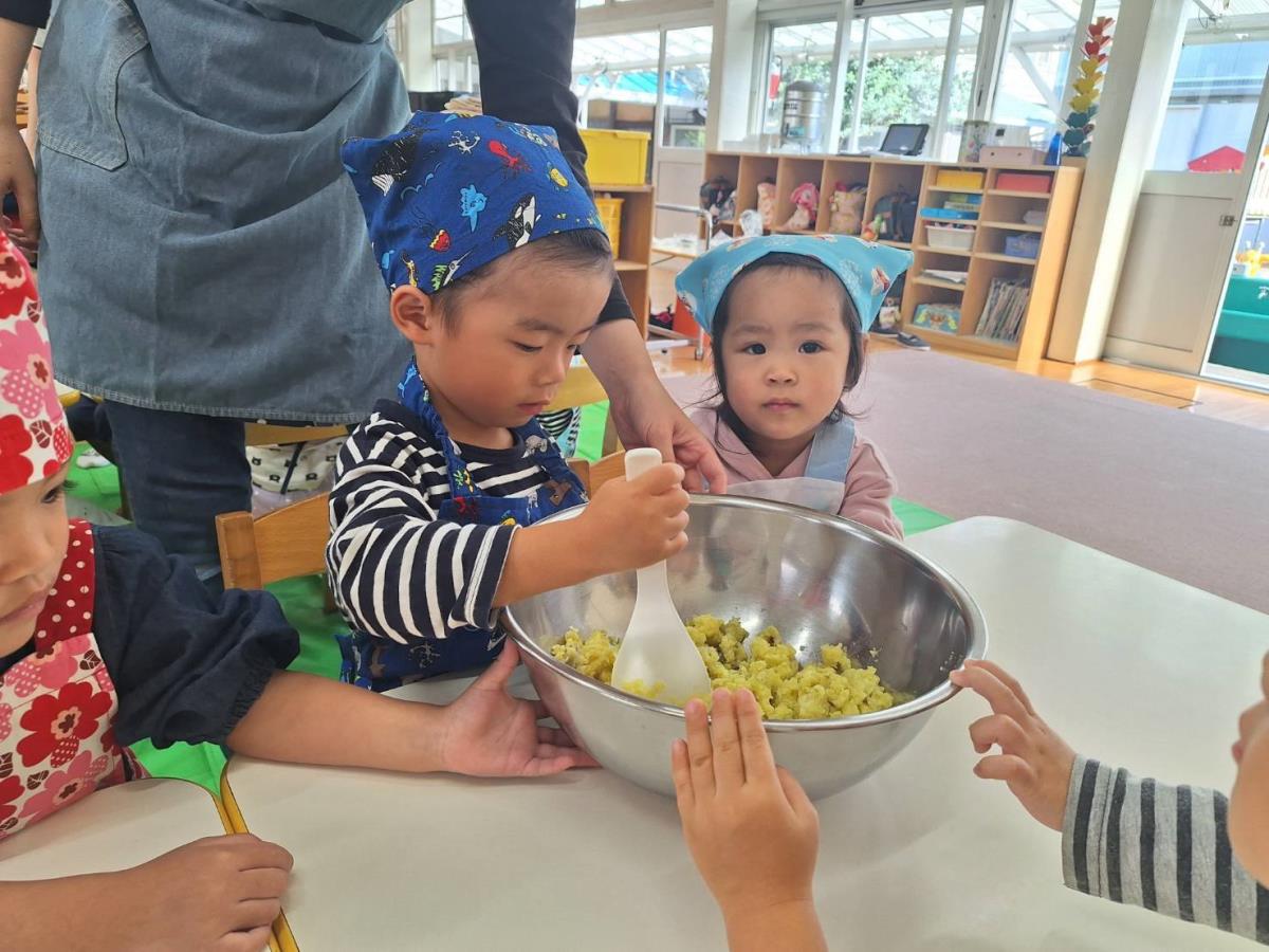 | 今日は午前中は園庭で遊び、午後はクッキングでスイートポテトを作りました。保育士と一緒にお芋を潰したりお砂糖や生クリームを入れたりしました。「僕もやるー!」とやる気満々なあか組さん、完成するのを今か今かと期待して待っていました。自分たちで作ったスイートポテトをおいしそうに食べ、おかわりも沢山していました。 |