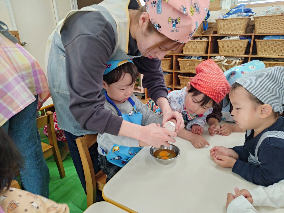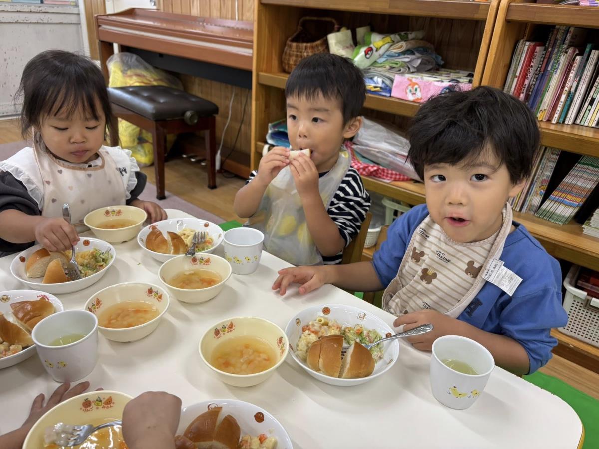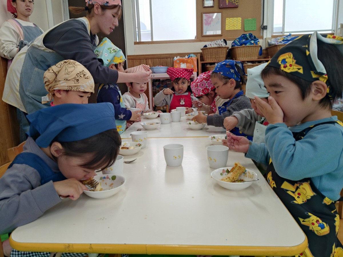 | 今日は午前中は園庭で遊び、午後はクッキングでスイートポテトを作りました。保育士と一緒にお芋を潰したりお砂糖や生クリームを入れたりしました。「僕もやるー!」とやる気満々なあか組さん、完成するのを今か今かと期待して待っていました。自分たちで作ったスイートポテトをおいしそうに食べ、おかわりも沢山していました。 |