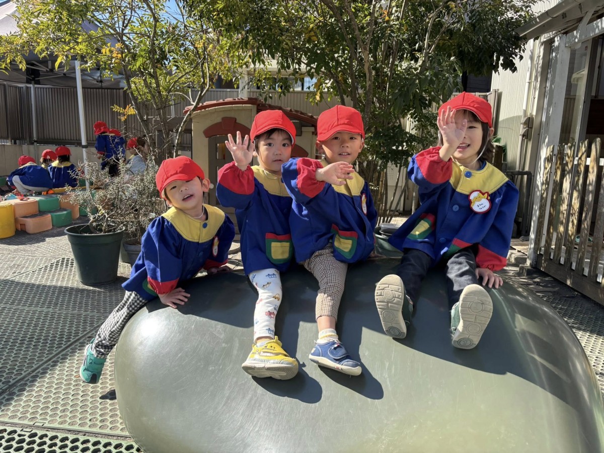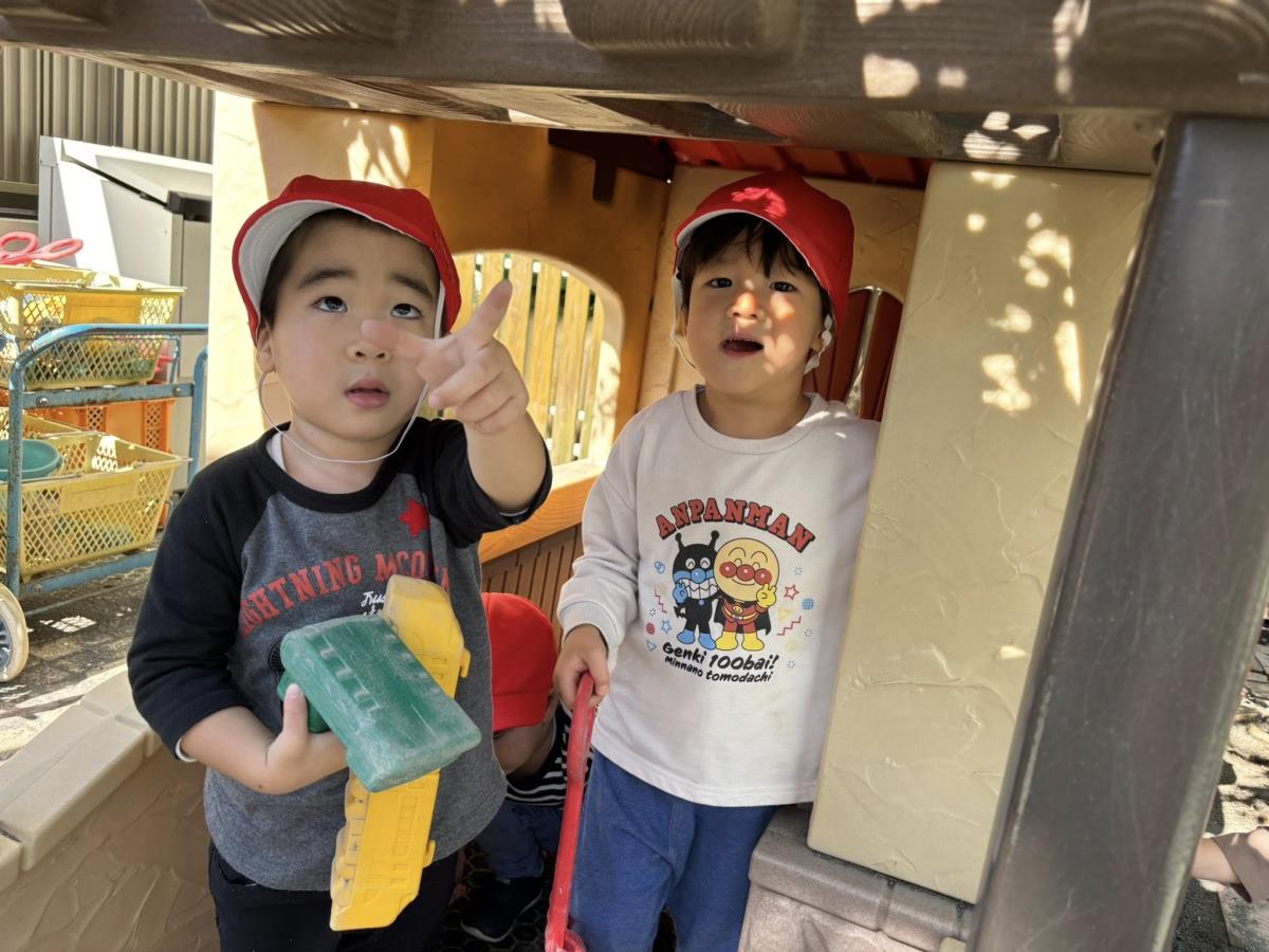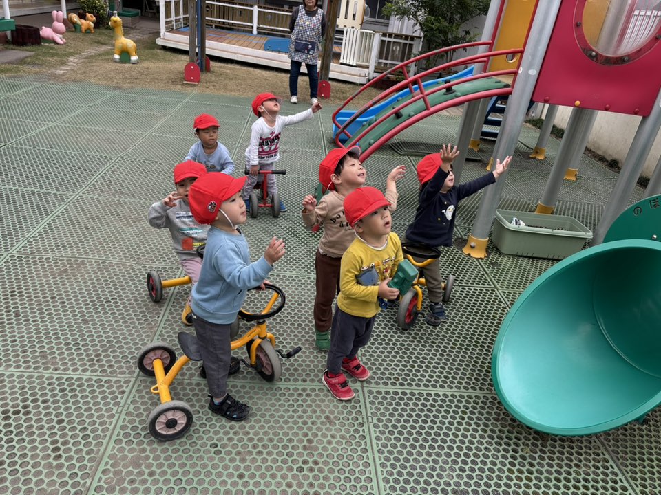 今日は、園庭で遊びました。三輪車に乗っている最中に飛行機が飛んでいることに気がついたあか組さん。「あっ!飛行機!」「おーい!」「ばいばーい!」と、嬉しそうに一生懸命手を振っている姿が可愛らしかったです。