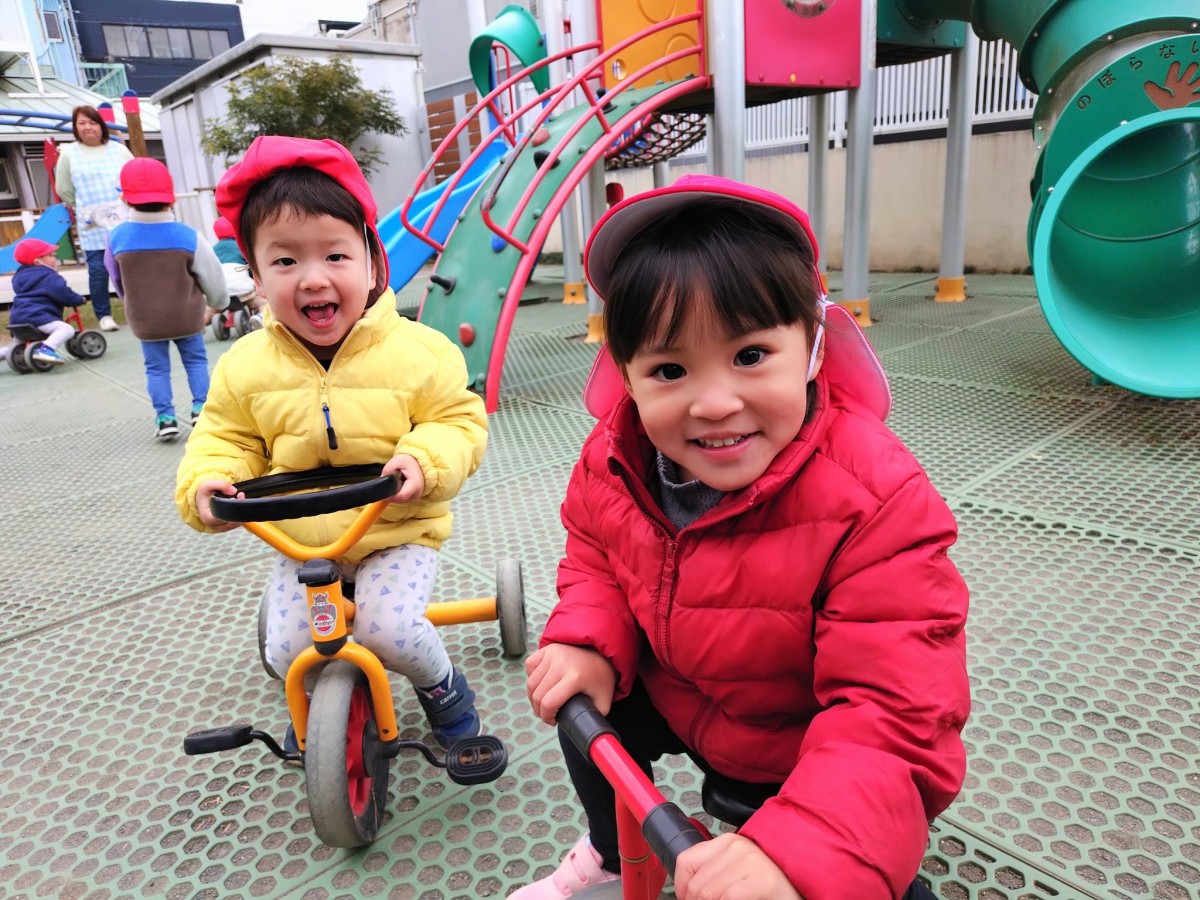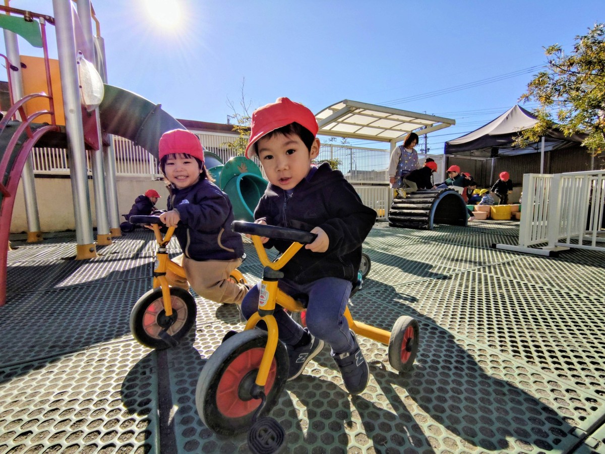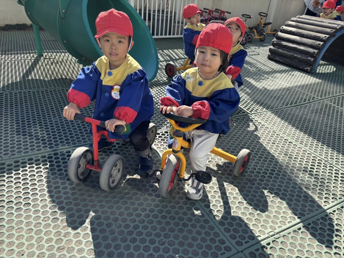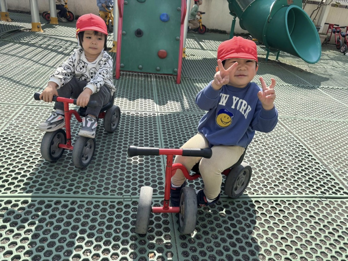 | 今日は園庭で遊びました。三輪車と四輪車が大好きなあか組さん。保育士と目が合うと「お仕事行ってくるね!」「ばいばーい!」と言い、園庭を何周も駆け回っていました。他にもデッキの滑り台では他のお友達と窓から顔を見合わせ笑い合う姿も見られました。 |
