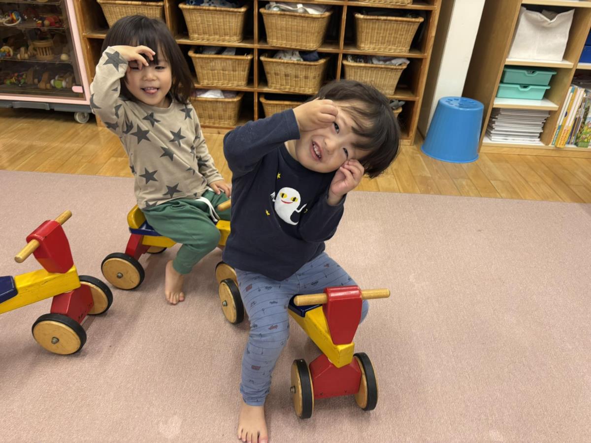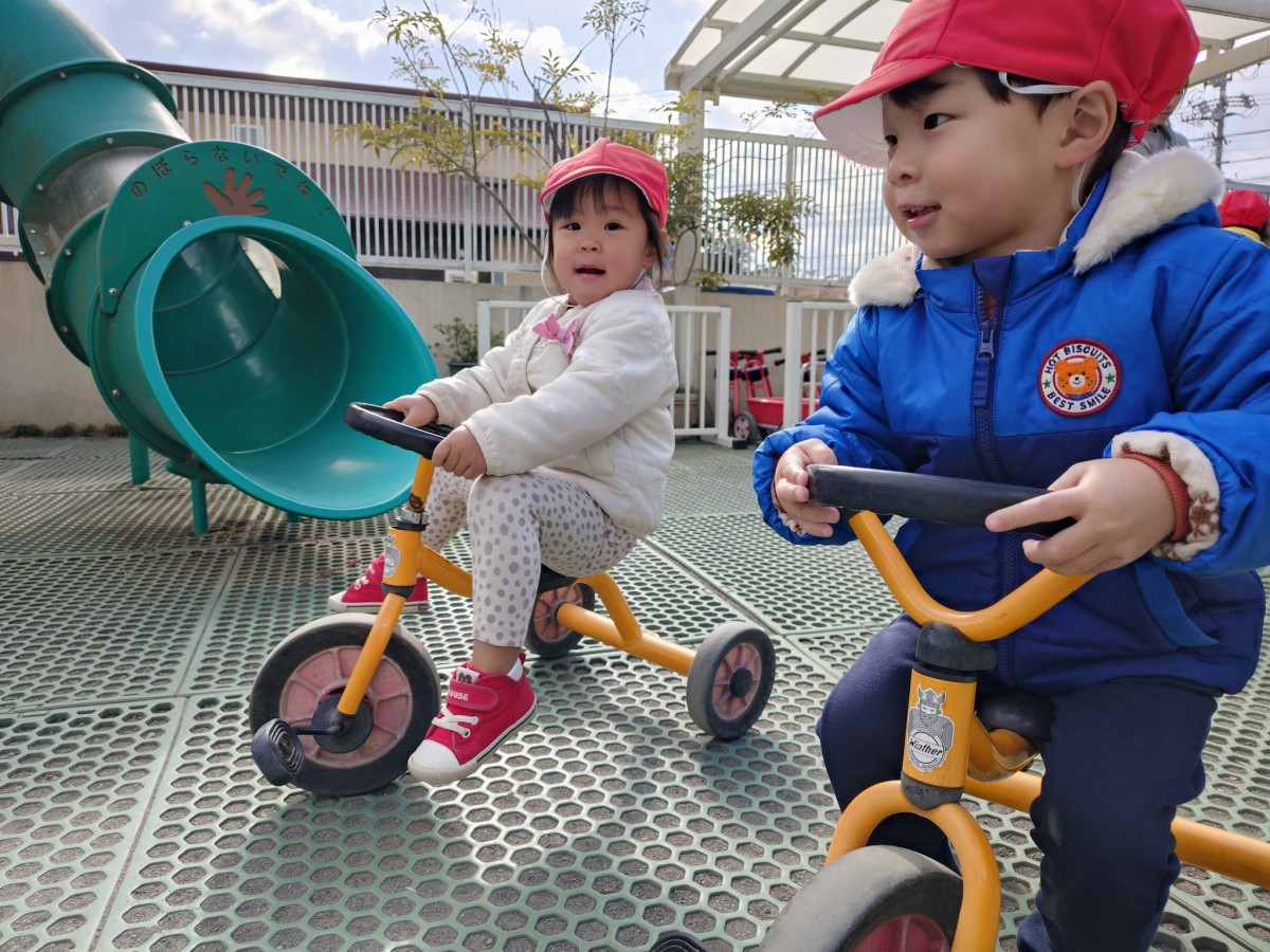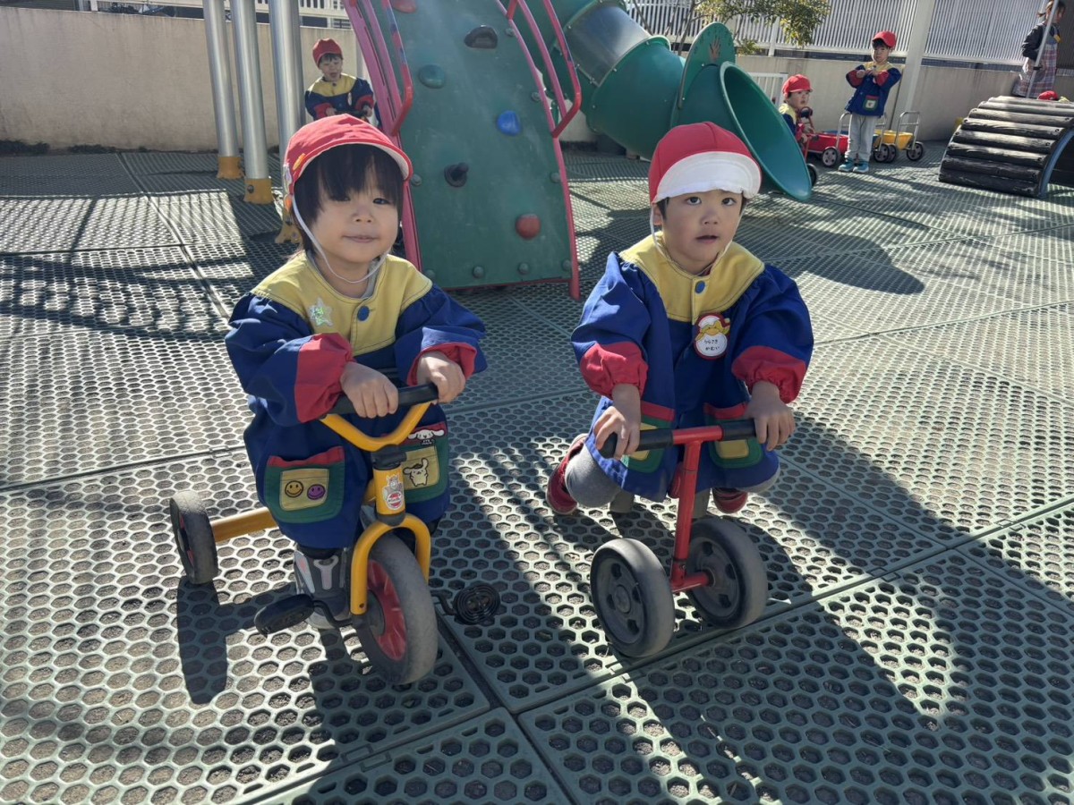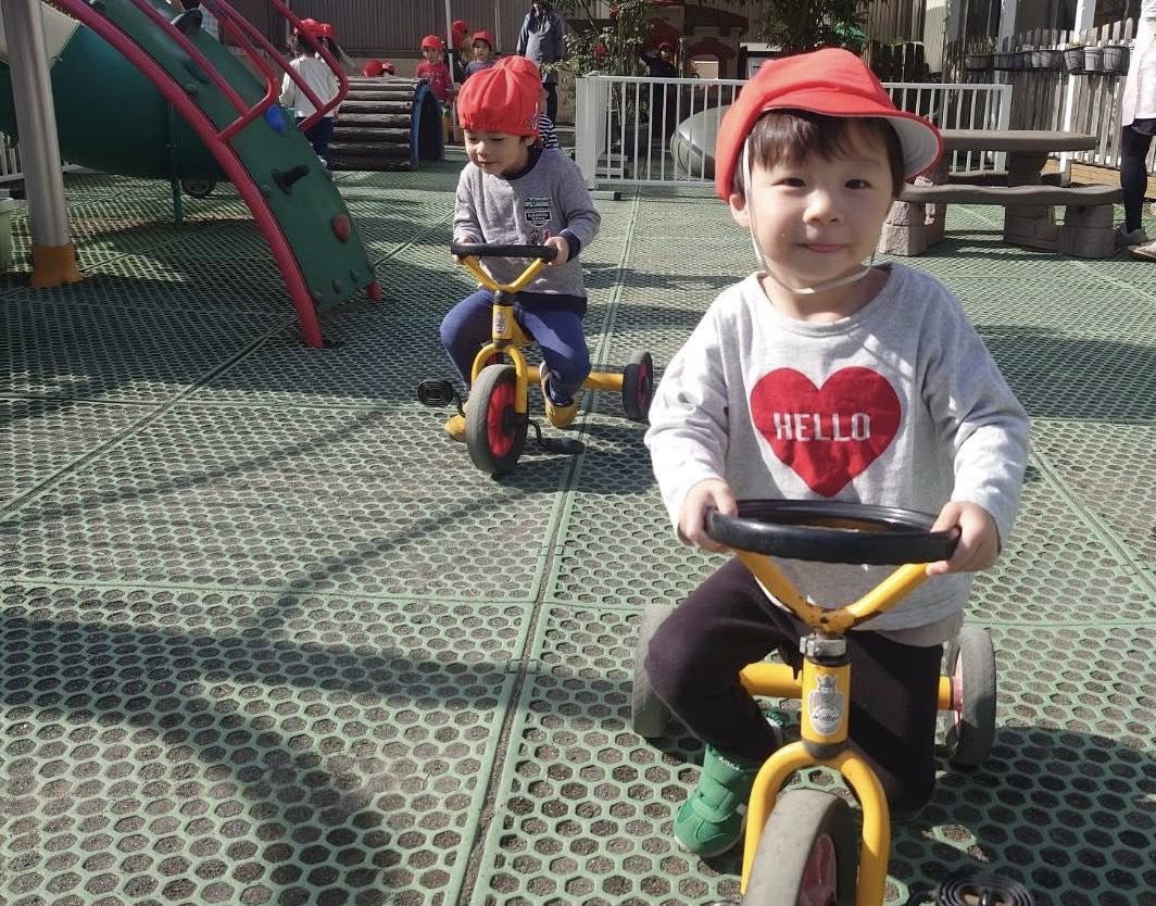 | 今日は園庭で遊びました。三輪車と四輪車が大好きなあか組さん。保育士と目が合うと「お仕事行ってくるね!」「ばいばーい!」と言い、園庭を何周も駆け回っていました。他にもデッキの滑り台では他のお友達と窓から顔を見合わせ笑い合う姿も見られました。 |