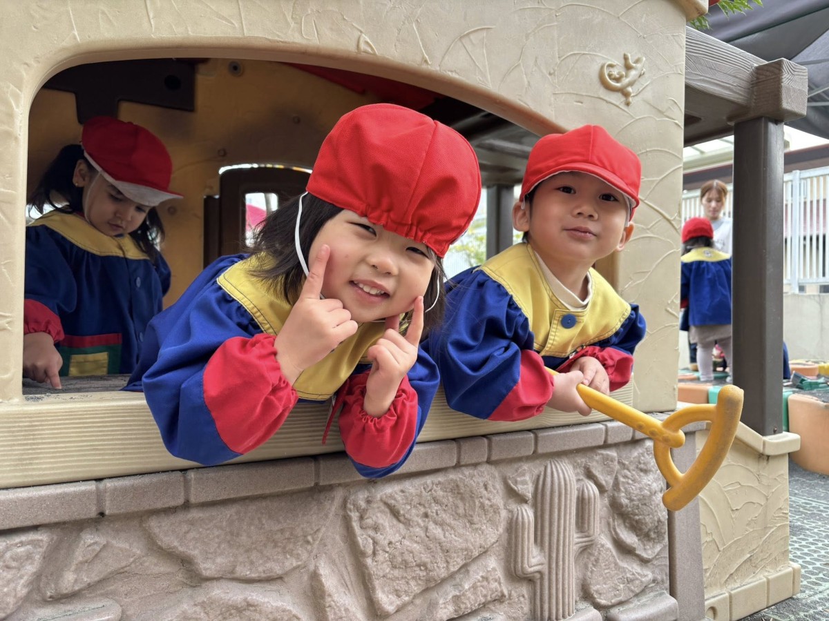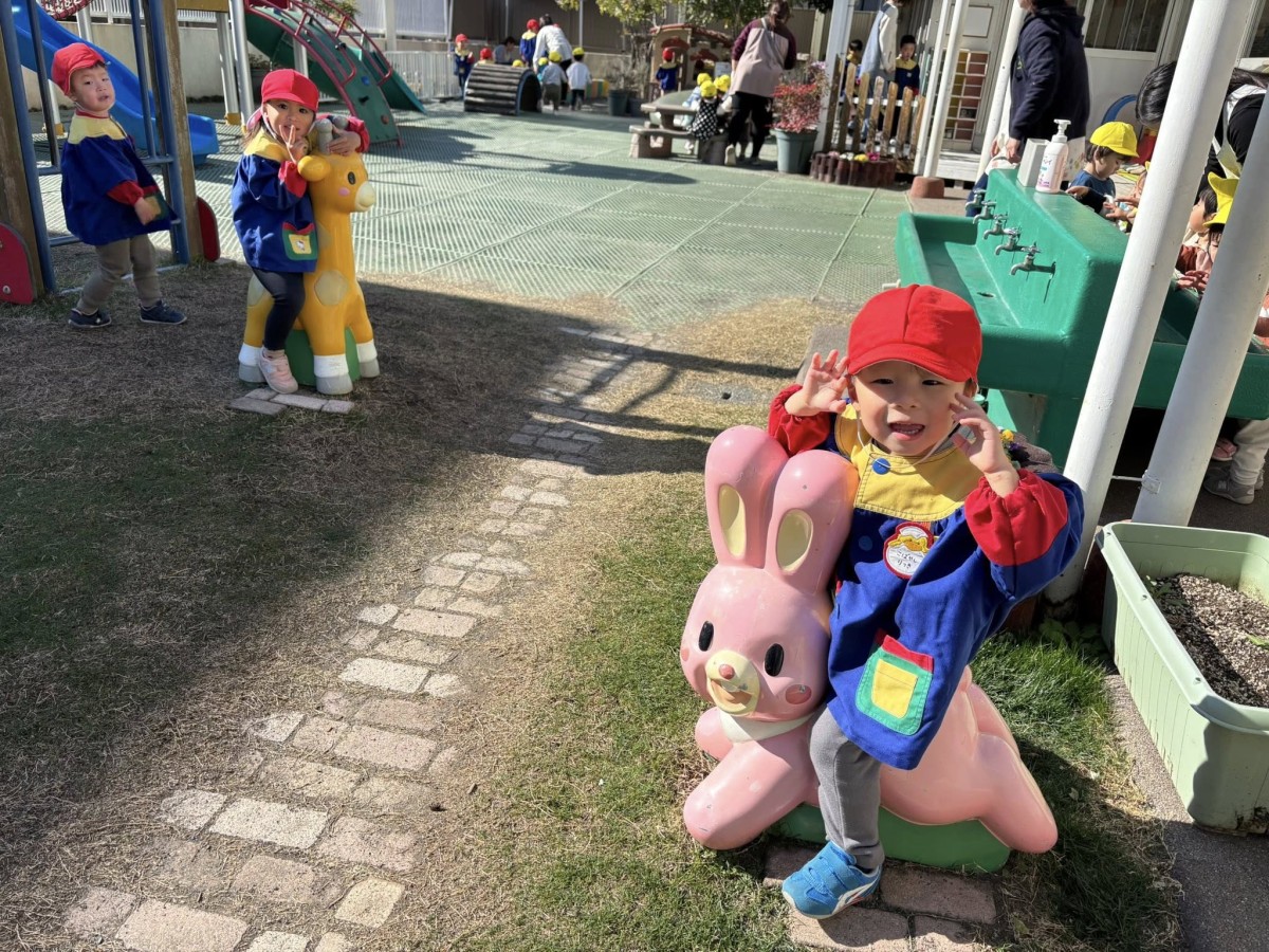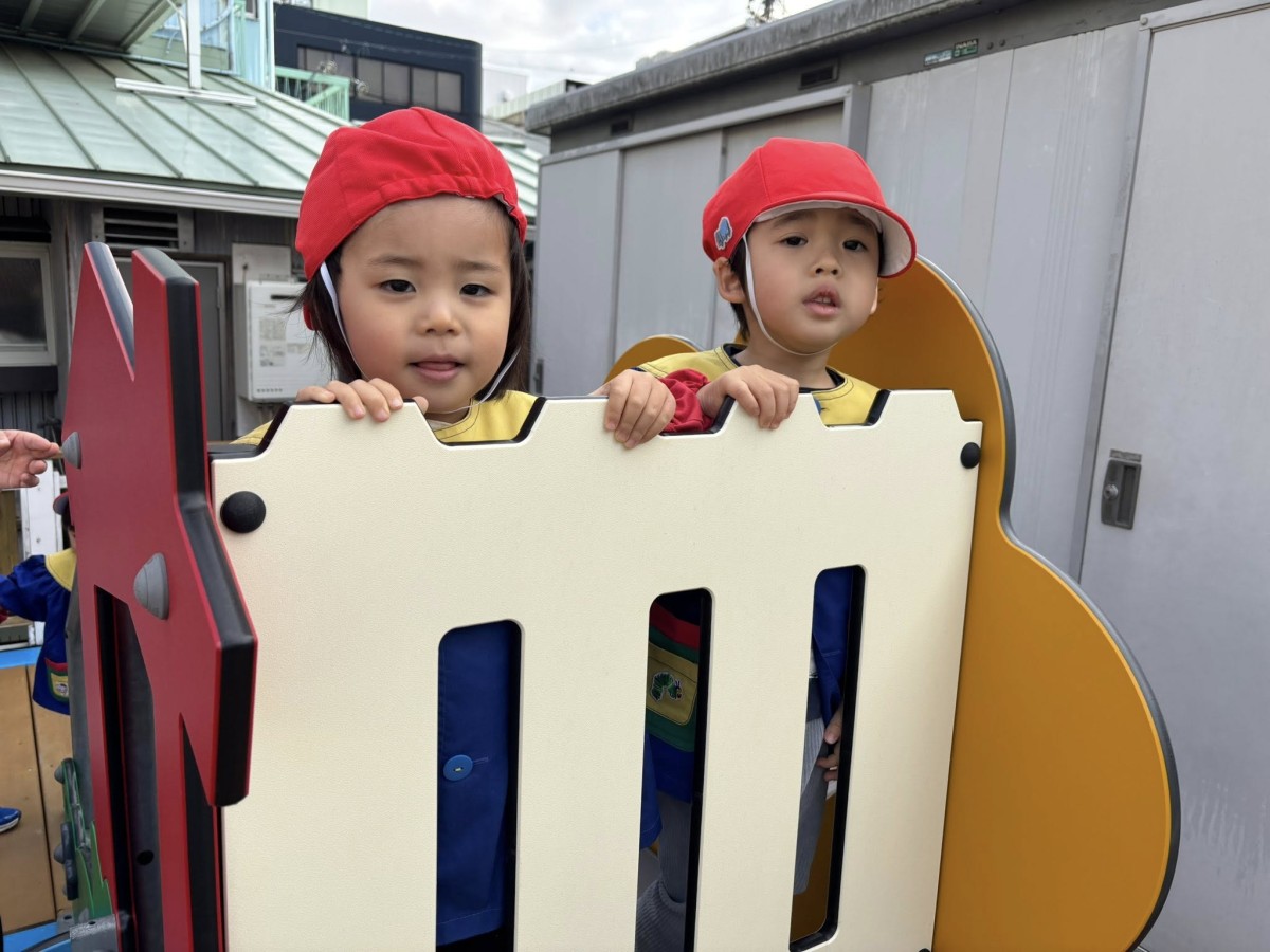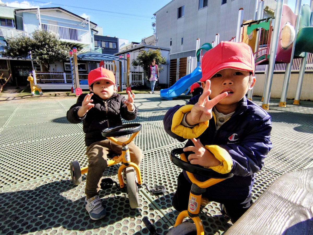 | 今日は園庭で遊びました。三輪車と四輪車が大好きなあか組さん。保育士と目が合うと「お仕事行ってくるね!」「ばいばーい!」と言い、園庭を何周も駆け回っていました。他にもデッキの滑り台では他のお友達と窓から顔を見合わせ笑い合う姿も見られました。 |