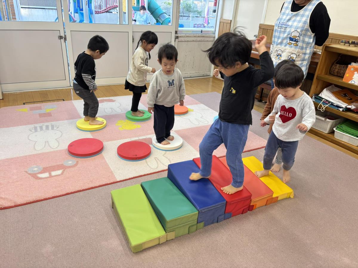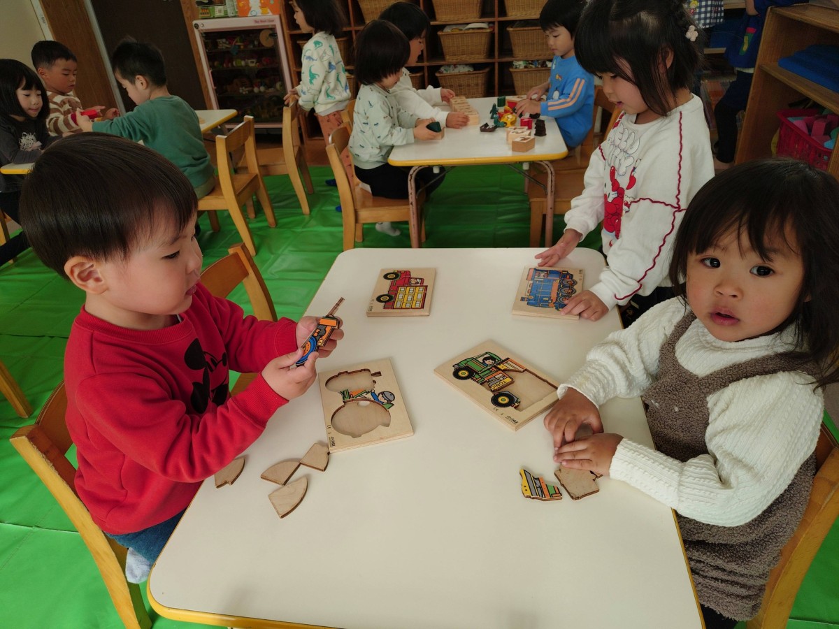 今日は園周辺をお散歩した後にお部屋でパズルや車のおもちゃで遊びました。お散歩ではバスやミキサー車、ダンプカーと働く車をたくさん見る事ができて大喜びでした!八雲神社まで行きお参りをして帰ってきました。お散歩では色々な発見が多くお話も弾んで楽しく歩く事ができています♪