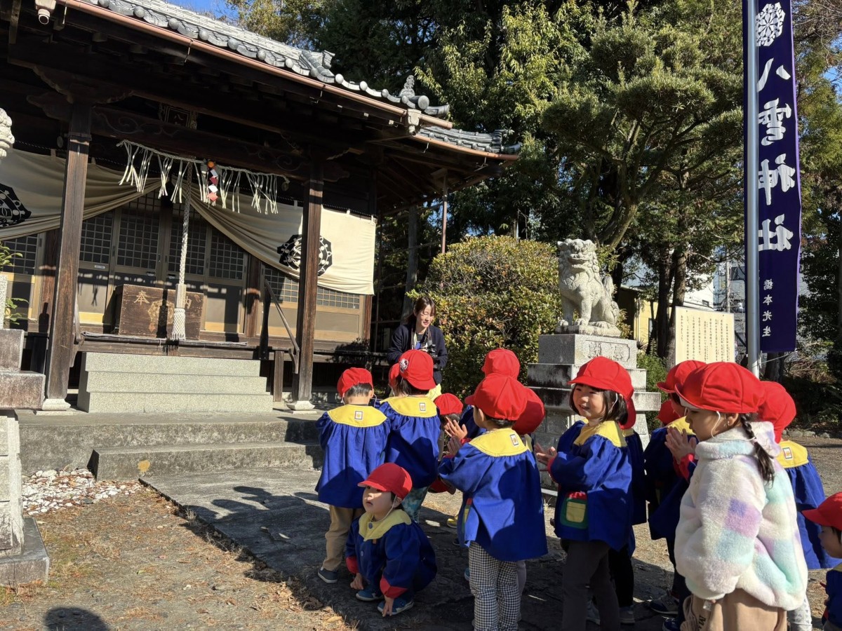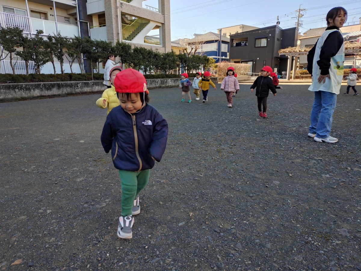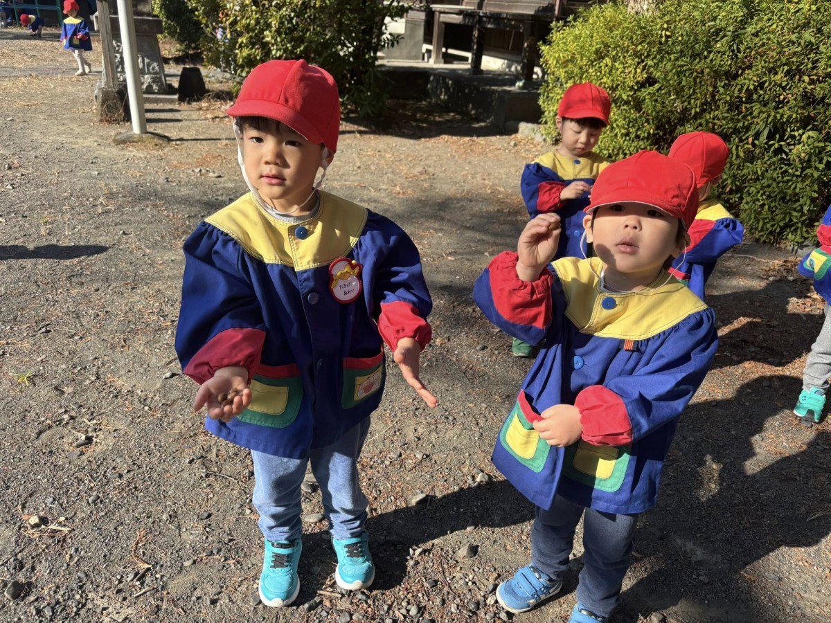 あけましておめでとうございます。今年もよろしくお願い致します。 今日は手を繋いで八雲神社までお散歩に行ってきました。お参りをした後は遊具で遊んだり、どんぐり拾いや葉っぱをふわっとさせて楽しんでいました。今日は久しぶりの保育園でお話したい事がたくさんあるお友だちが多くみんなお話が盛り上がっていました! 年賀の式にも参加し、静かにお話を聞く事ができて代表のお友だちが父母会さんからのお年玉をいただきました。