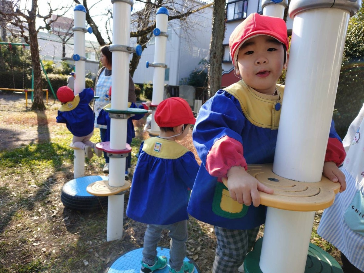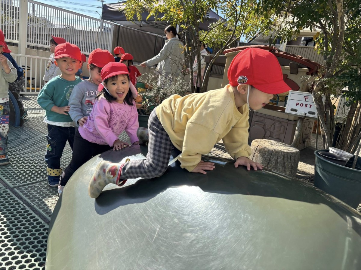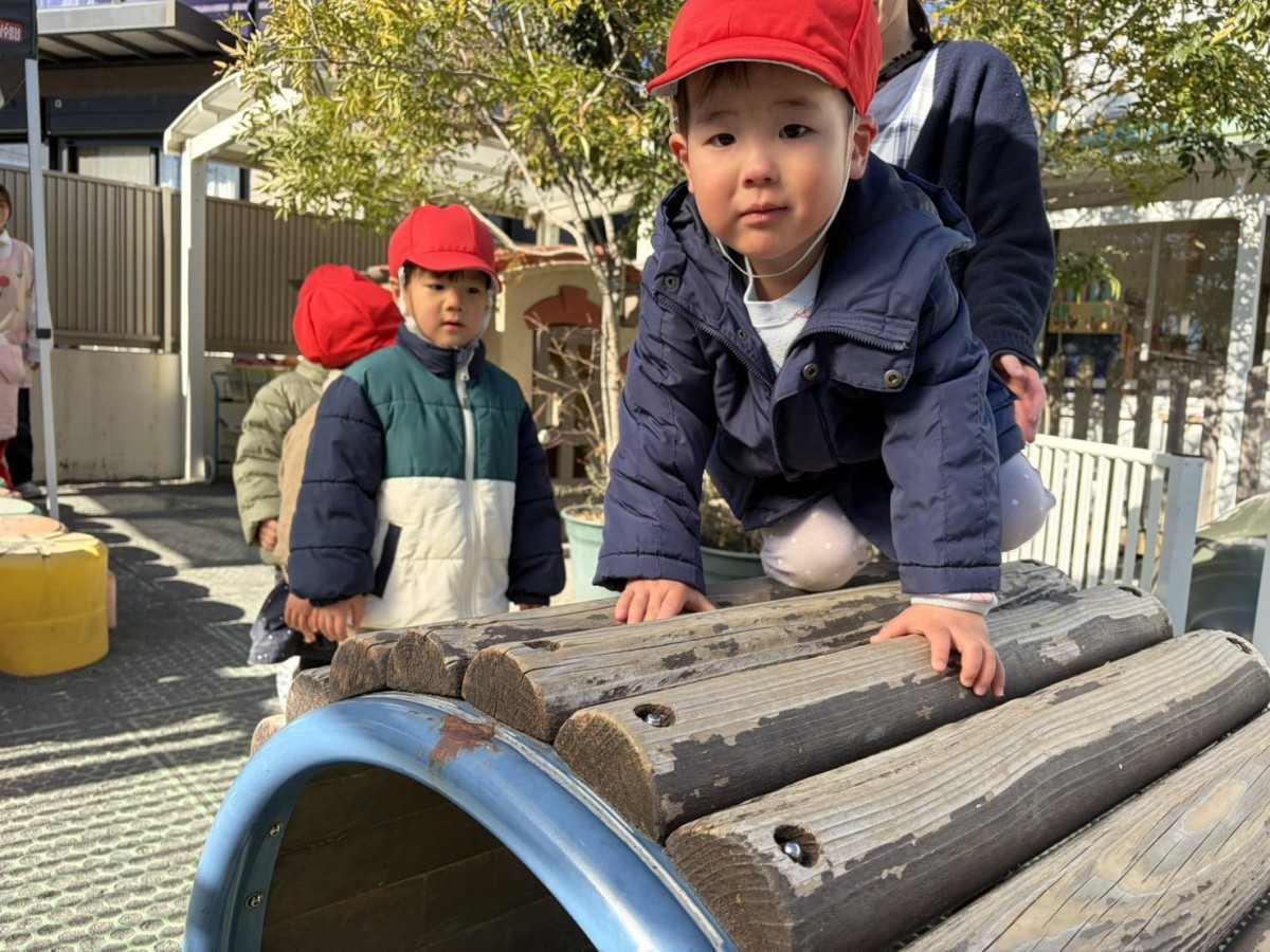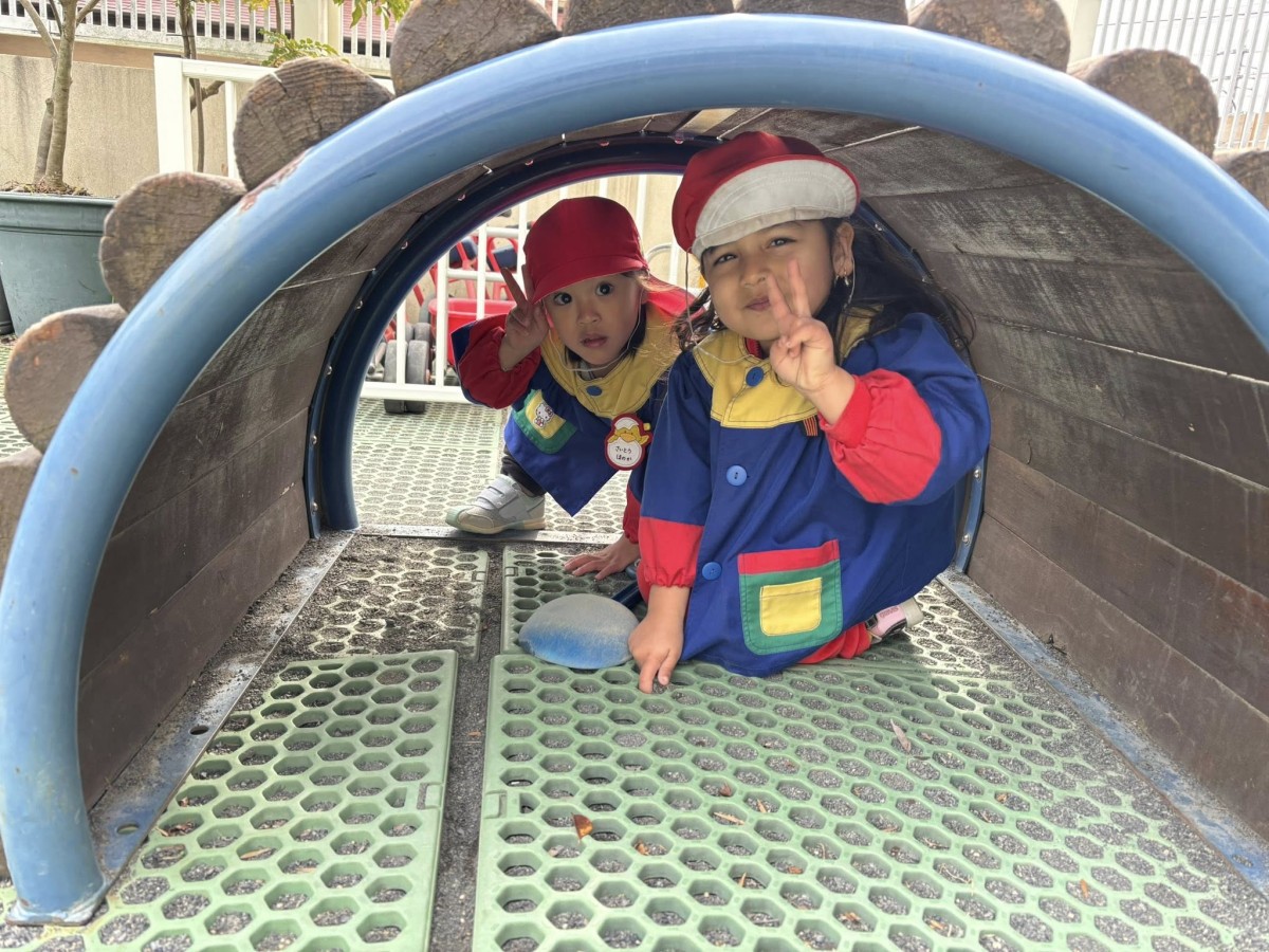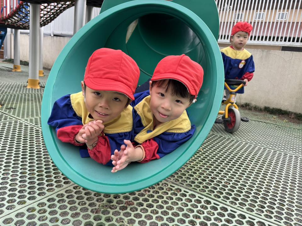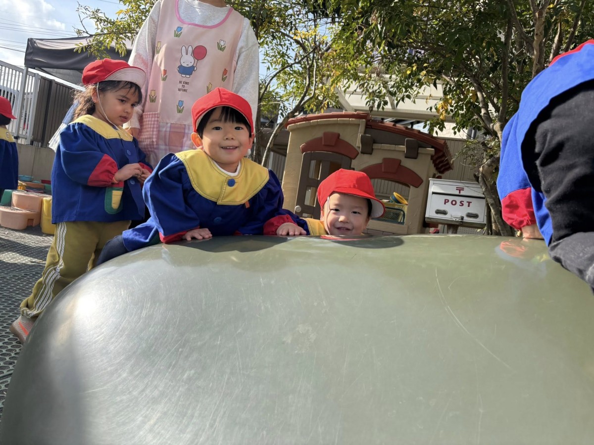| 今日は園庭で遊びました。太鼓橋の下に潜って遊ぶあか組さん。最初は2人だけだったのが「僕もいれて〜」と増えていき最終的には4人で潜っていました。「ぎゅうぎゅうだねぇ〜」と笑う姿が可愛らしかったです。 |