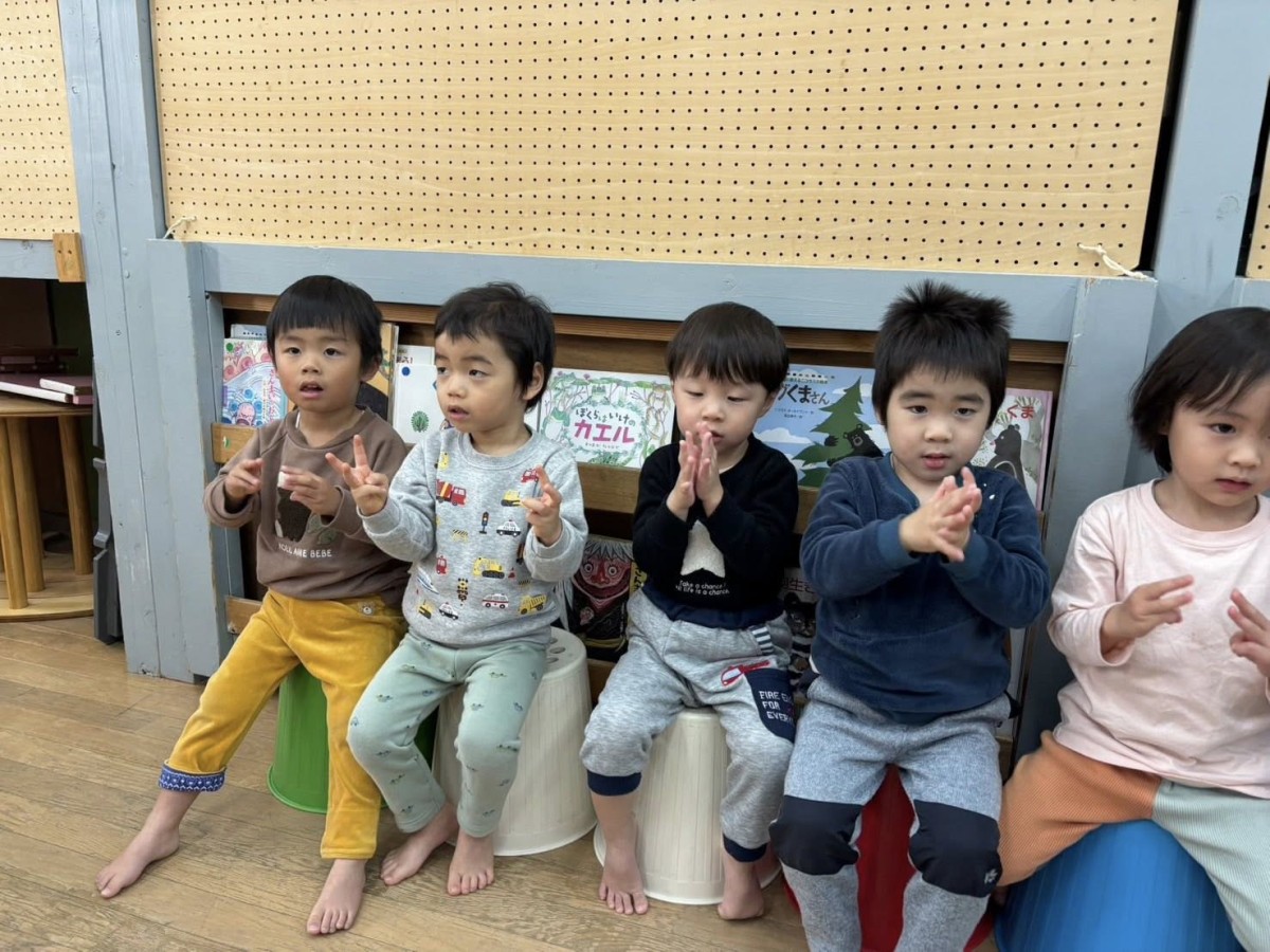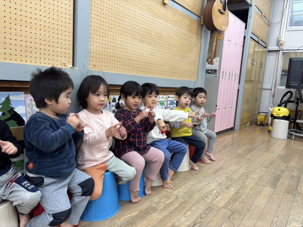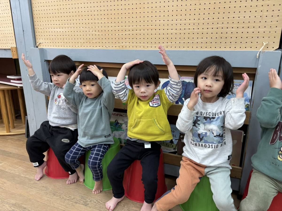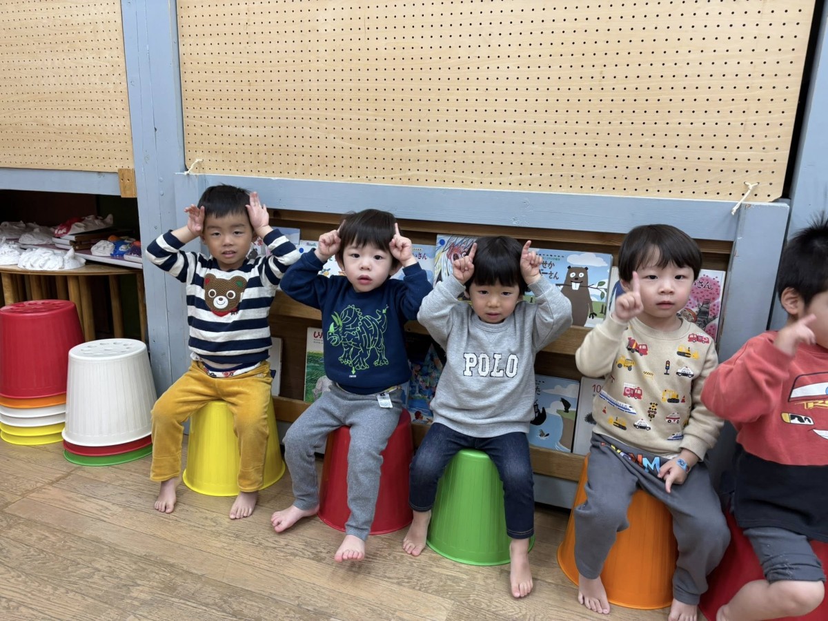 今日はリトミックがあり、「おおがたバス」「かなづちトントン」の手遊びや「おめんです」の読み聞かせに参加しました。特に「かなづちトントン」では、みんな1、2、3を指で作るのが難しそうでしたが、頑張って作って楽しんでいました。また、ピアノの音に合わせて走ったり、止まったなどとても楽しそうにリトミックに取り組んでいました。その後は、園庭で遊びました。
