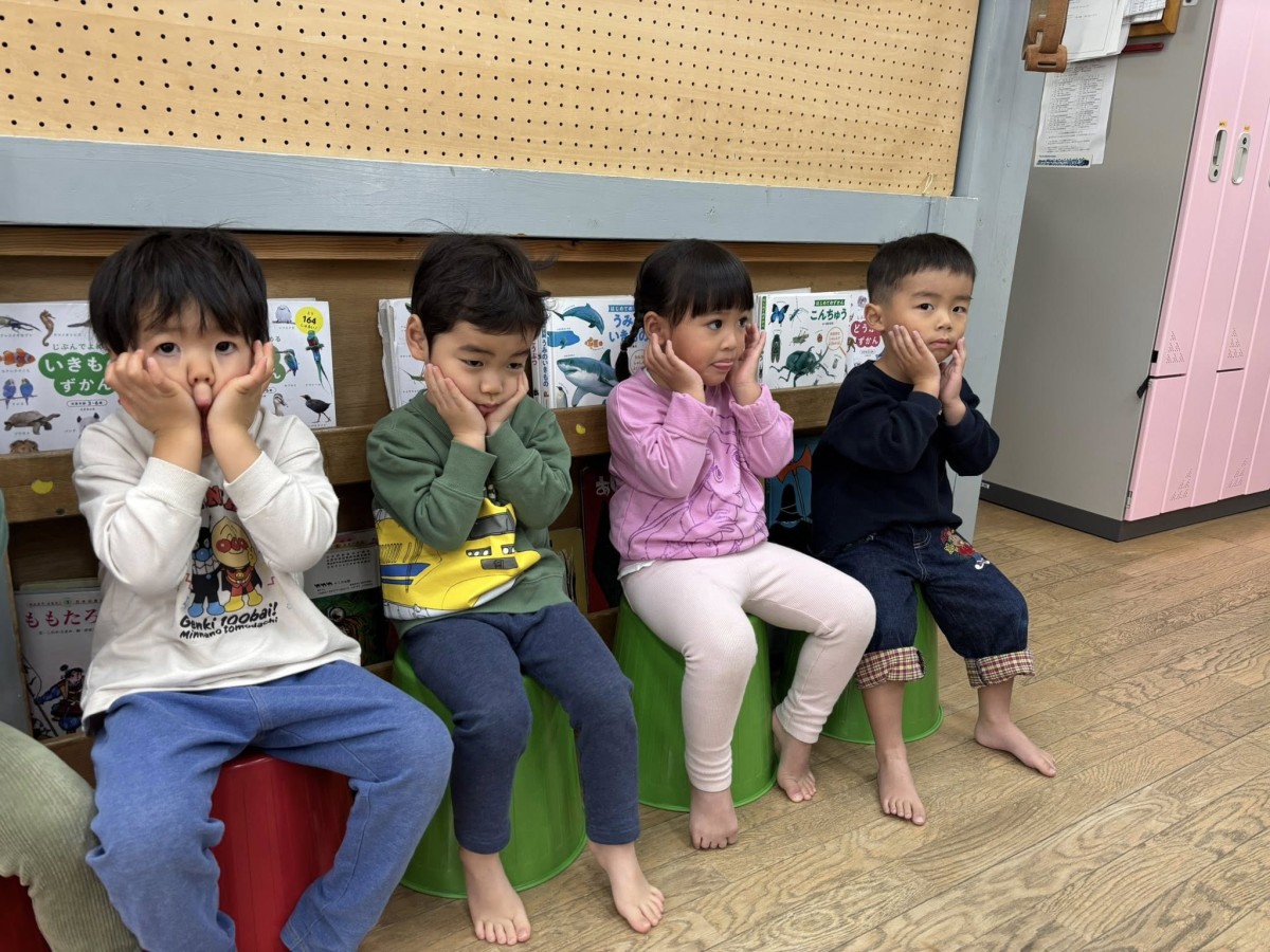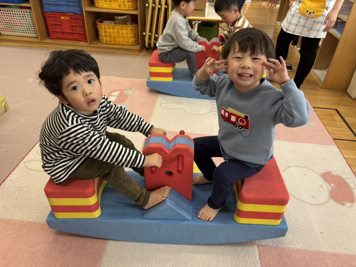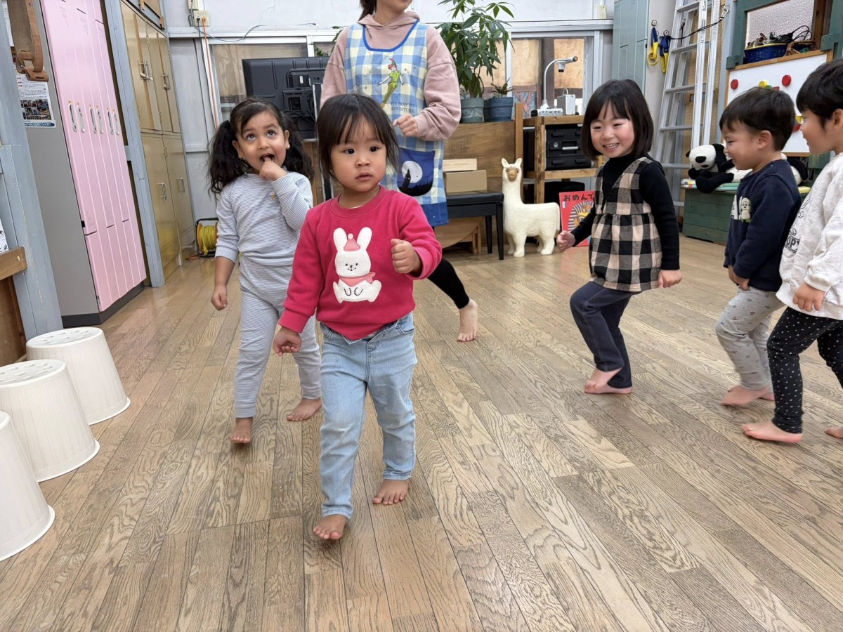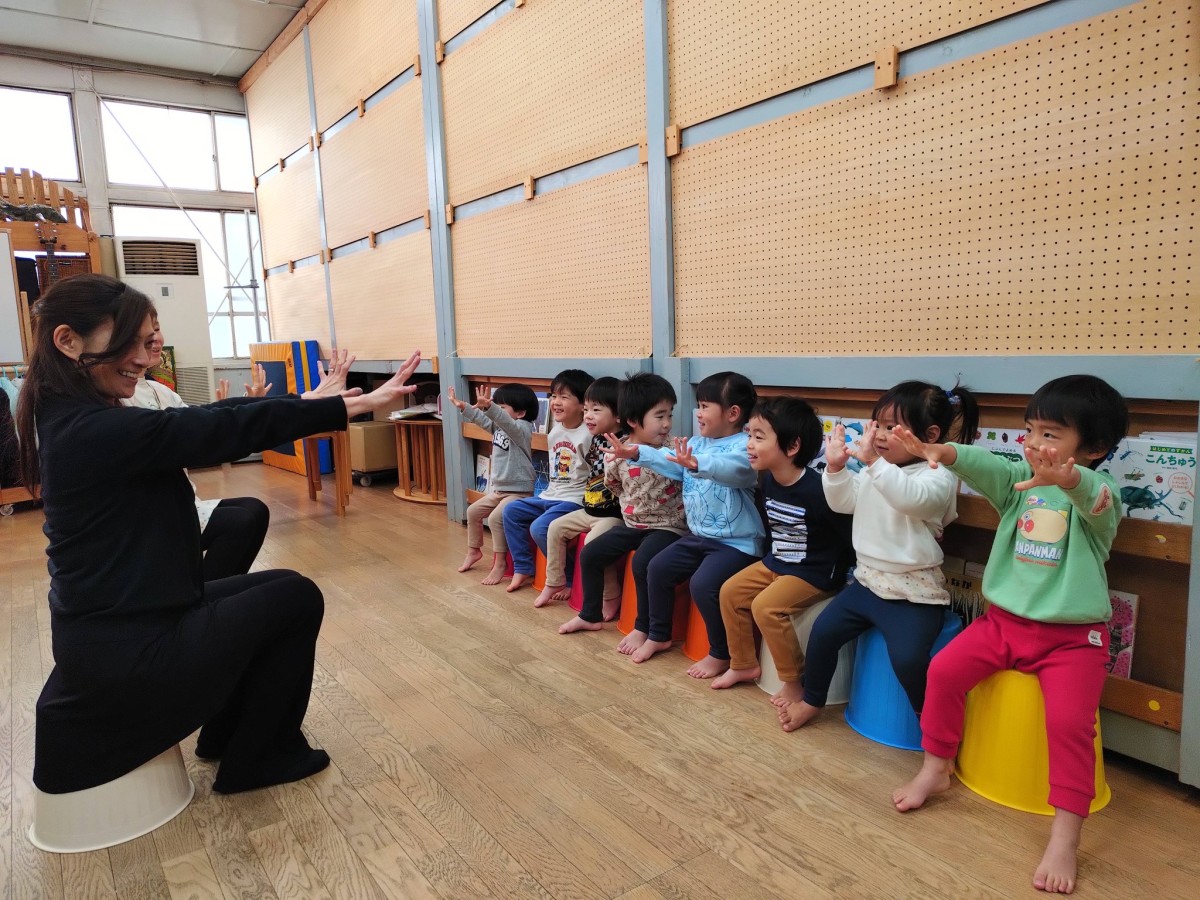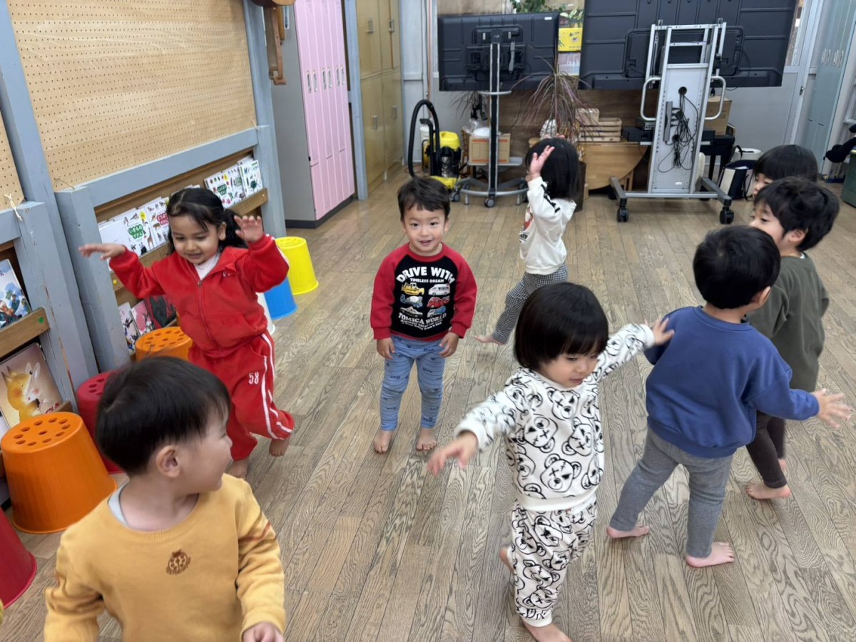 今日はリトミックがあり、「おおがたバス」「かなづちトントン」の手遊びや「おめんです」の読み聞かせに参加しました。特に「かなづちトントン」では、みんな1、2、3を指で作るのが難しそうでしたが、頑張って作って楽しんでいました。また、ピアノの音に合わせて走ったり、止まったなどとても楽しそうにリトミックに取り組んでいました。その後は、園庭で遊びました。