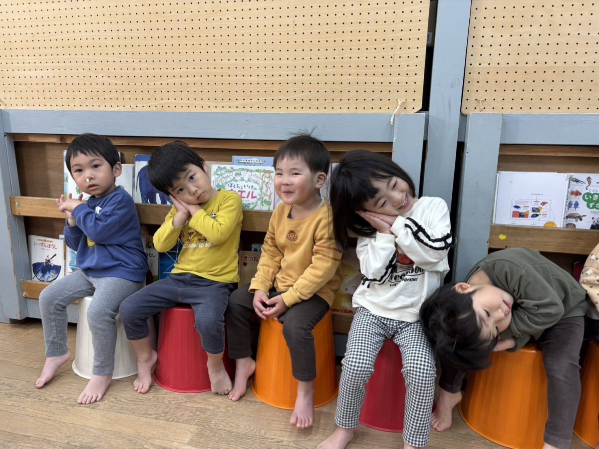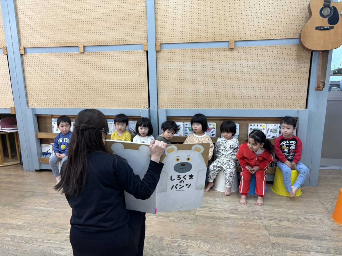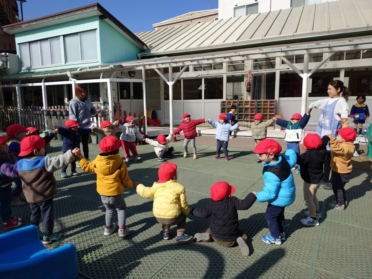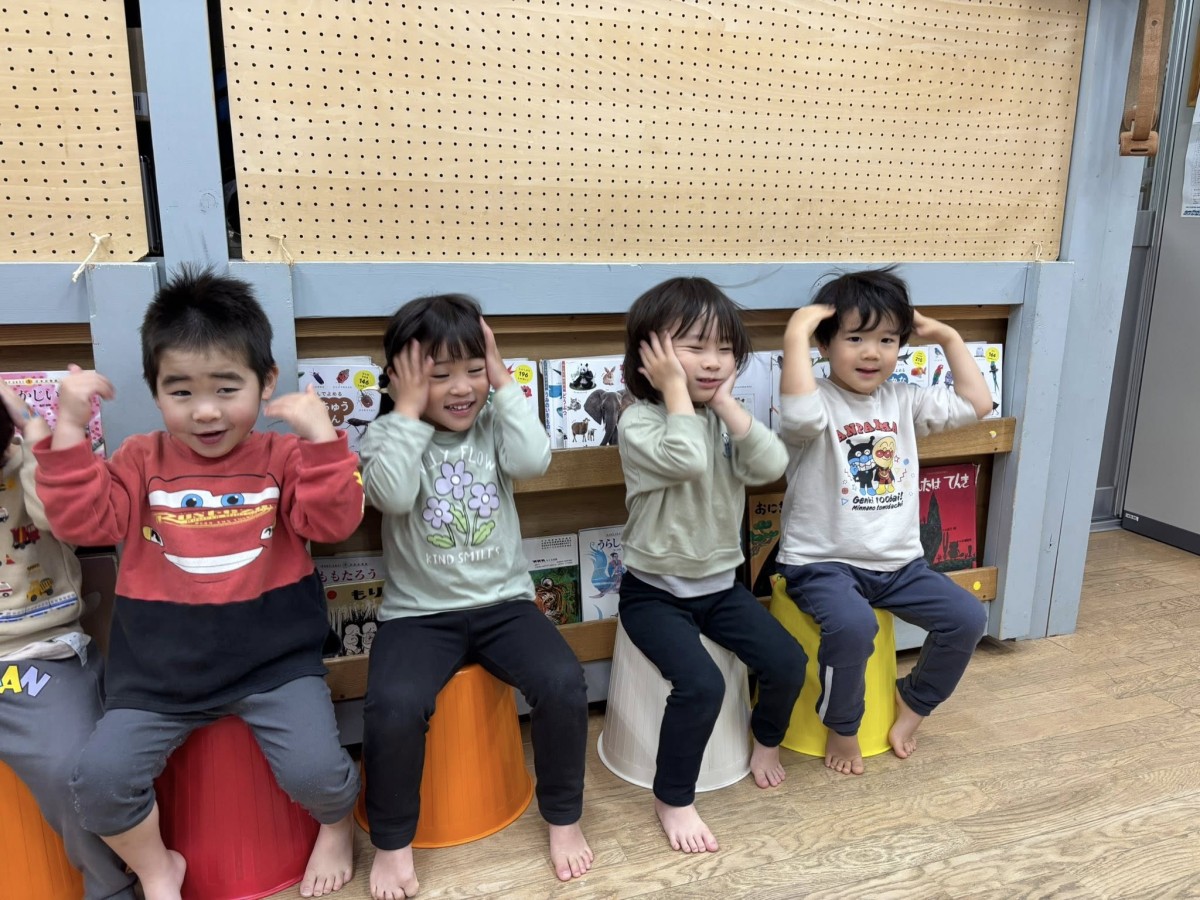 今日はリトミックがあり、「おおがたバス」「かなづちトントン」の手遊びや「おめんです」の読み聞かせに参加しました。特に「かなづちトントン」では、みんな1、2、3を指で作るのが難しそうでしたが、頑張って作って楽しんでいました。また、ピアノの音に合わせて走ったり、止まったなどとても楽しそうにリトミックに取り組んでいました。その後は、園庭で遊びました。