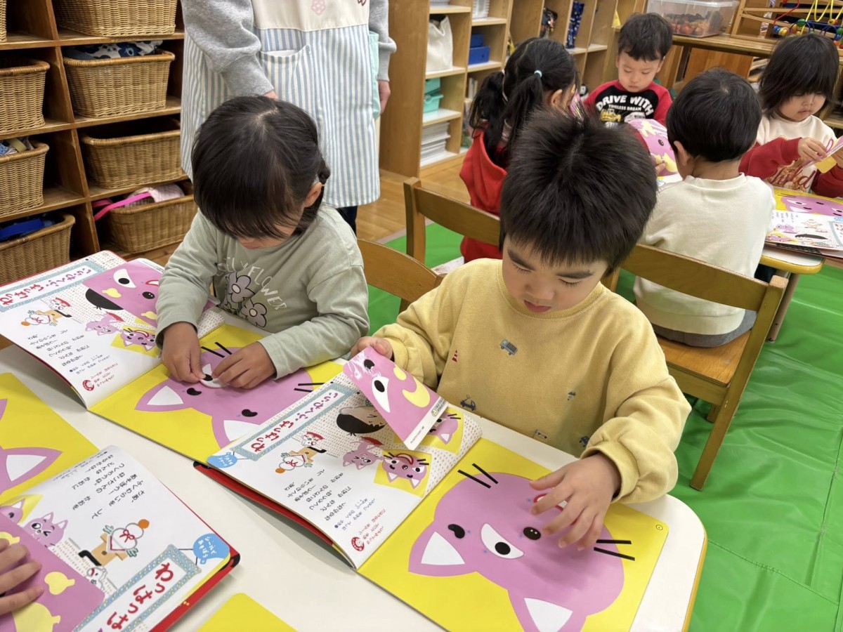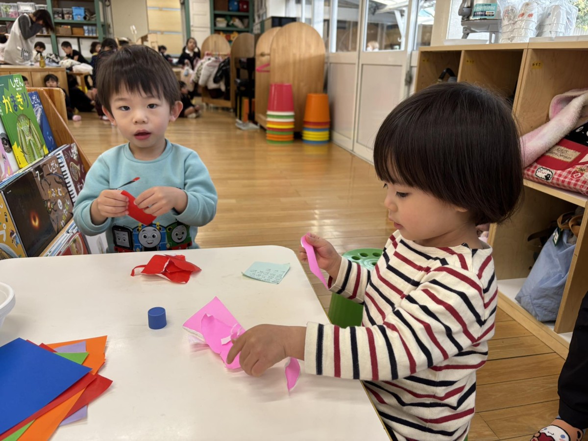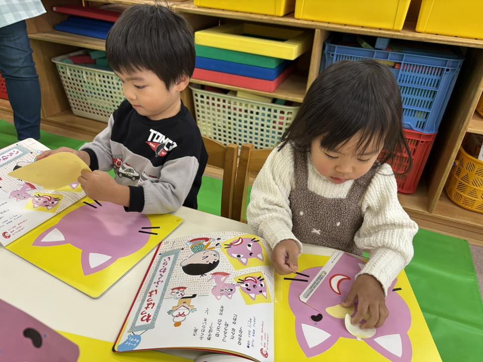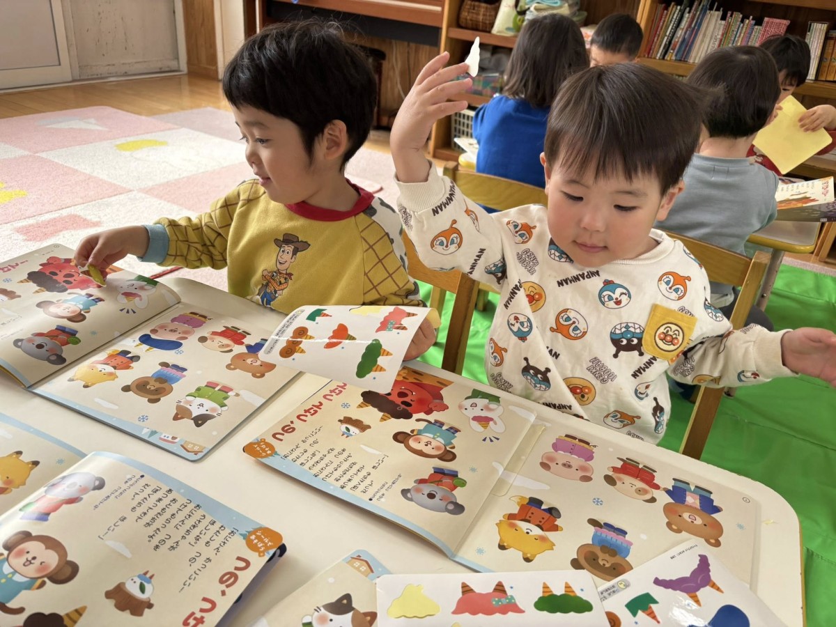 今日は月刊誌を見てシール貼りをした後に園庭で遊びました。シール貼りのページはオニの角を動物に貼っていくもので「どれにしようなぁ」「これかっこいいよ」と言いながら楽しく貼る事ができました♪園庭では「橋やりたい」「滑り台やりたい」と遊びたいものをアピールしてくれるお友だちが増えてきました。それぞれお気に入りの遊びがあるようです。